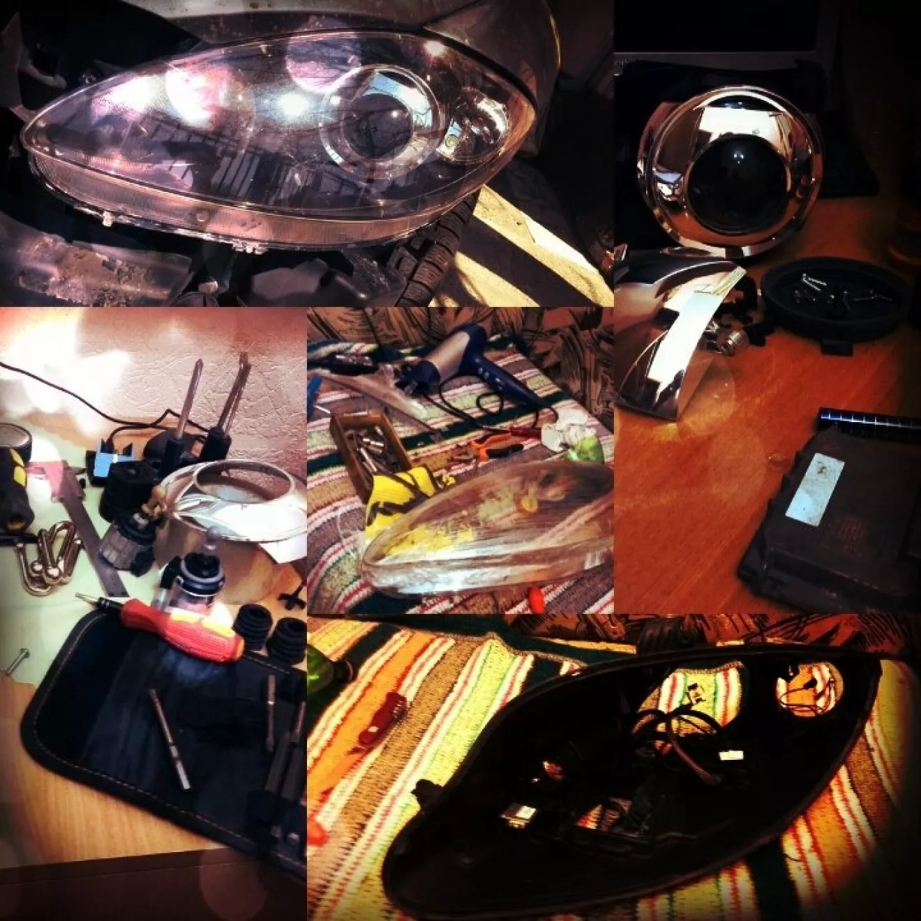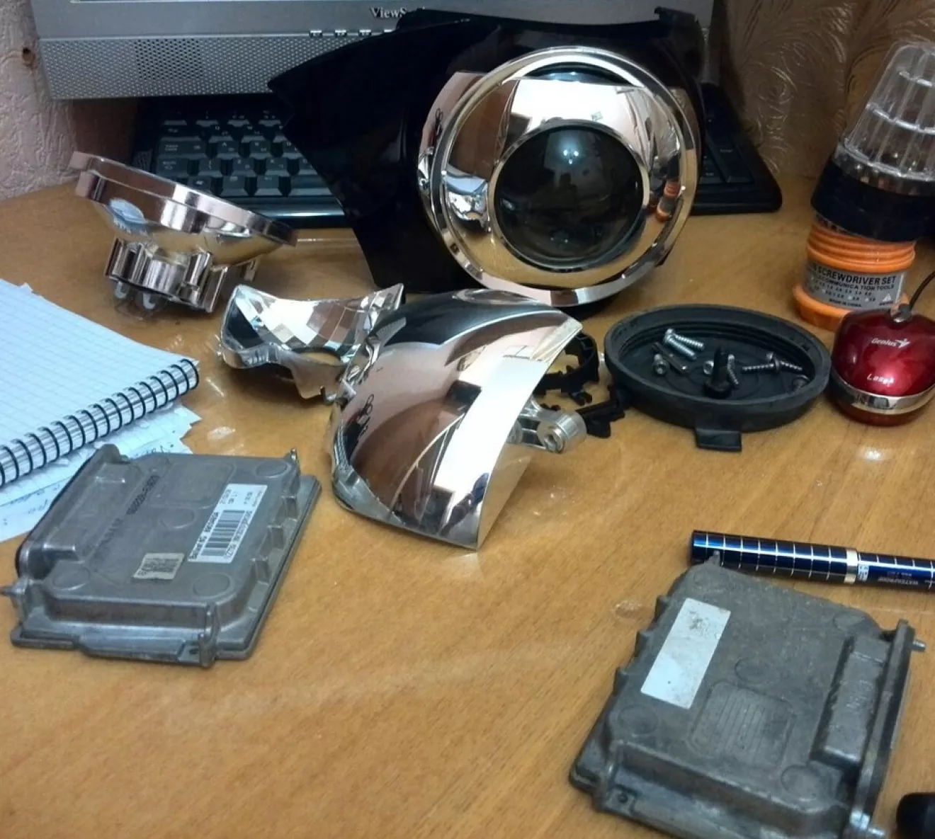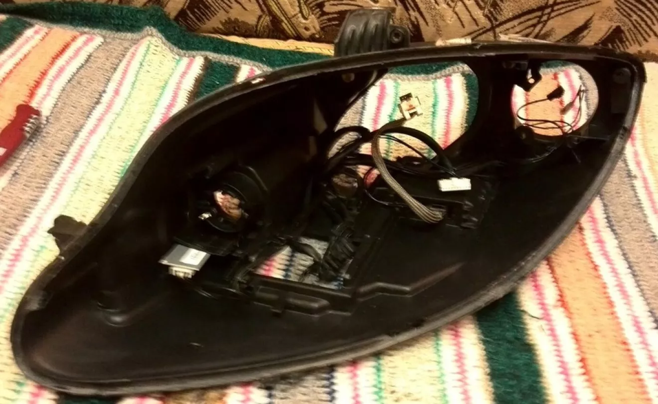 После чего открывается доступ к линзе, и всему "мясу", скручиваем все навесное, сложностей нет, главное все нежно и аккуратно, поскольку есть риск поцарапать хромовое напыление(очень нежное), и сам пластик в фаре очень хрупкий. Затем протераем все подготовленные "органы", ставим подготовленный герметик в теплую водичку, дабы размяк, что значительно облегчает работу. Скручиваем, наносим герметик в прочищенную канавку, прижимаем стекло (оставляем до утра в гараже), (утром) ставим фару, включаем зажигание, и все работает.
