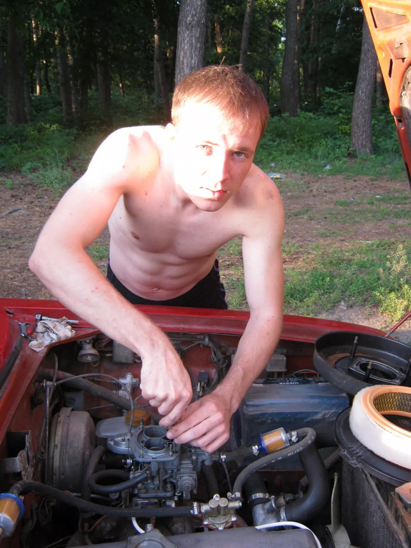 Доехали до места без происшествий абсолютно. Покупавшись, решили проехать чуток дальше и найти местечко, чтобы ополоснуть машинку немного… и тут началось самое интересное. Она завелась нормально. Начал трогаться. выехал на дорогу и медленно переваливаясь через песчаные холмики едем себе, слушая музыку. Как вдруг машина на подъемчике тупо глохнет! О, нет! Подумал я про себя… Неужели старая беда с бензонасосом. Стали мы конкретно, посередине дороги и лишь мастер вождения 80 лвл смог бы нас объехать между двумя соснами по другой выкатанной дорожке.