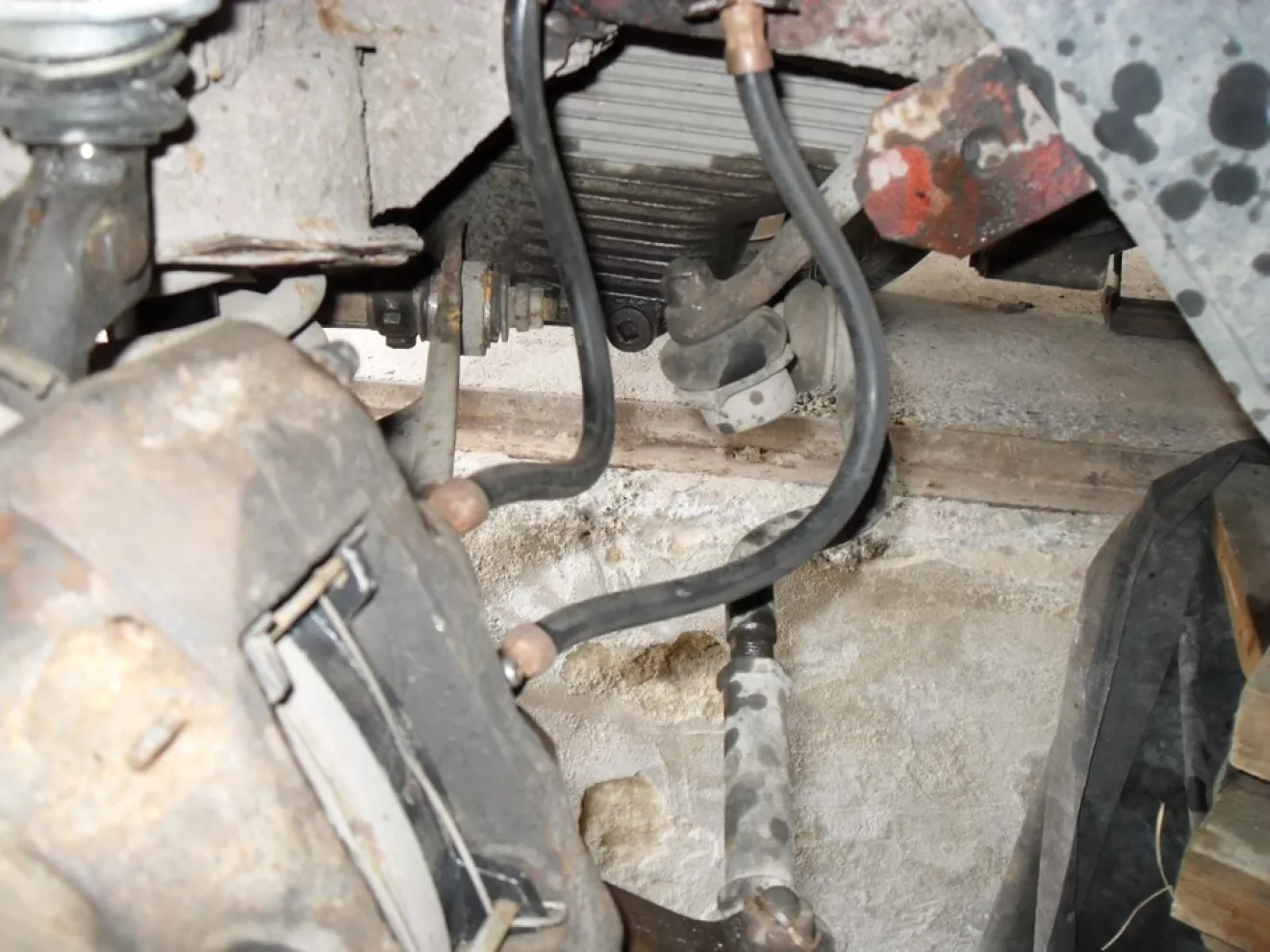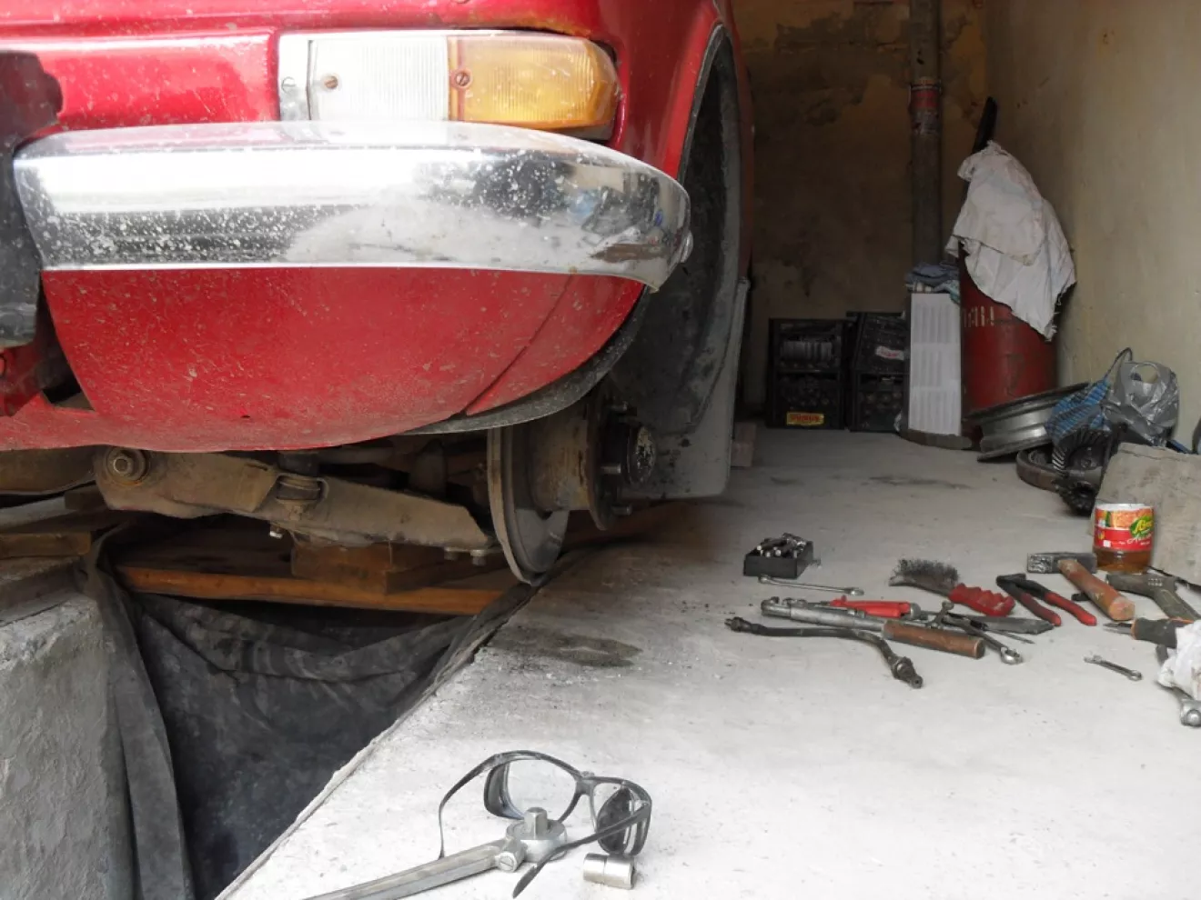 Приехал в гараж, Масик еще спал :) Проснулся от того, что оказался без двух передних колес и посажен на брюхо… Так удобнее копаться в подвеске и как то пространства побольше. Первым делом принялся реанимировать сломаный болт в нижнем рычаге, который крепит аммор. Выкрутить не получалось, пришлось высверливать. 5 мин и готово. Далее поставил на место новый аммор и принялся за тормозные шланги.