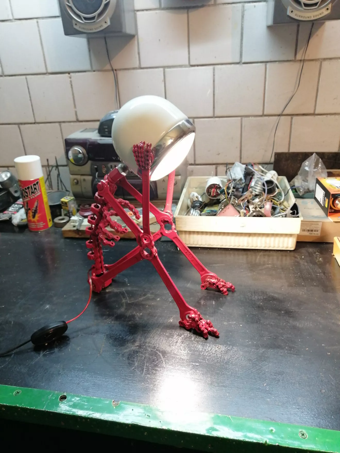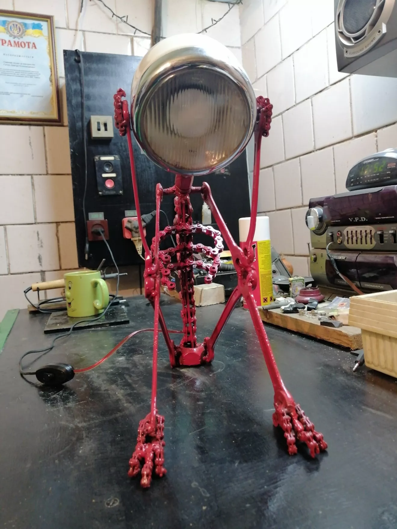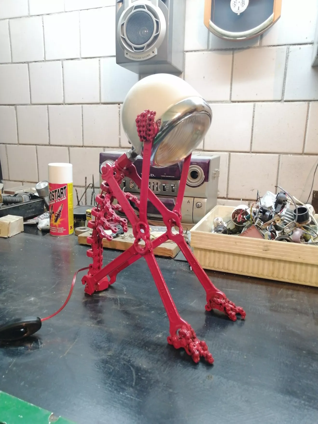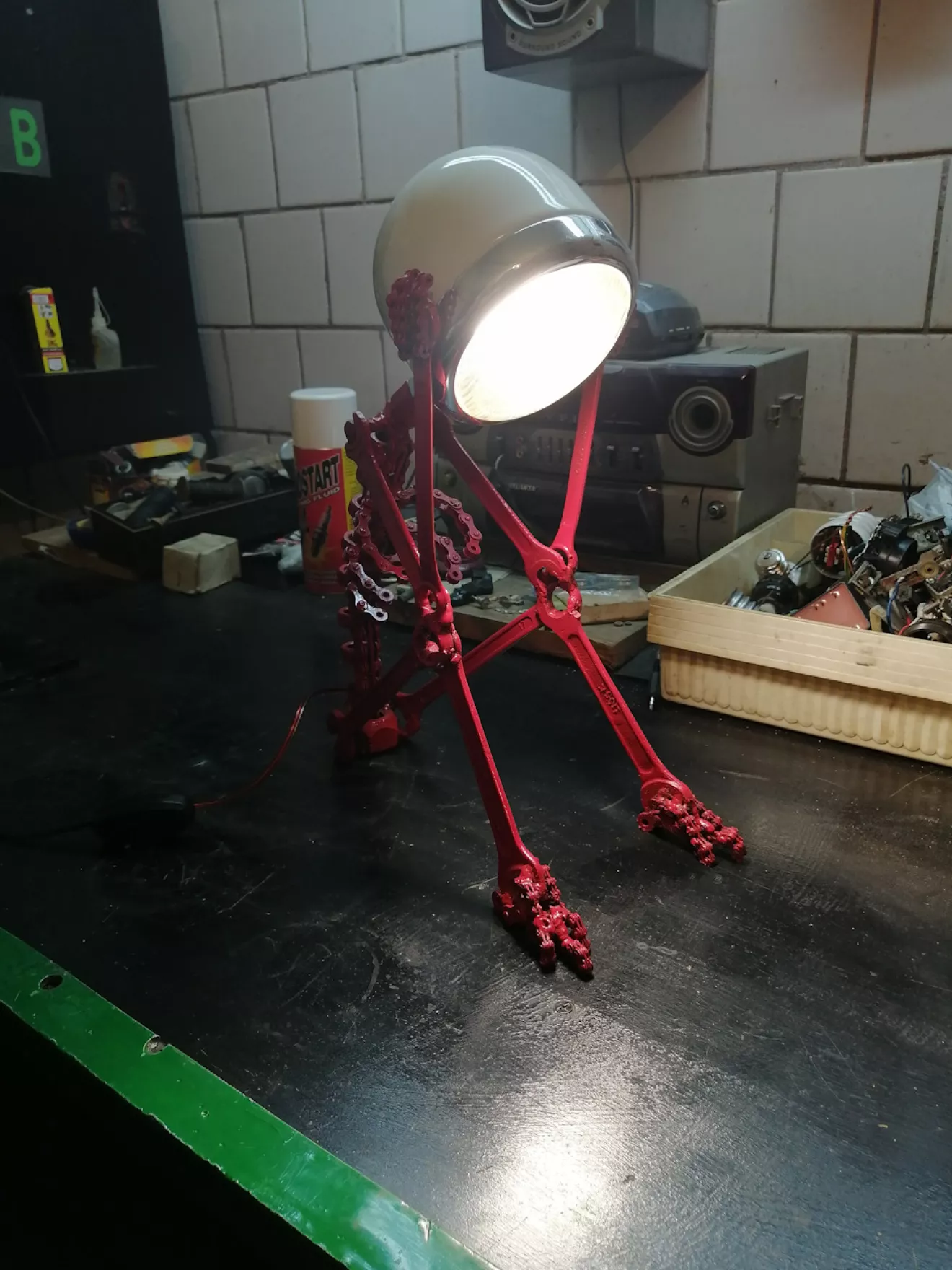 Из ненужных ключей, гаек, цепей и фары получилась вот такая лампа скелет. Идея взята из ютуба.