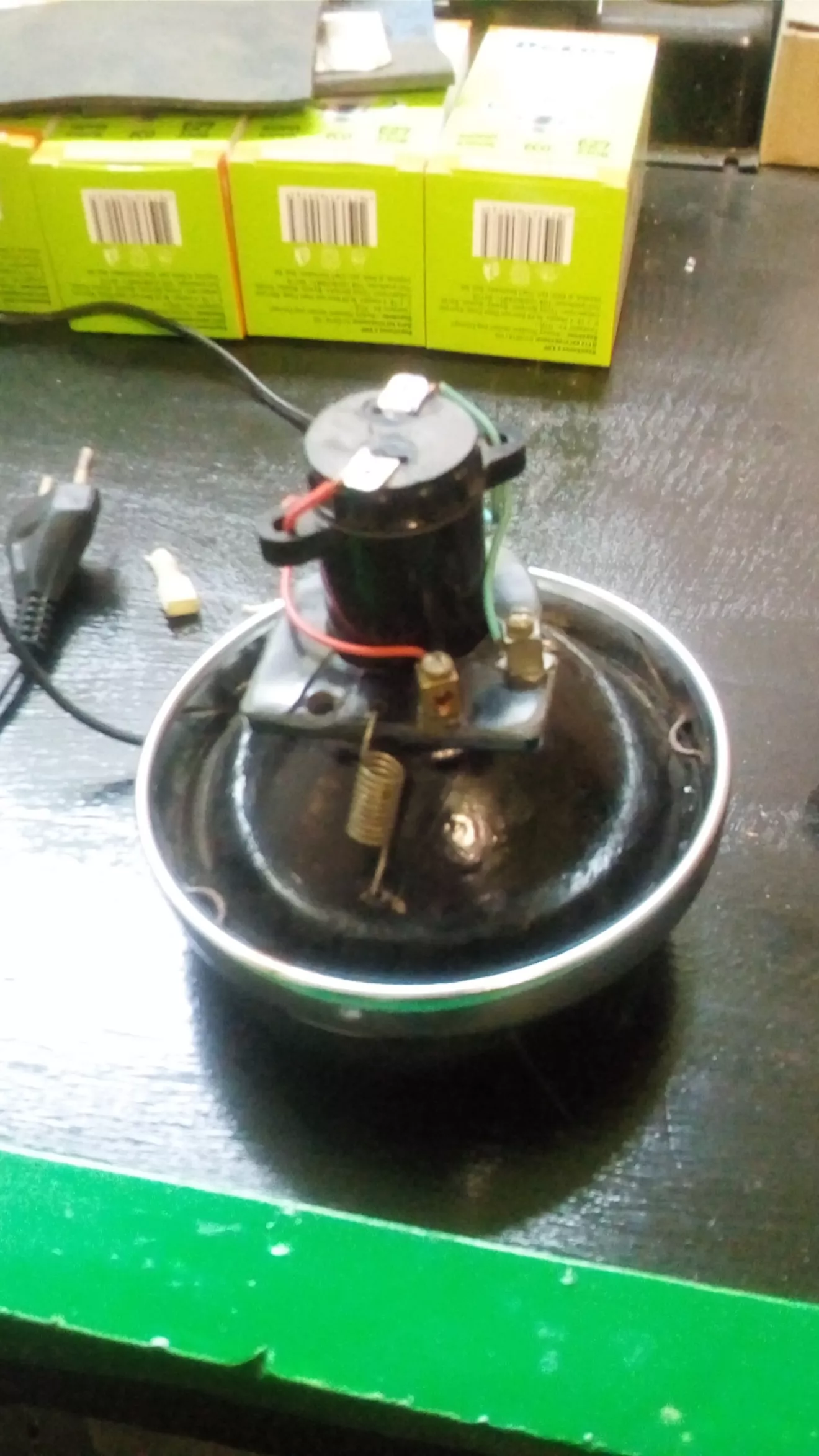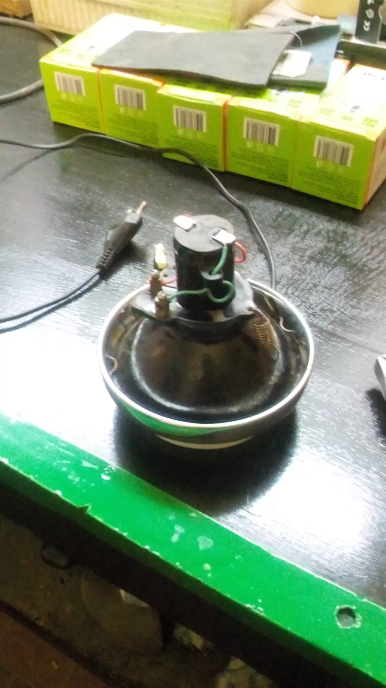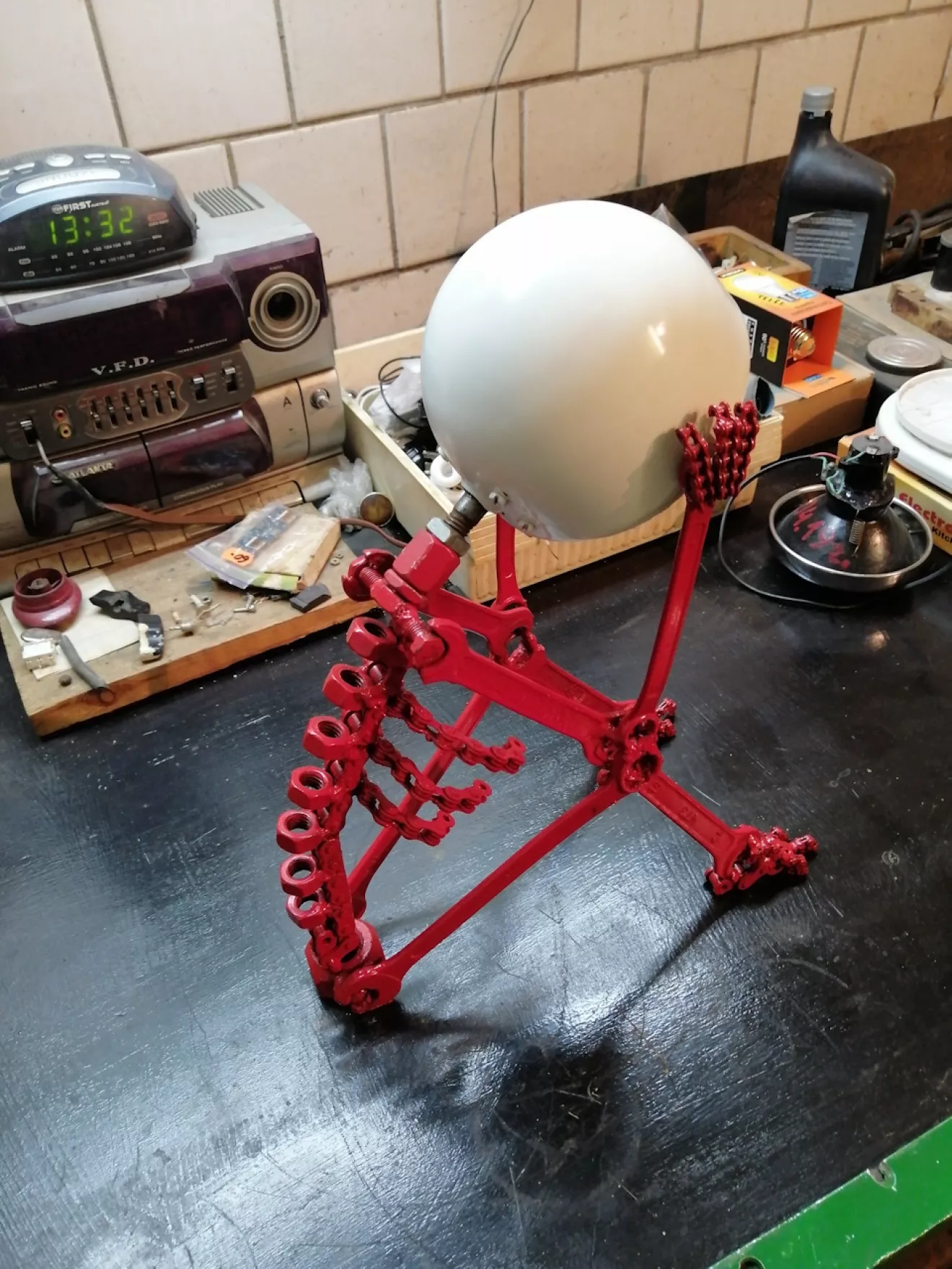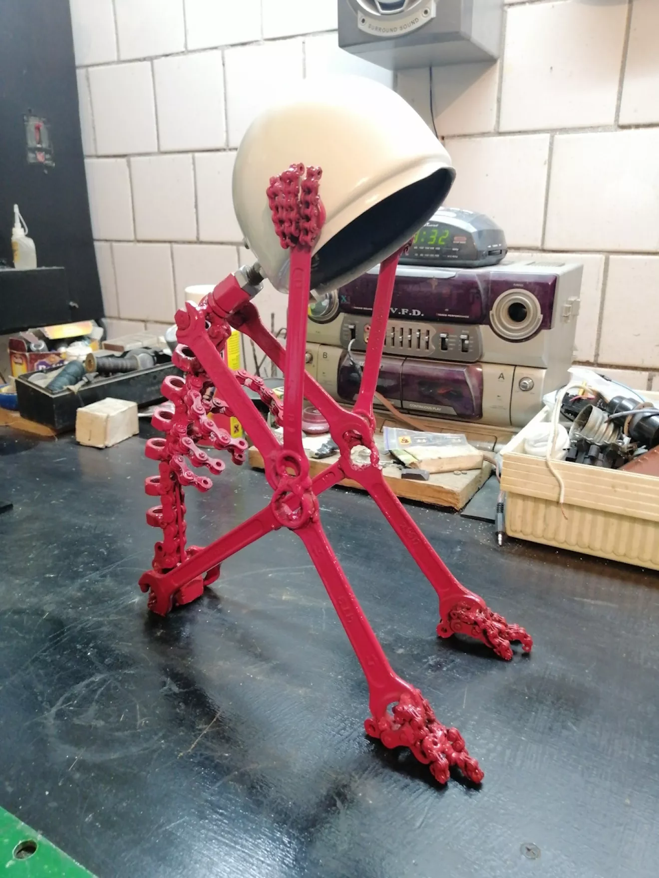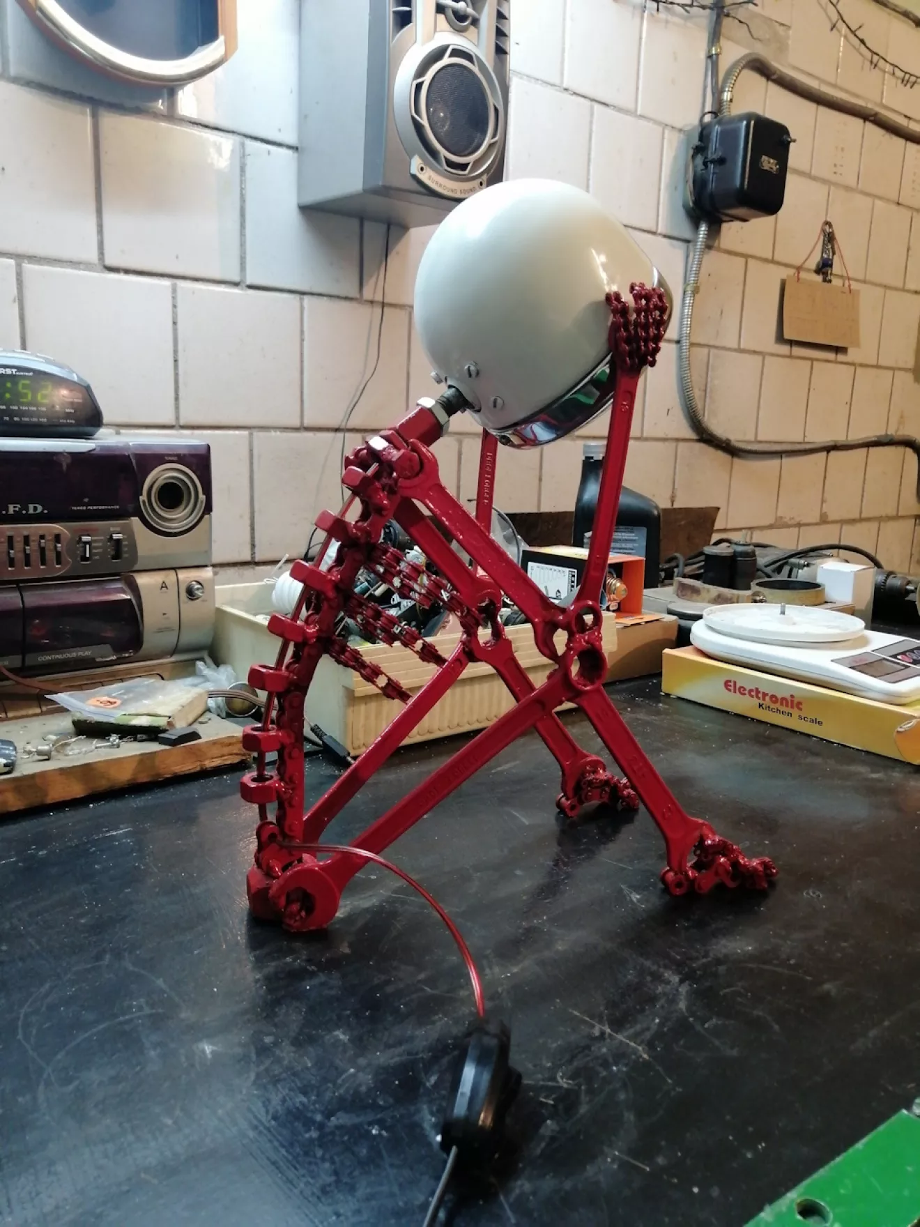 Из ненужных ключей, гаек, цепей и фары получилась вот такая лампа скелет. Идея взята из ютуба.
