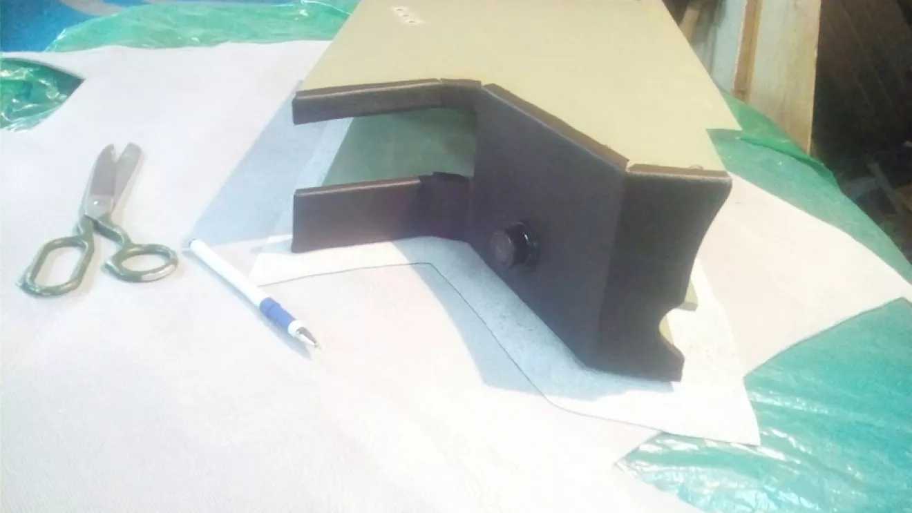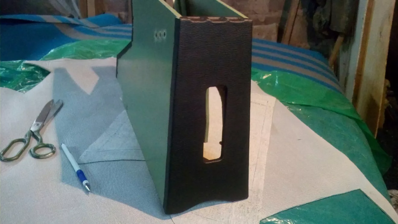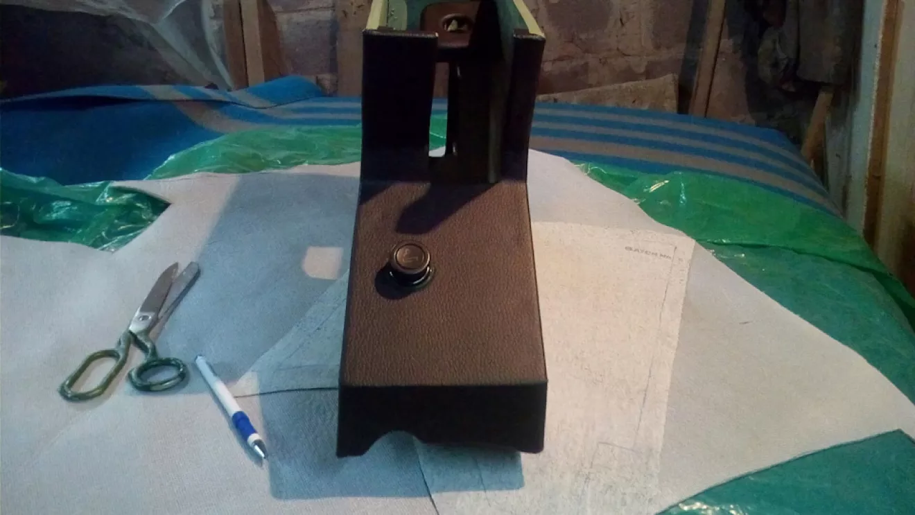 Ну вот дошли руки обклеить подлокотник, рассказывать особо нечего, скрутил из фанеры и сделал верхнюю крышку на завесиках