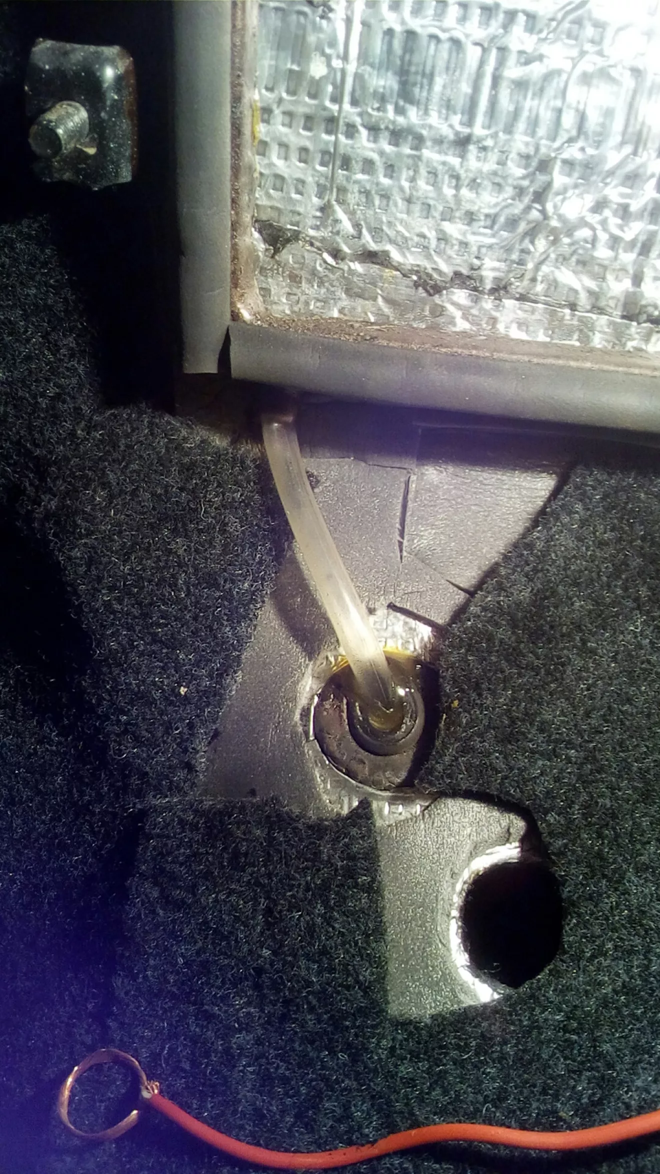6. Сделал отвод конденсата и возможной воды с воздухозаборника который за радиатором печки, для этого взял бензиноприемник москвичевского бака отрезал все лишнее чтоб получился кусечек трубки на пластинке и одел на неготрубочку для отвода воды, просверлил в корпусе воздухозаборника отверстие на 10 мм, и посадил на герметик эту конструкцию. Трубочку вывел в старое отверстие в днище для патрубка обратки печки.