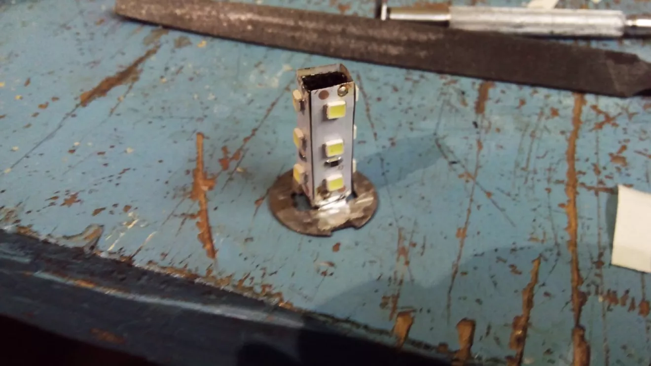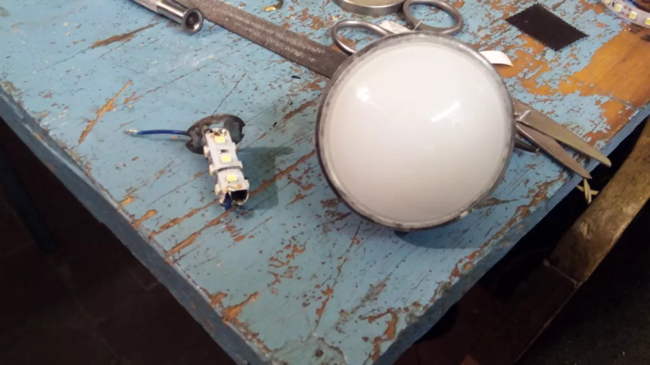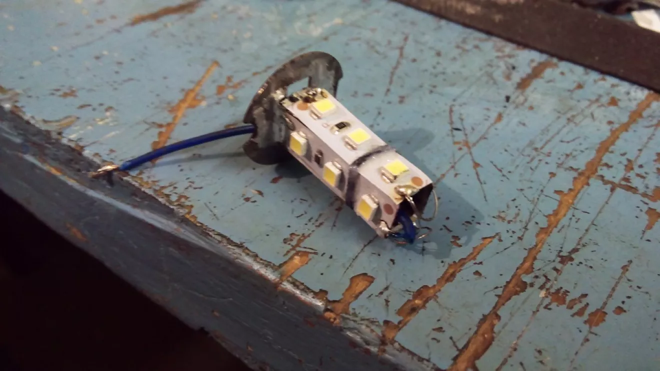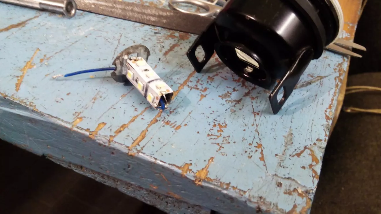 Роль фонарей заднего хода у меня будут выполнять переделанные противотуманки, в чем переделка?: просто срезал стекло, закрасил изнутри белой краской и вклеил назад. Пришло время установки и тут меня осенило, лампы Н3 55W, просто спалят краску внутри да и сильно ярко светят для заднего хода. Пошел в магаз купить лампы Н3 со светодиодами, оказалось одна такая лампа стоит 35грн. в итоге две =70грн. Было решено сделать их самому, всех затрат получилось 20грн. на светодиодную ленту, что потребовалось: