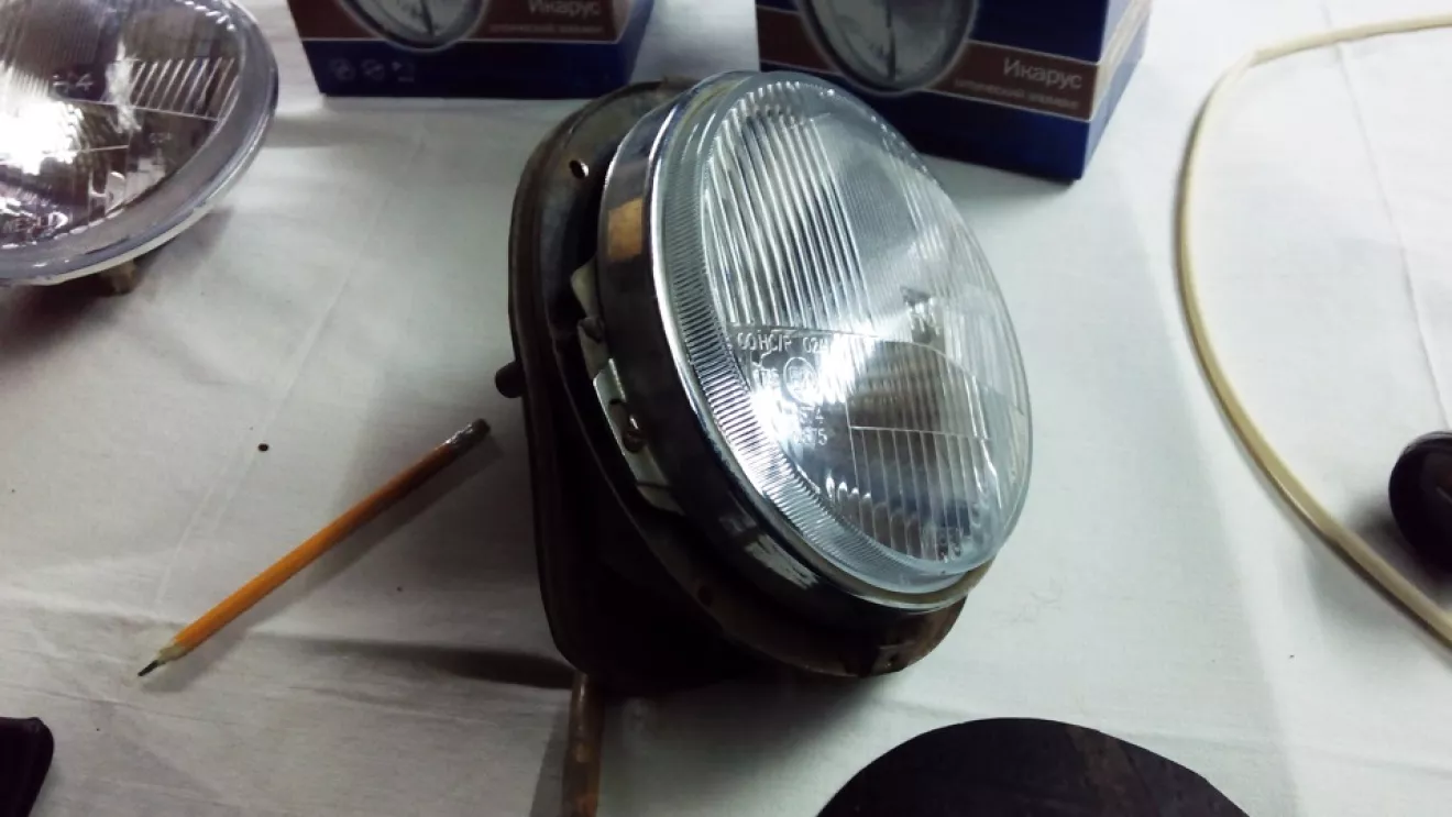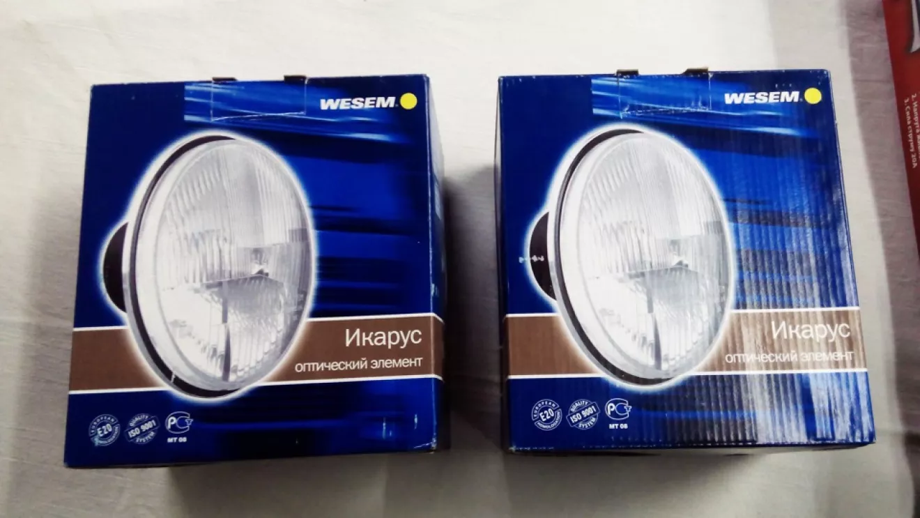 1. Главную оптику. Фары Wesem RE.12411 с габаритом, по отзывам неплохая оптика производство Польша. Но один прикол, вроде бы все подходит, но хром ободочек который на трех болтиках прижимает оптику к корпусу на 1 мм ее не прижал, проблема решена: взял кусок ЗИЛовской камеры (толщина резины 2мм) и по этому ободку вырезал типа прокладку, в итоге все стало как нужно, фото: