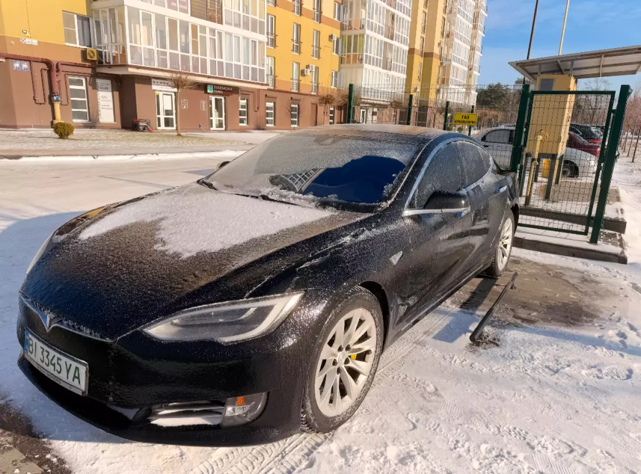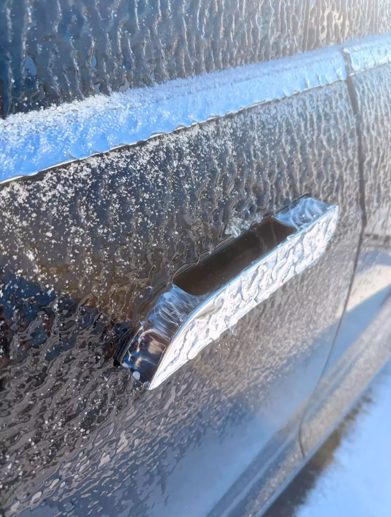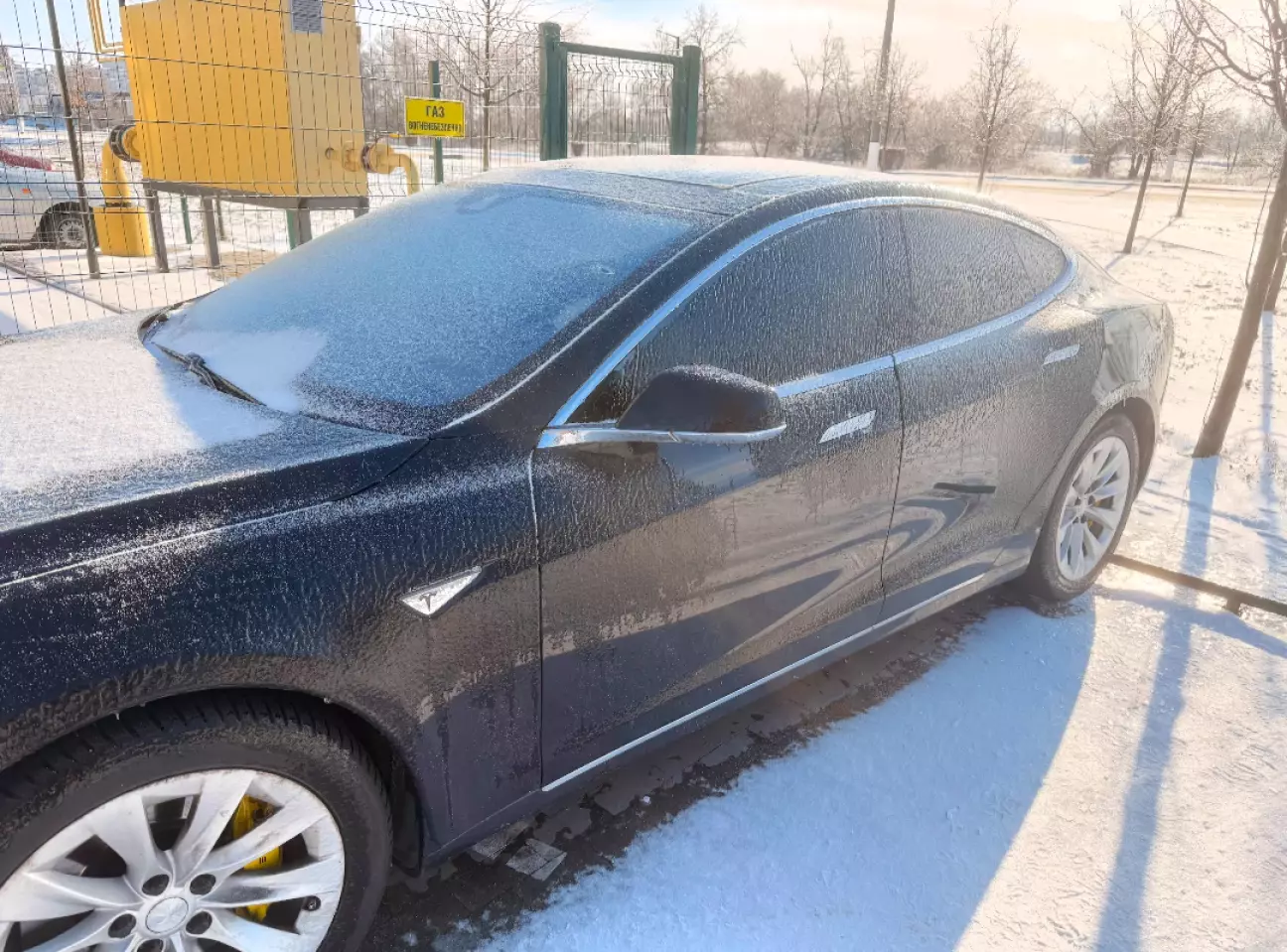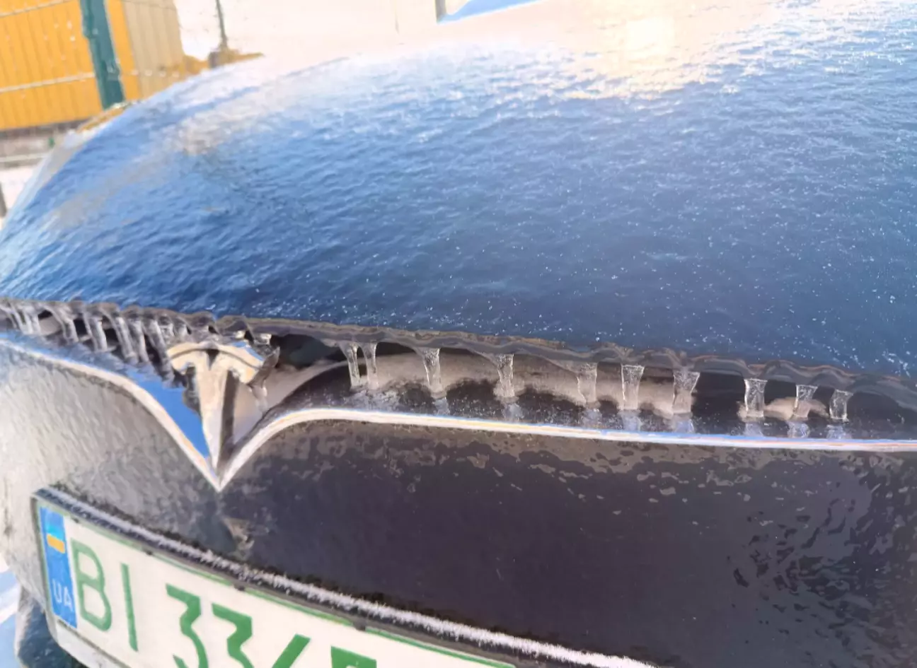 Цю зиму наврядчи можна звинувачувати у надмірній теплоті та відсутності снігу. Було все, і товста сніжна подушка, і морозяки тривалі, а ще декілька разів льодяний дощ. От один з них моя теслюха й застала під домом.