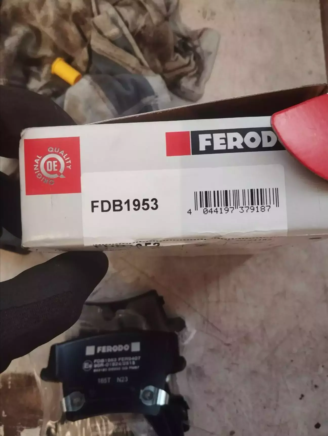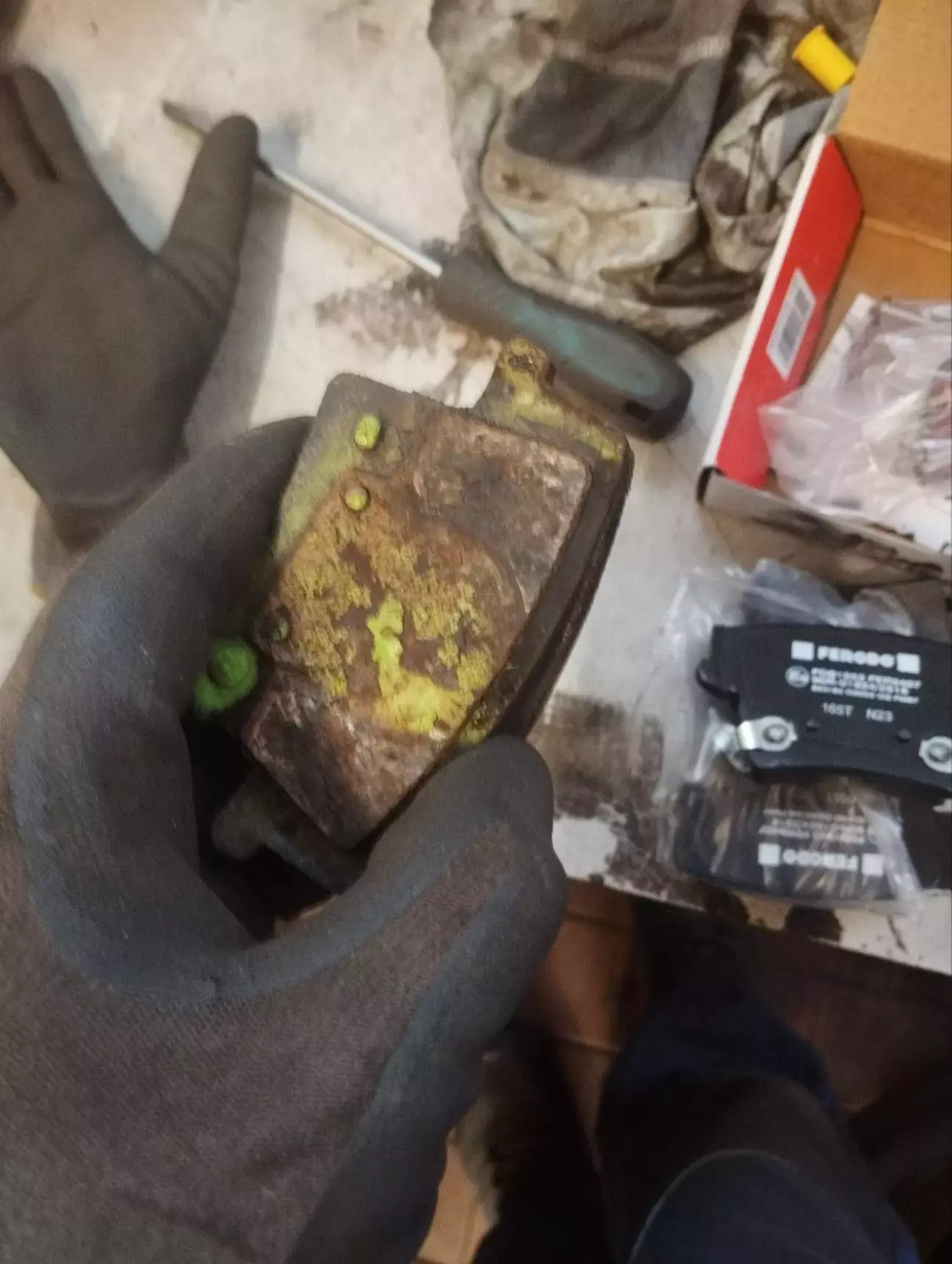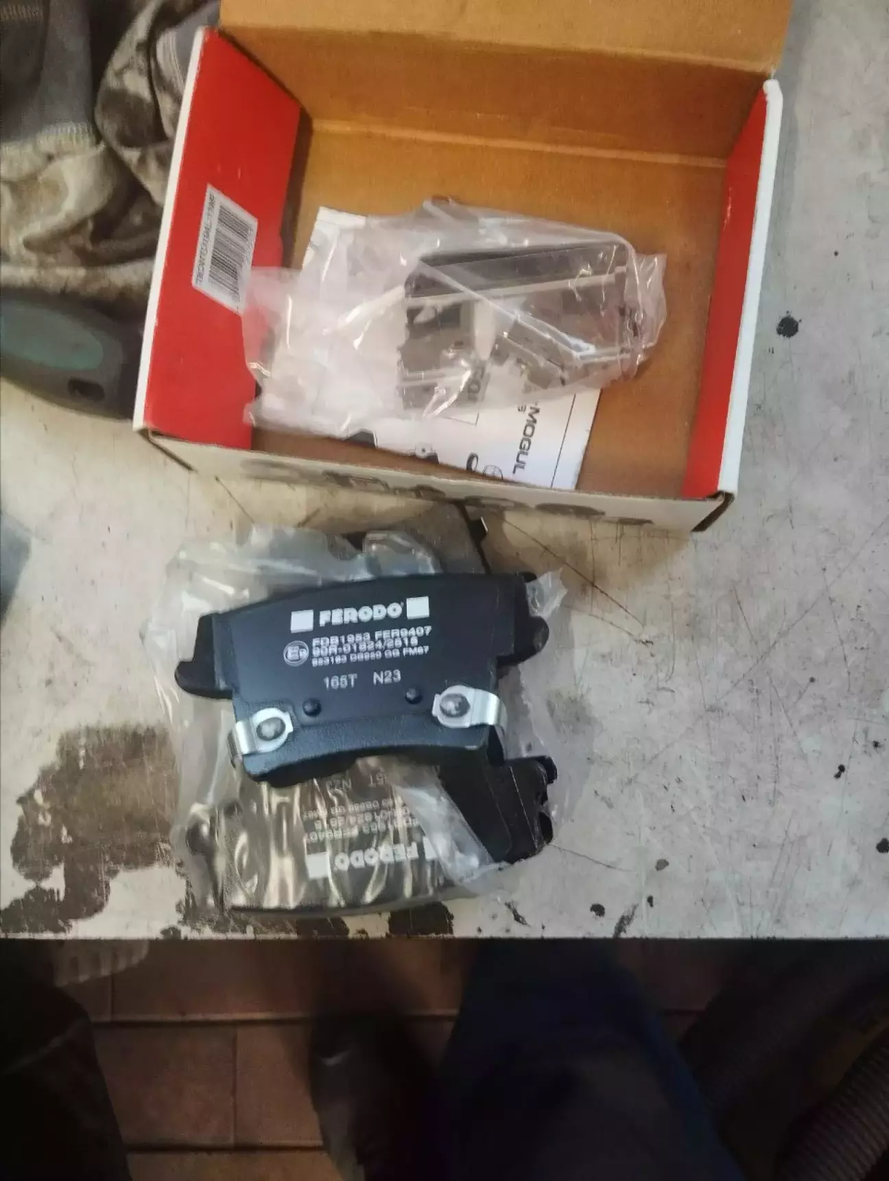 Самого фрікційного шару залишилось лише по 1.5 мм. А потім вже метал почав би терти по диску. З приємного - усі 4 колодки зношені рівненько, без перекосів. Так що самі супорти працюють як треба. Фото нового комплекту колодок, але є нюанс.