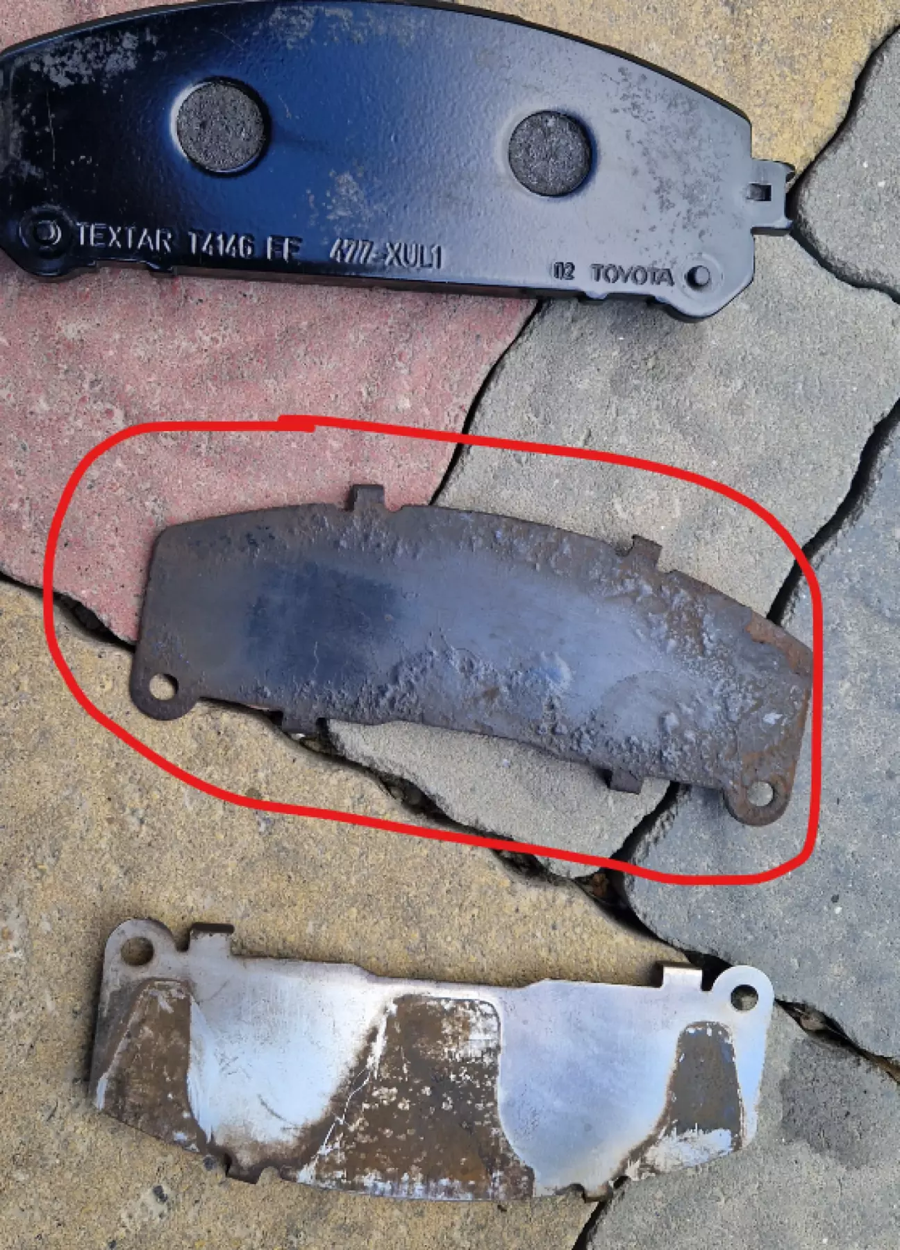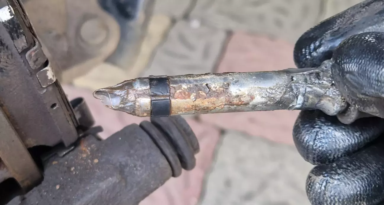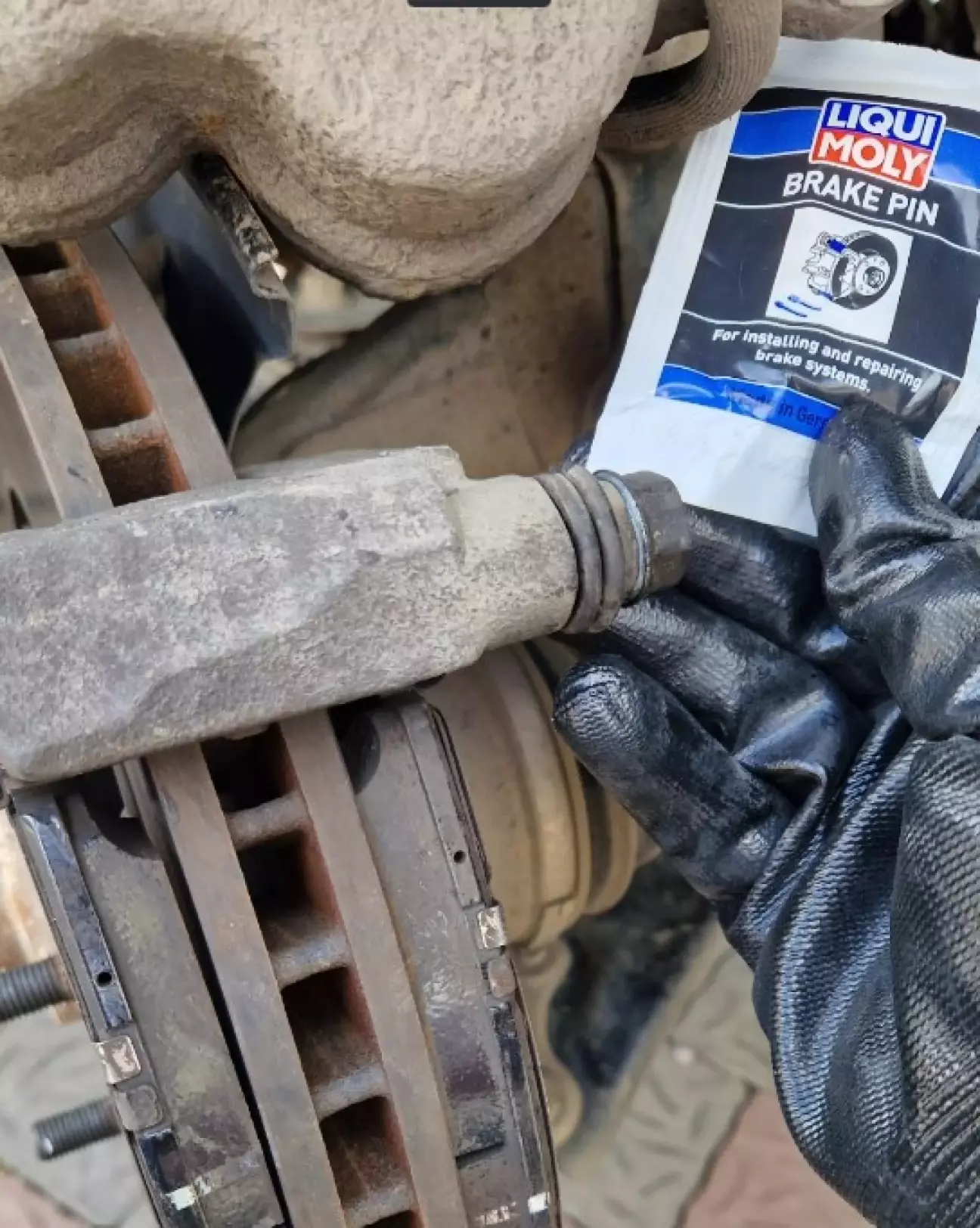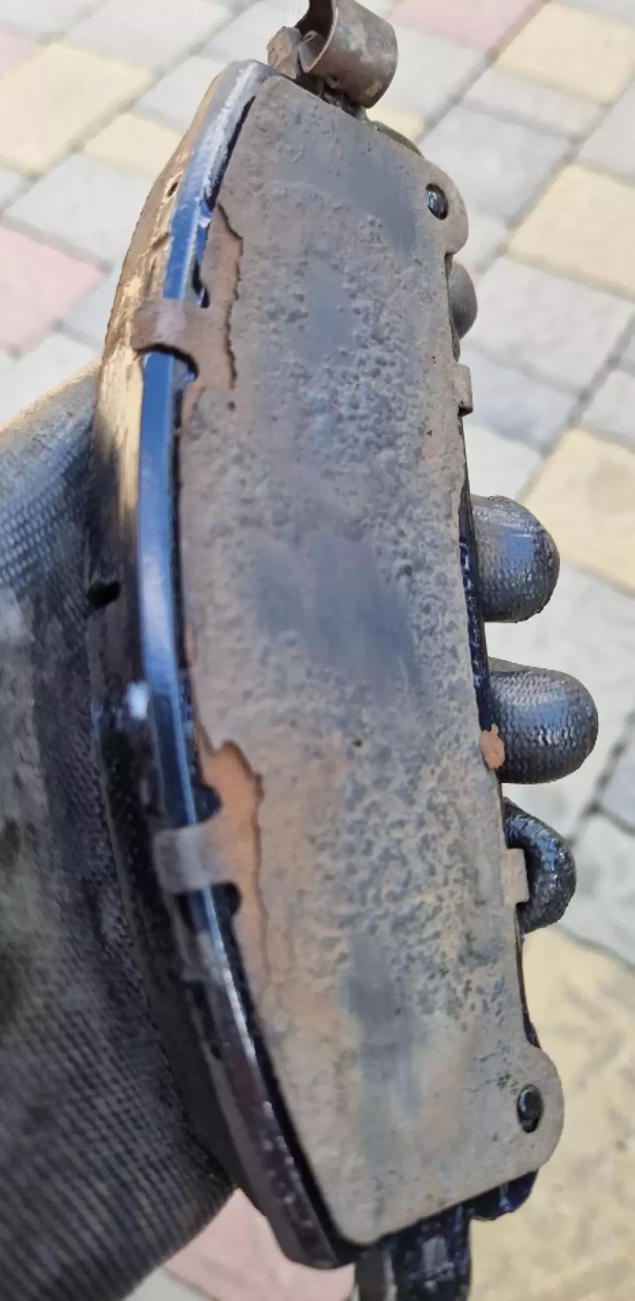 Коротко про історію: замінив в жовтні 2025 комплект оригінальних дисків і колодок при пробігу 104 тис. І почали вони люто скрипіти. Раз сім чи вісім офіційний дилер все там перебирав, рідину міняв, пильники комплект міняв, направляючі змащував і...все до дупи. Допоміг порадою сервісник з іншого (одеського) дилера і вказав, що колодки поставили "екологічні, де багато заліза в складі (і вони магнітяться)" (чорні на фото), а треба "нормальні" (сині на фото (не магнітяться)).