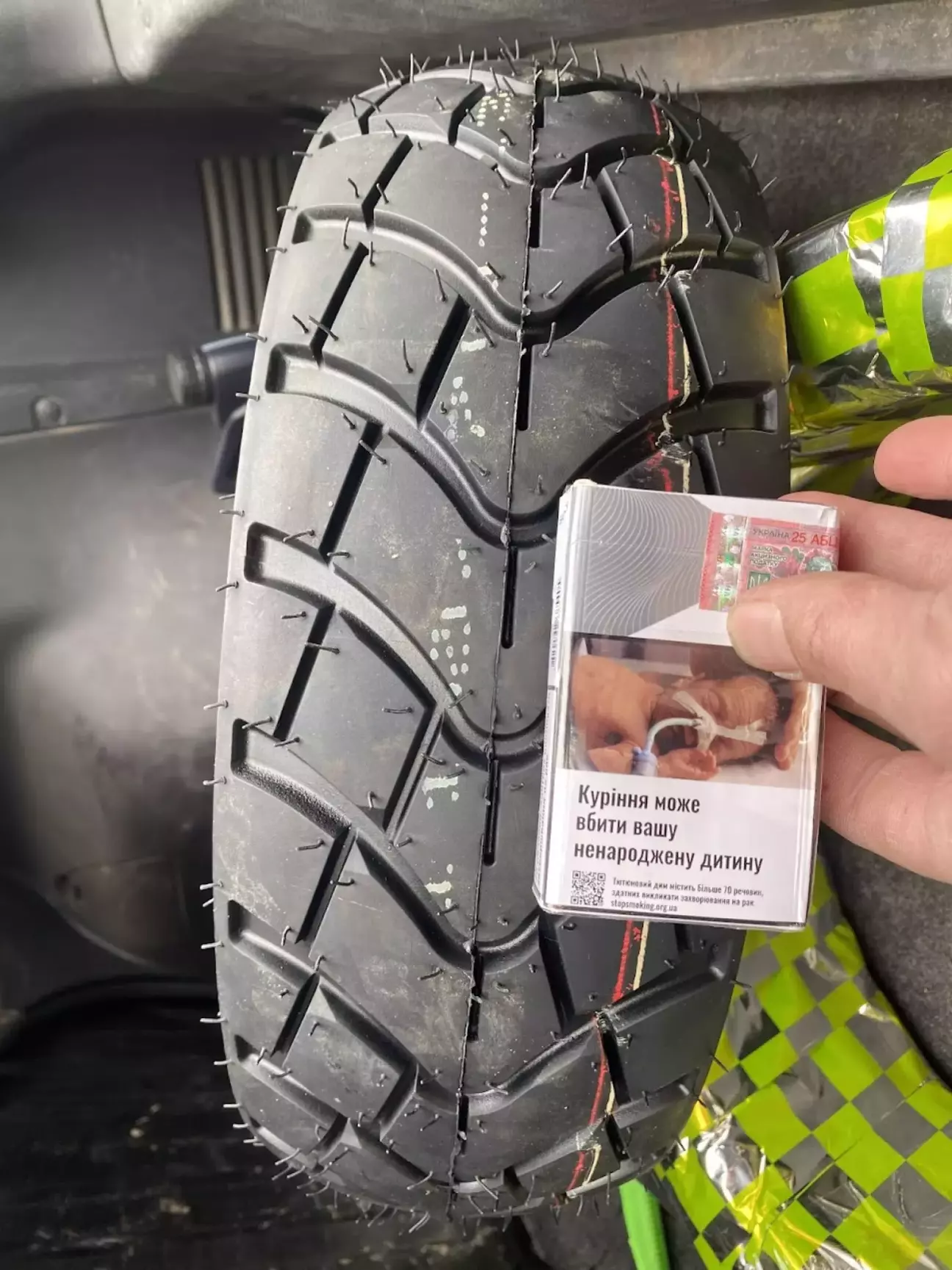 Потім вирішив, що раз уже розібрав — треба нову резину поставити. Бо стара вже бачила більше доріг, ніж деякі водії 😅