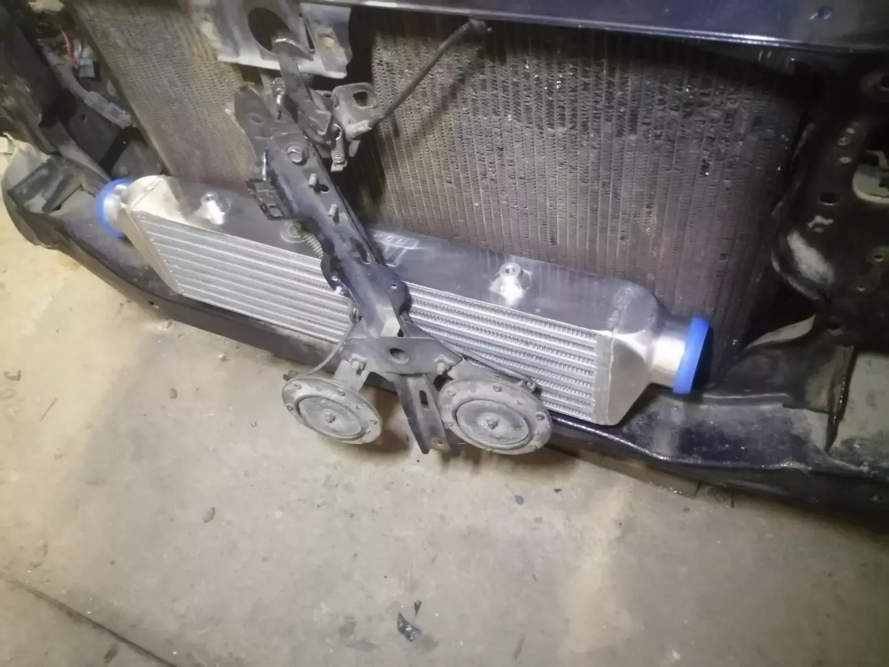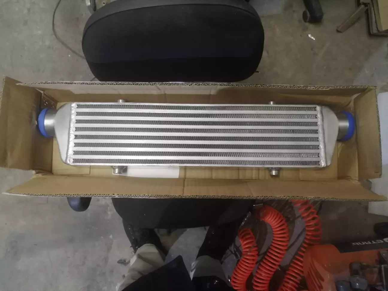 Двигун СА18DET від Nissan 200SX S13 використовує інтеркулер для охолодження системи впуску і в стоковому вигляді в автомобілі, в якому він знаходиться, він тримає своє місце в дуже сумнівному місці десь під крилом біля передніх коліс. Звісно, це не мій варіант з точки зору купи факторів, тому був придбаний універсальний кульок невідомої мені досі контори "TurboWorks" середніх розмірів в магазині, назву якого можна підрізати на скотці з упаковки з фото). Щоб і не вульгарно і по розмірах можна було його нормально впихнути. Досвід експлуатації показав, що співвідношення ціна-якість топ, ніяких нарікань в його бік наразі досі не маю.