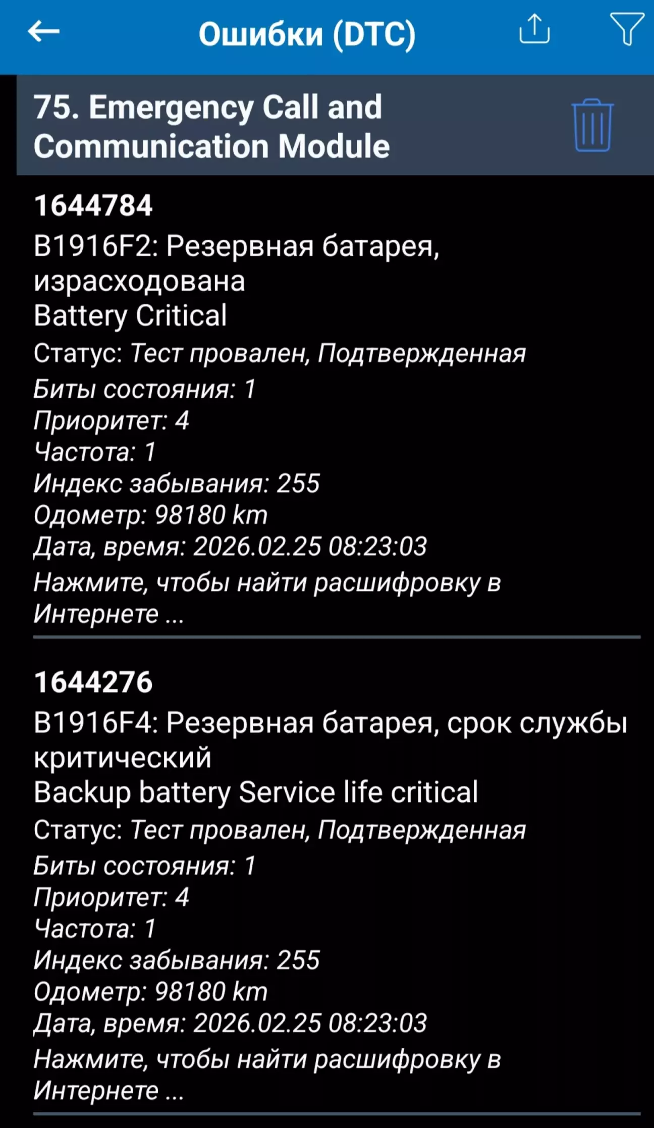Періодично роблю сканування блоків на наявність помилок, які було в'ялено в 75 блоці (Модуль аварийного вызова и блок связи):