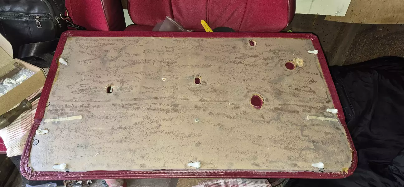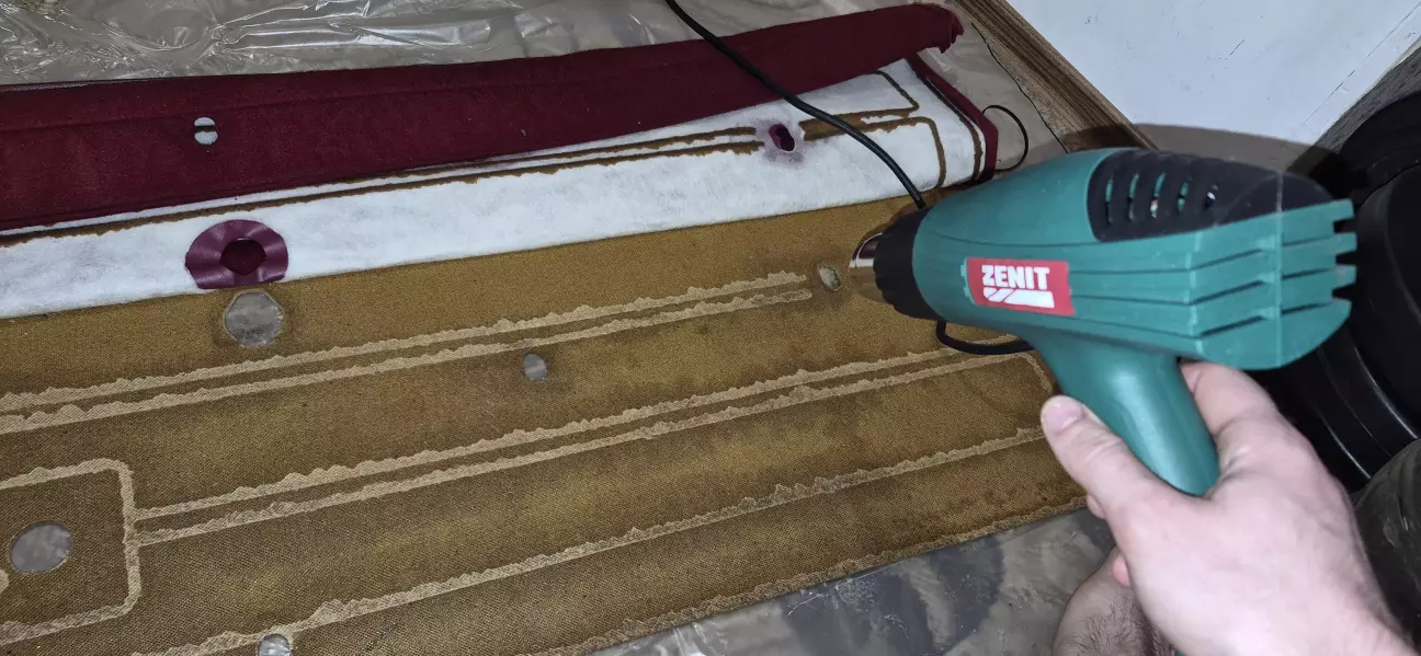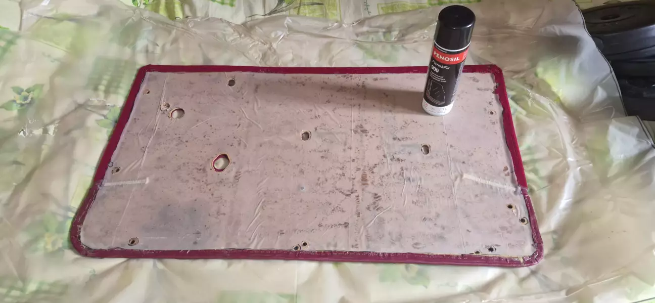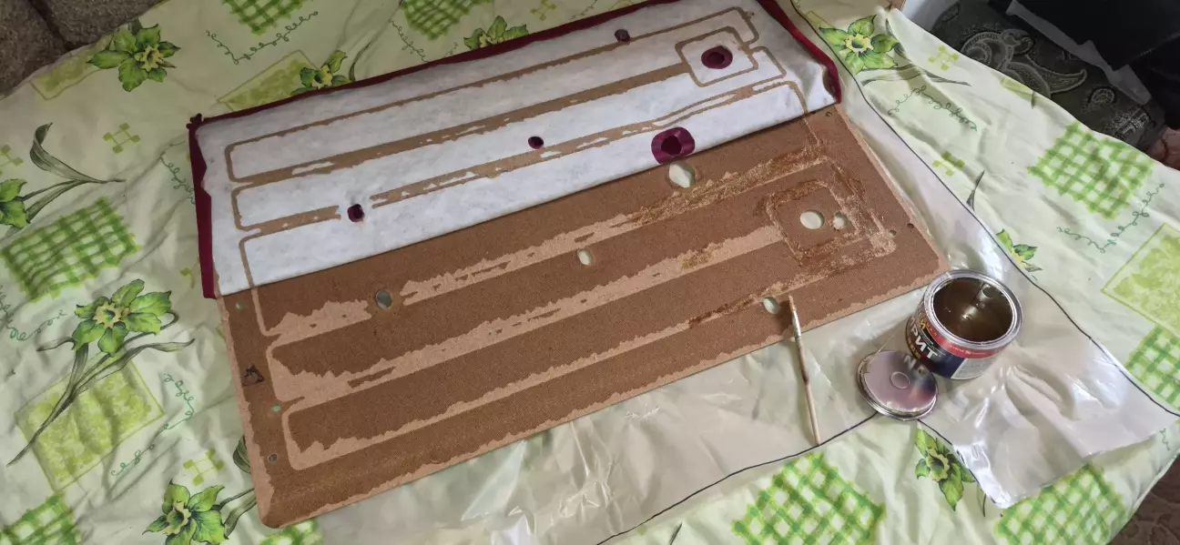 На карті, де робився ремонт кармана, довелося трохи відірвати матеріал оббивки від основи, тож приклеюю її на місце (використовується клей ''наирит''