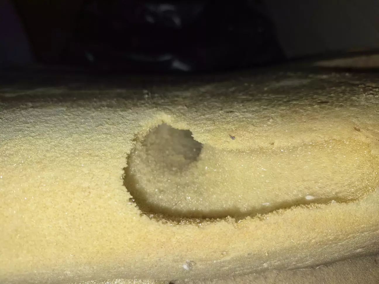 А от нижній частині - дивану пощастило, дермантин цілий, велюр цілий, миша поробила тонелі в пінолитті за пружинами, чудом не діставшись велюру