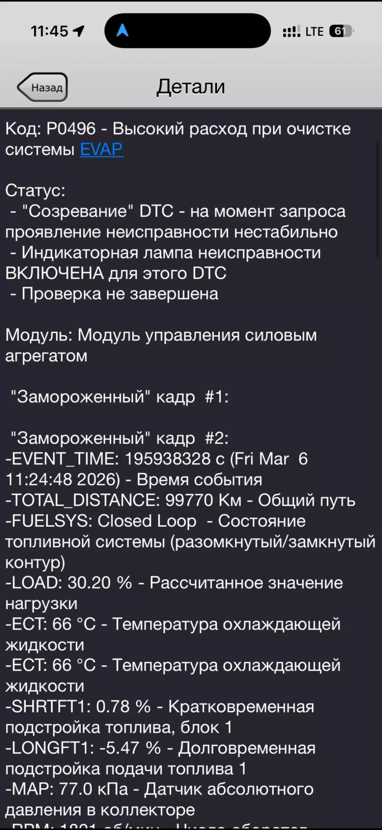 Проходить пару днів, по дорозі на роботу бачу чек на приборці. Зупиняюсь почитати що там - P0496, помилка по EVAP. Подумав, на фокусі вона мене не наздогнала, то наздогнала на ескейпі)