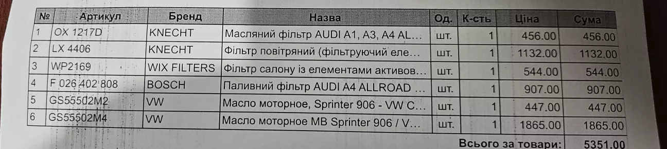 Так як замовляв все вперше, то скинув vin на продавця запчастин і він підібрав необхідні фільтри. При візиті на СТО, сказали що фільтр палива мені поклали з дизельного авто. А в моєму паливний фільтр знаходиться в баку і міняється раз на 40-60к км. Тож повернув його.