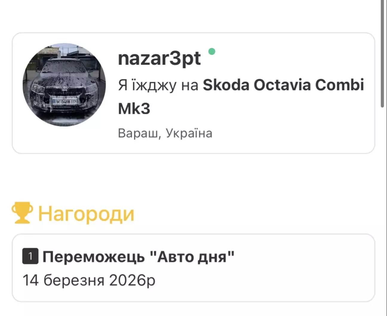 Нещодавно(в грудні) вперше попав на номінацію «Авто дня», але за відсутності гарних фото та інших різних причин зайняв останнє місце😁(біля 3% голосів, скрін не зберігся).