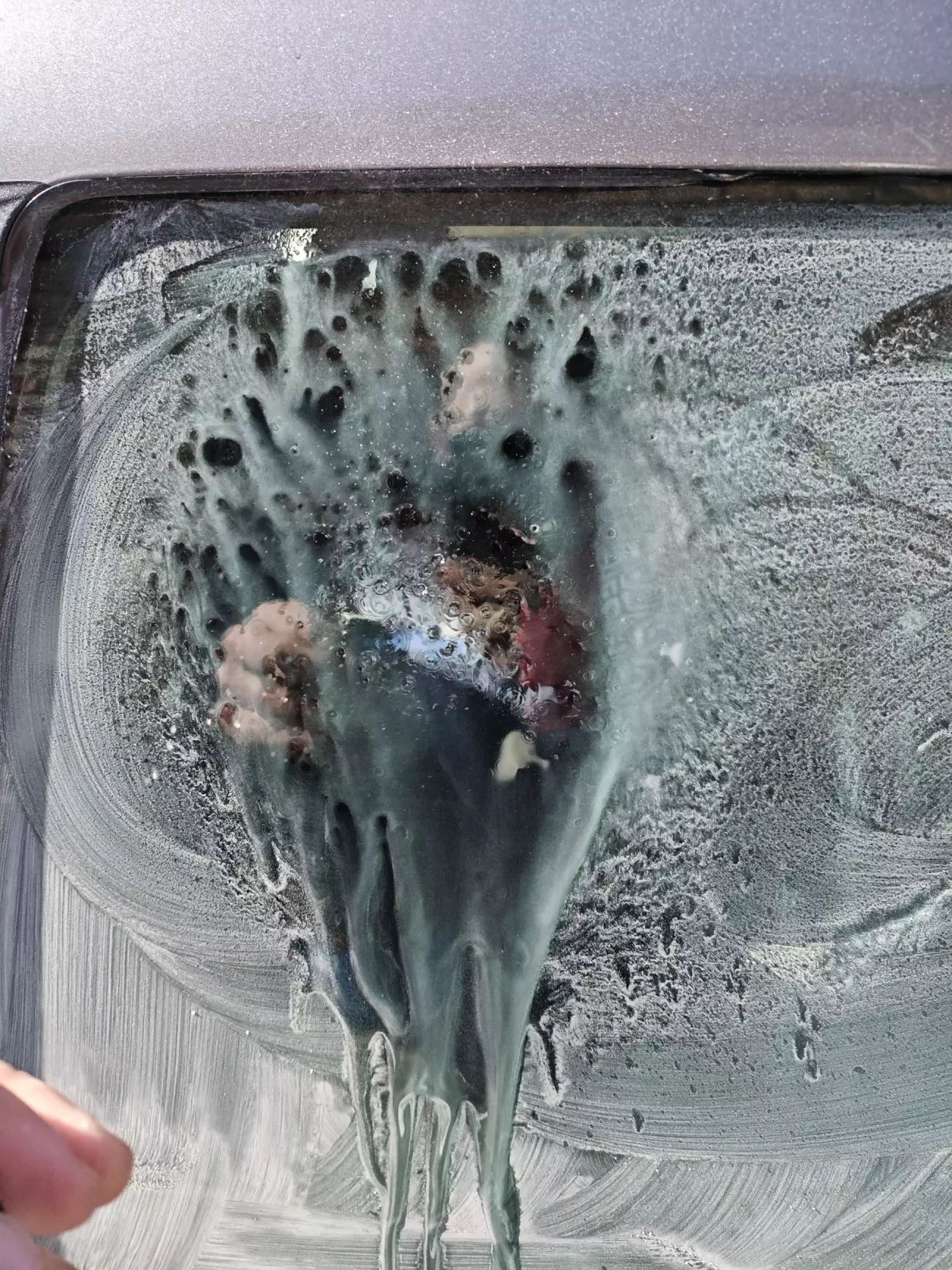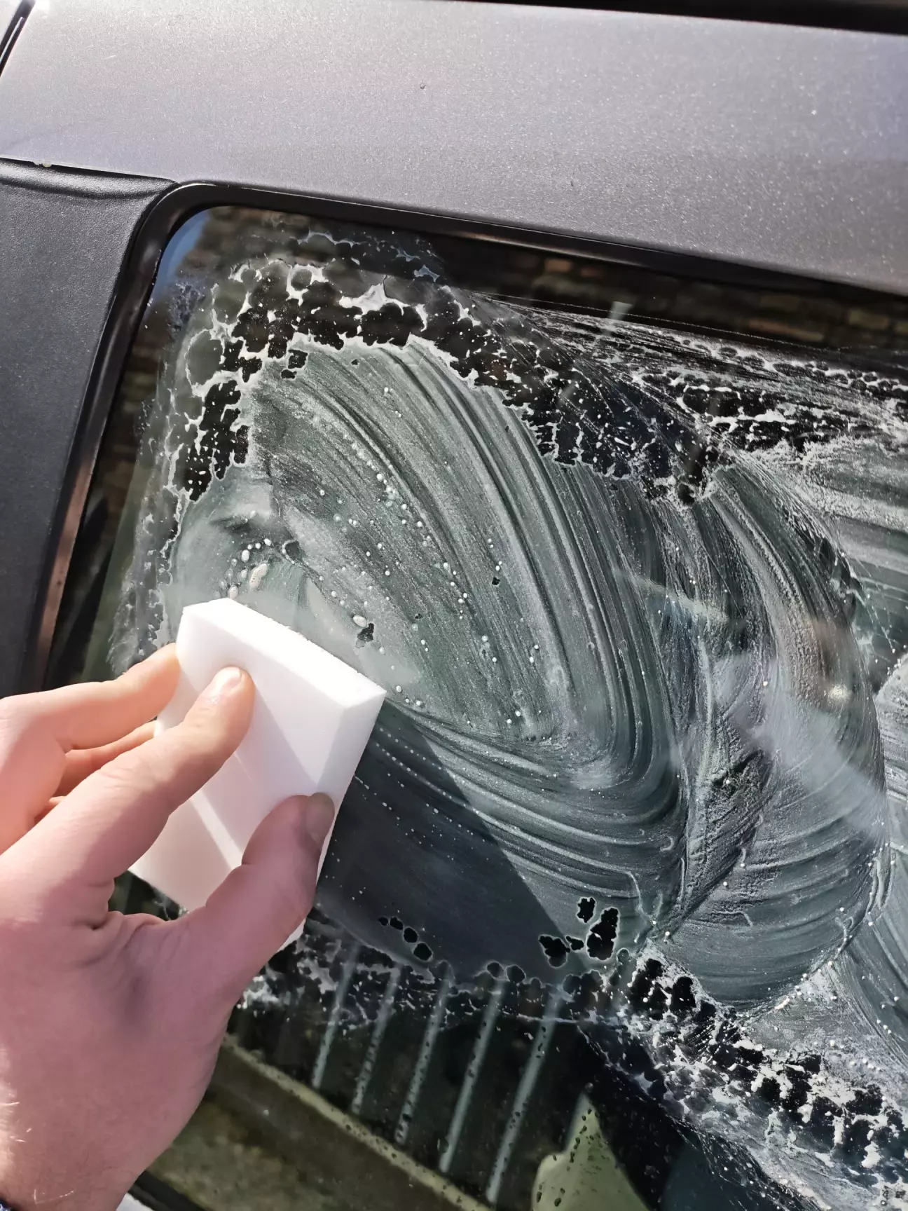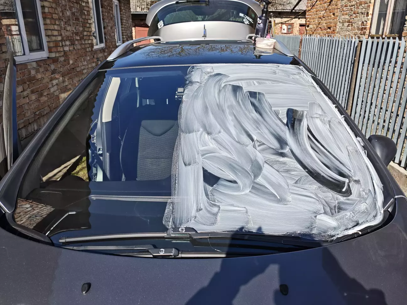 Лобаш і передні вікна покривав антидощем ще осінню то ефект досі замітний. Починаємо з розведення як написано "сметанки" і легенько без прикладання зусиль починаємо наносити абразив. Одразу бачу що він фіг наноситься