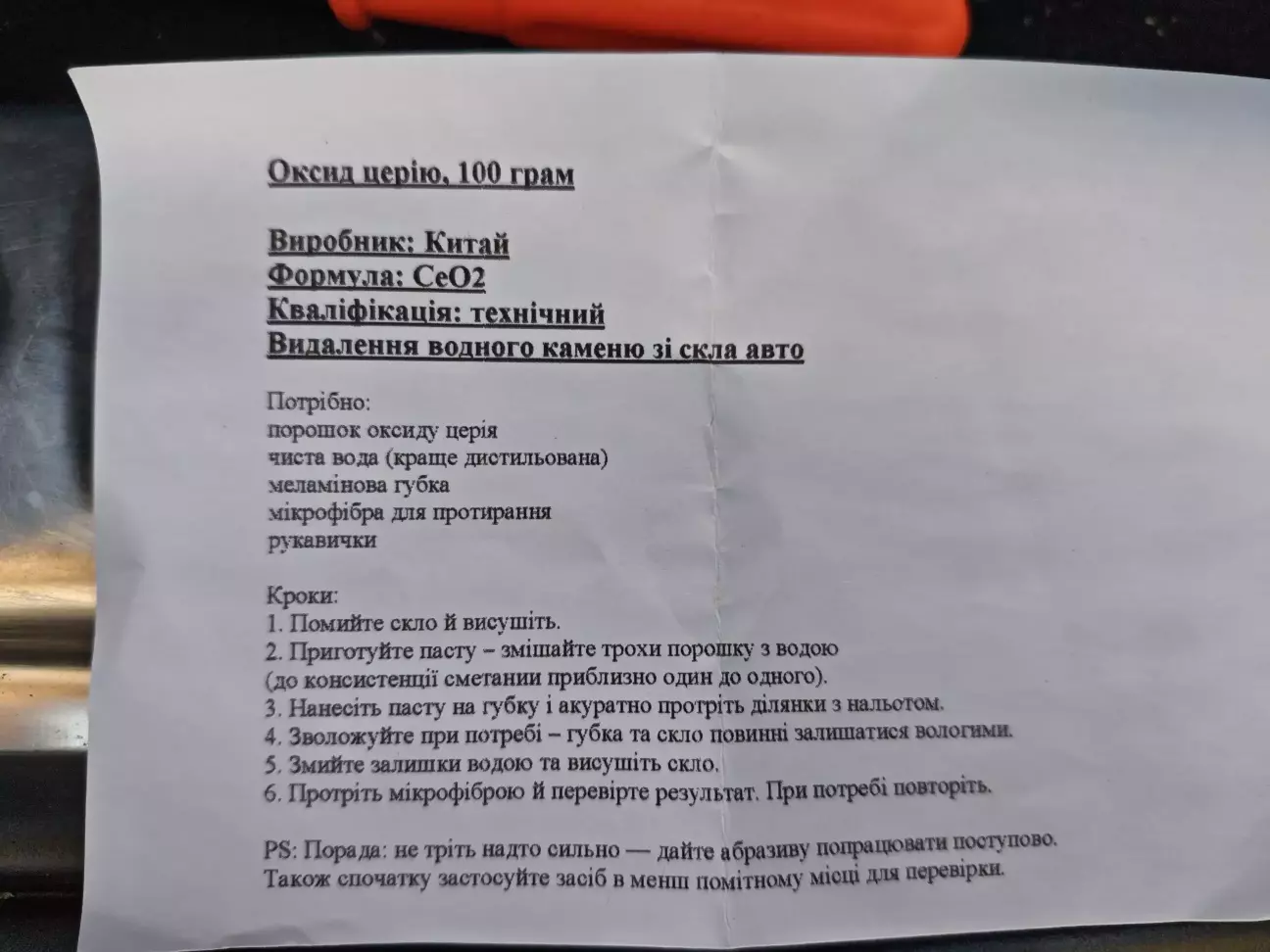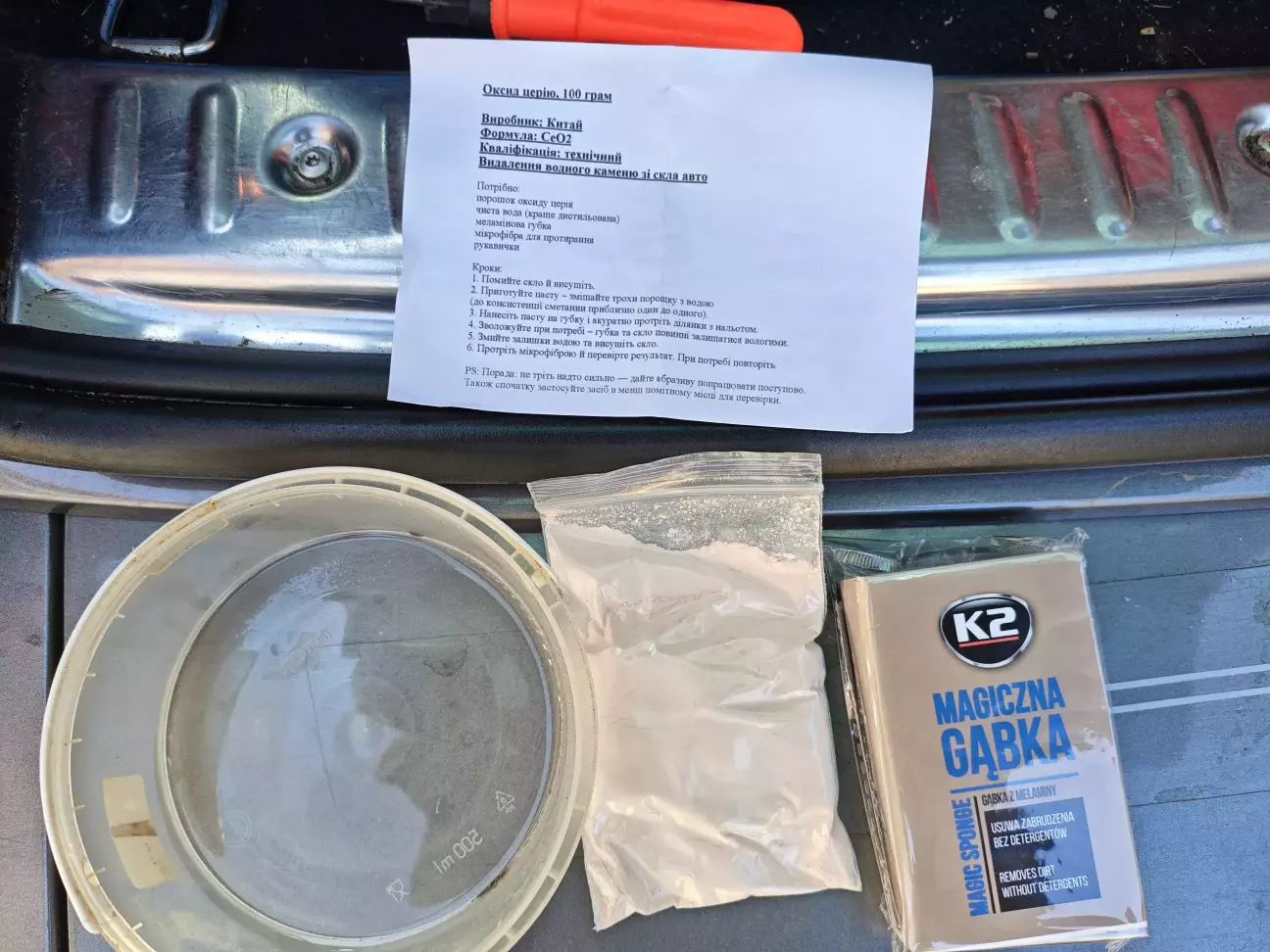 Ну що ж потепліло, можна і зайнятись тим що планував ще осінню....знімаємо камінь з вікон авто. Ще осінню придбав оксид цезію порошок, це те ж саме що і в софті 99 і інших абразивних очисниках.