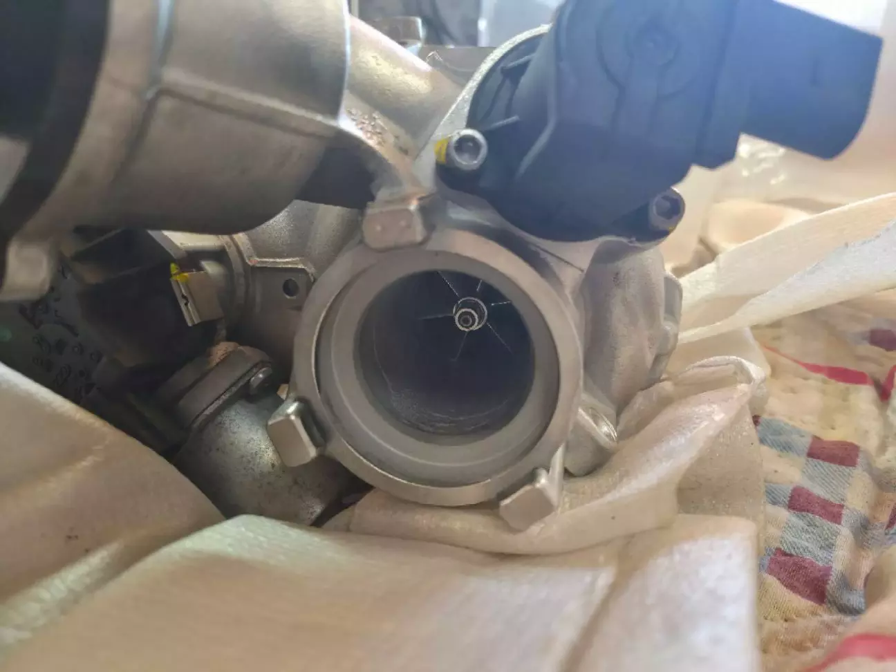 І ось прийшов час розпочтинати комплексну роботу з ребілдом турбіни та очисткою всього впускного тракту від мастила. Зняли турбіну, люфт вала турбіни був явно поза межами норми. Зняли впускний коллектор і там побачили жах. Мастила було дуже багато. На жаль фото впускного колектору з впускними клапанами не зробив. Залишилось тільки фото знятої турбіни (хочаб щось).