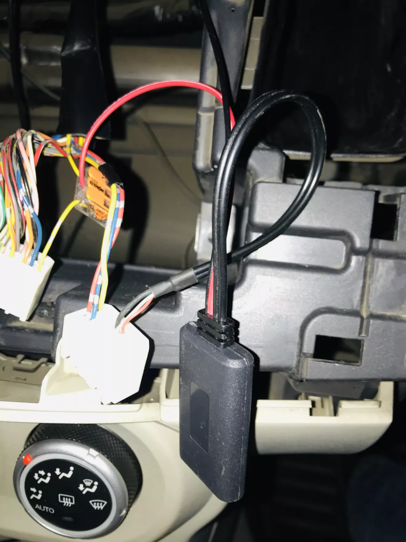 Попользовавшись ауксом пару недель стали напрягать провода. Купил с али блутус кажись с разъёмом на шкоду — достал пины и вставил в магнитолу предварительно выкинув аукс все подошло. Минус взял с массы, а плюс с асс ( то-есть блутус включается с магнитолой при повороте ключа). Работает четко, шум малый есть только если навалить громкость на +80% без проигрывания, при проигрывании пропадает. Подключается с телефоном- планшетом моментально. Если кто надумает берите с микрофоном! Той же алисой в навигаторе можно будет управлять не отвлекаясь.
