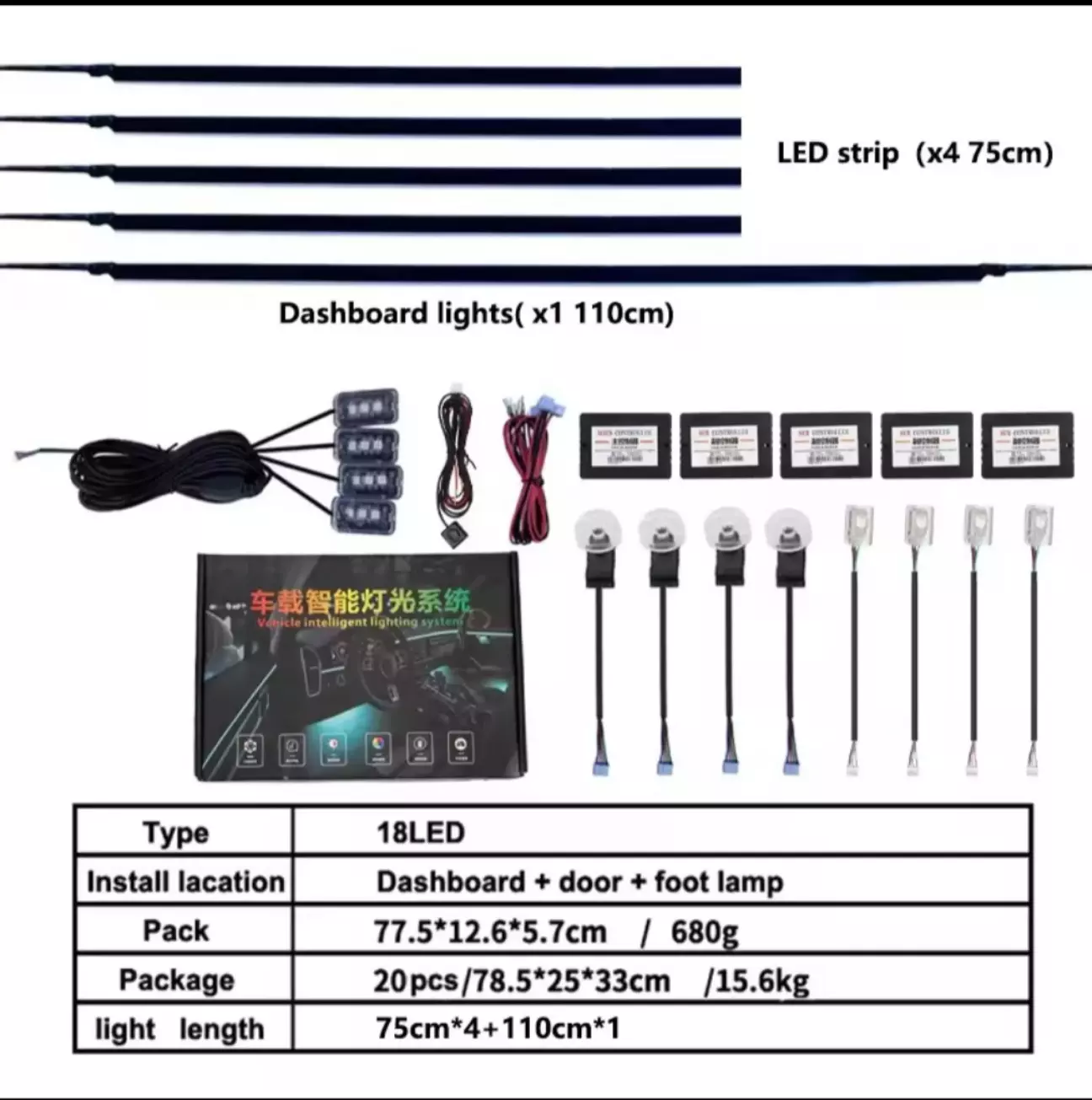 Заказав ось такий комплект, на 18 точок освітлення (підсвітка ручок, ніг, ніши в дверях та полоси вставки в двері та торпеду.)