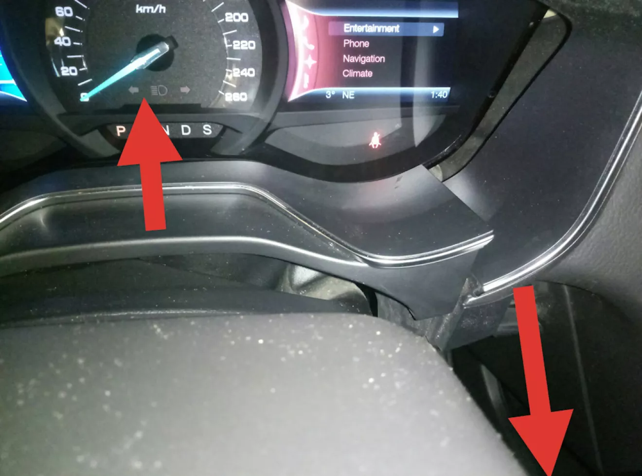Эта накладка состоит из 2х частей. К средней части крепится ткань над рулевой колонкой. Чтоб разобрать — середину тянем вверх а бока вниз.
