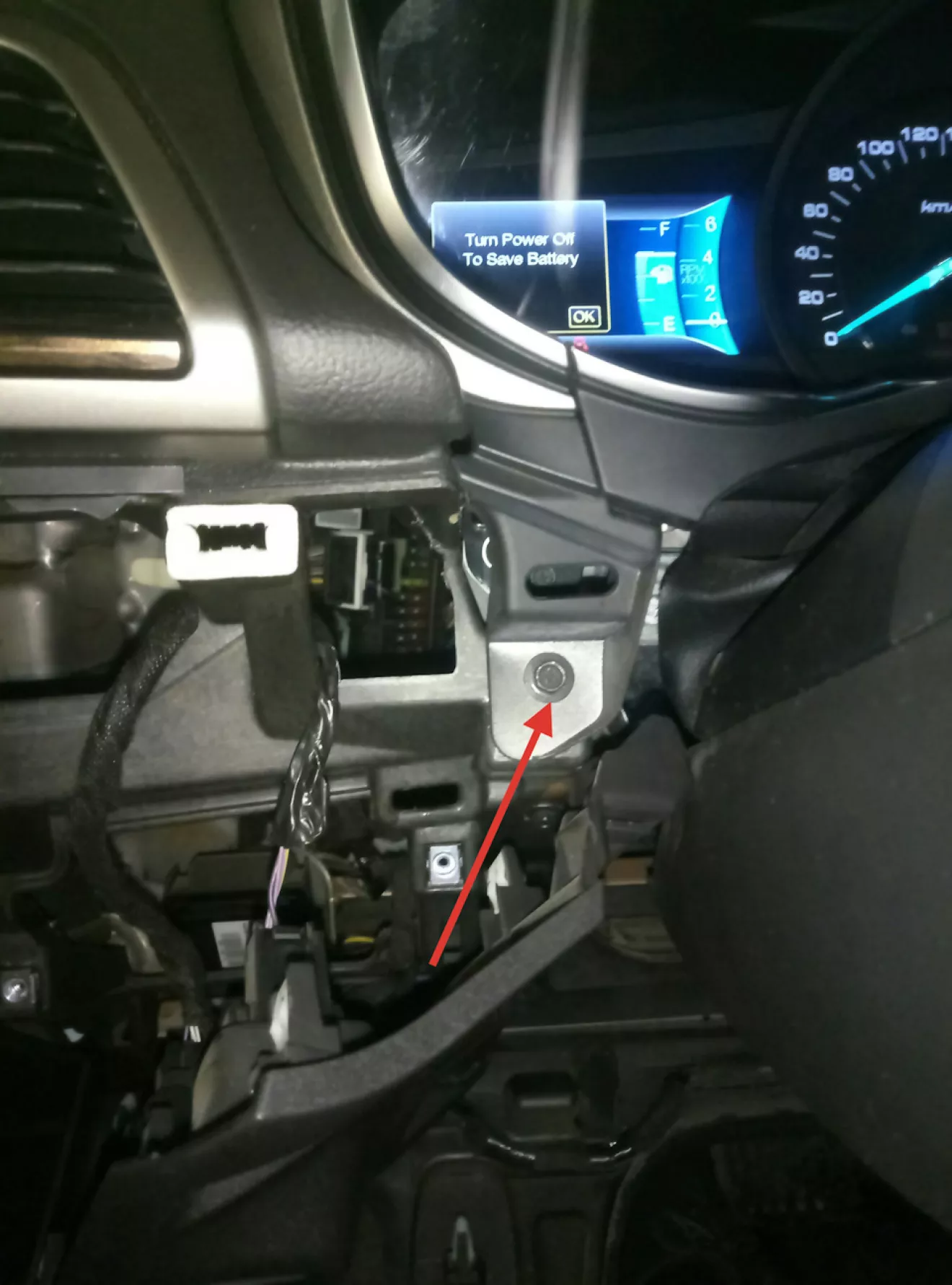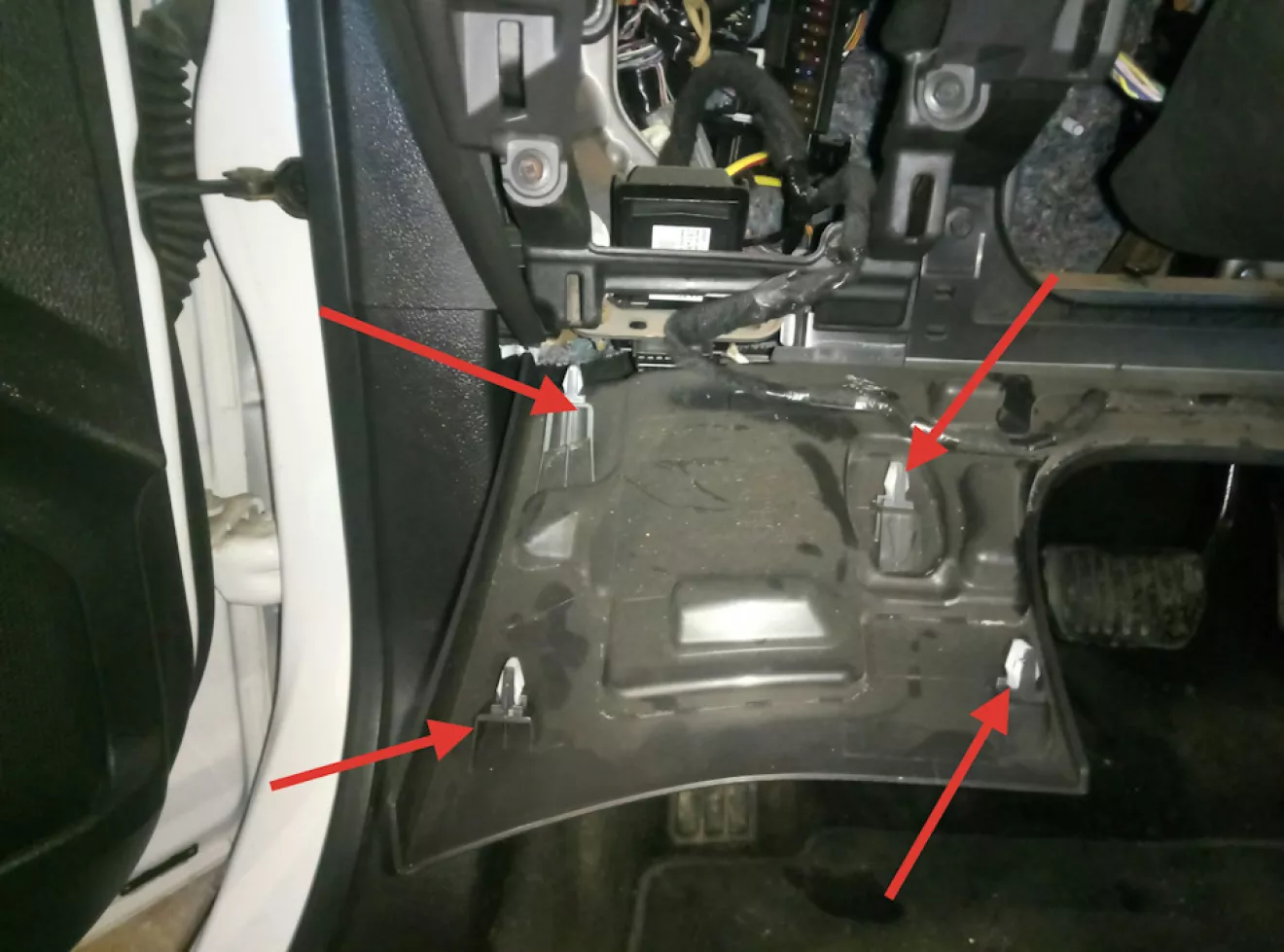 Разбираем. Сначала надо отщелкнуть пластмаску под рулем. Там 4 защелки слева от руля и 3 справа. Тянем не боимся сверху пластмаски.
