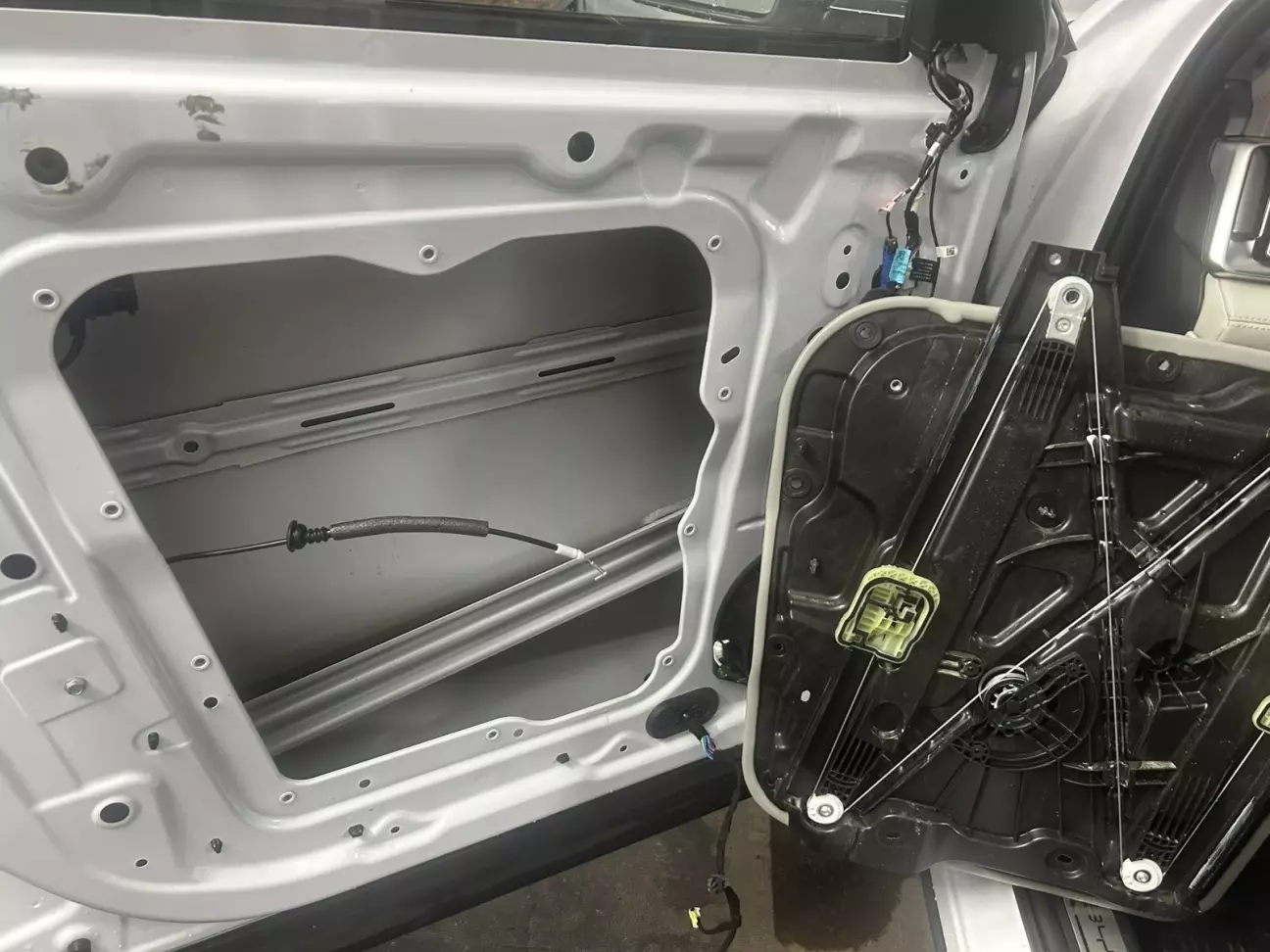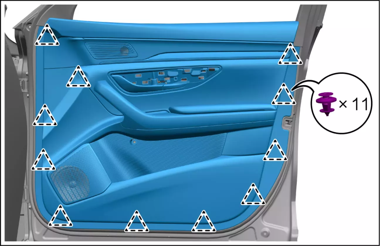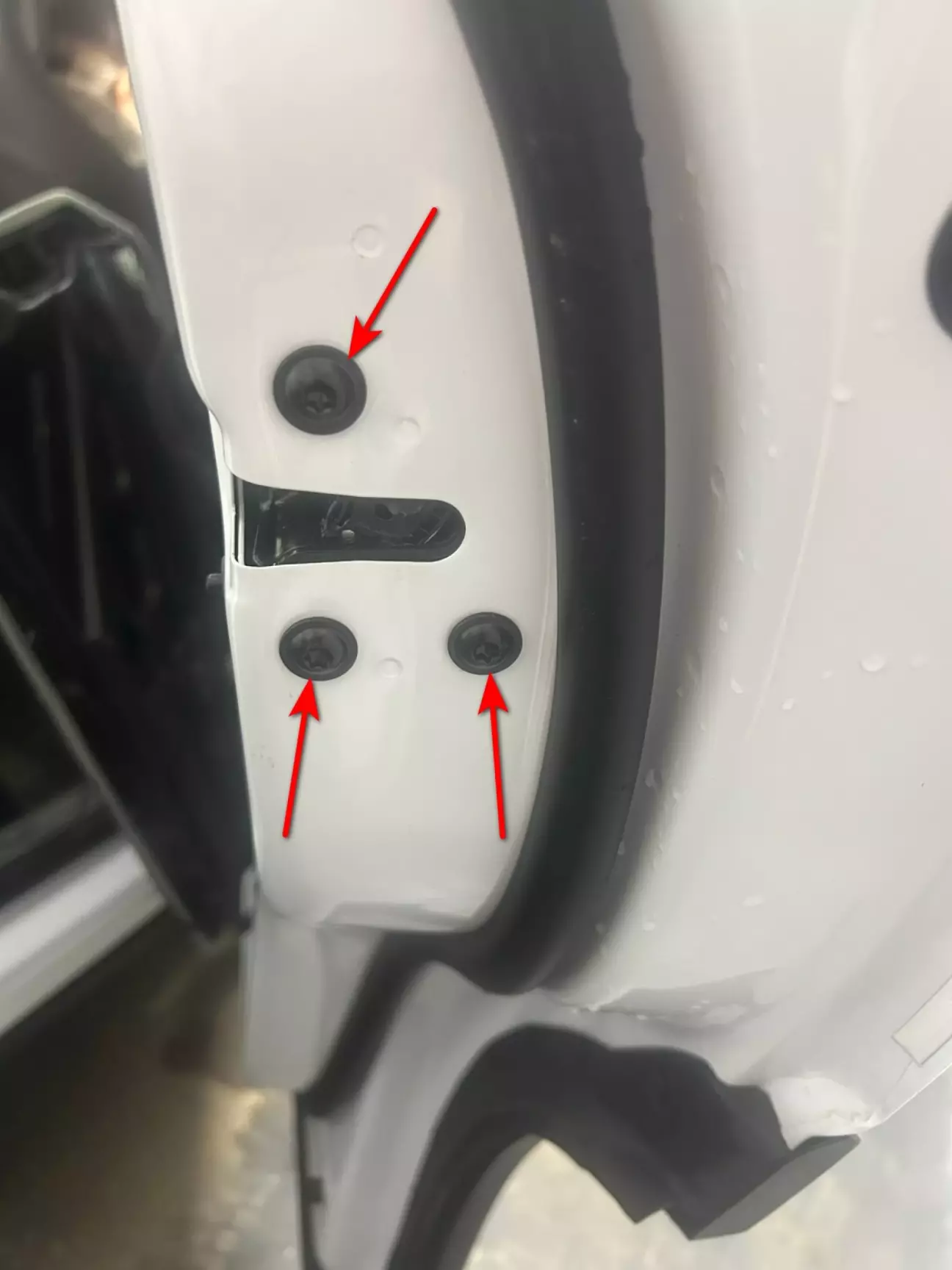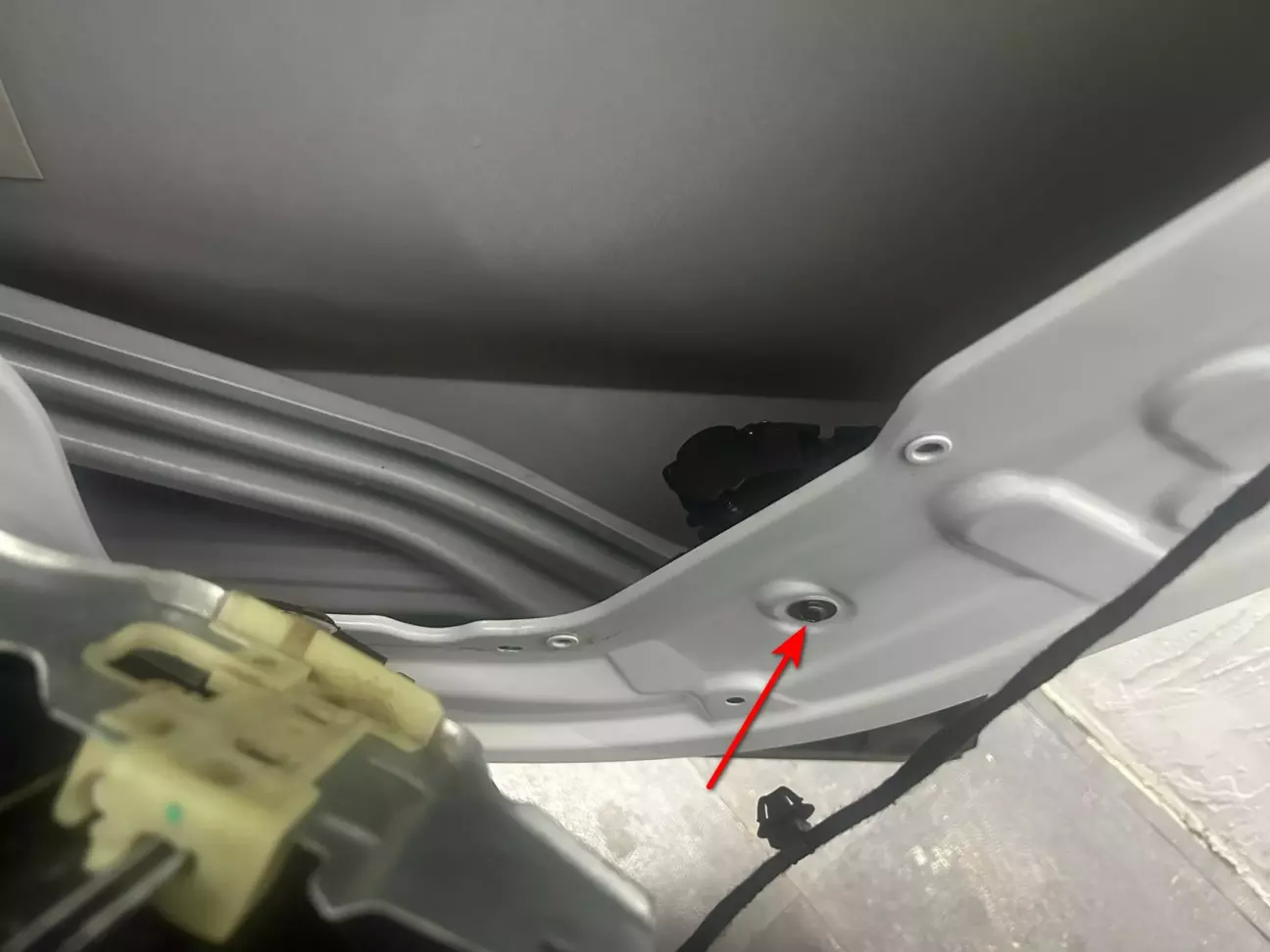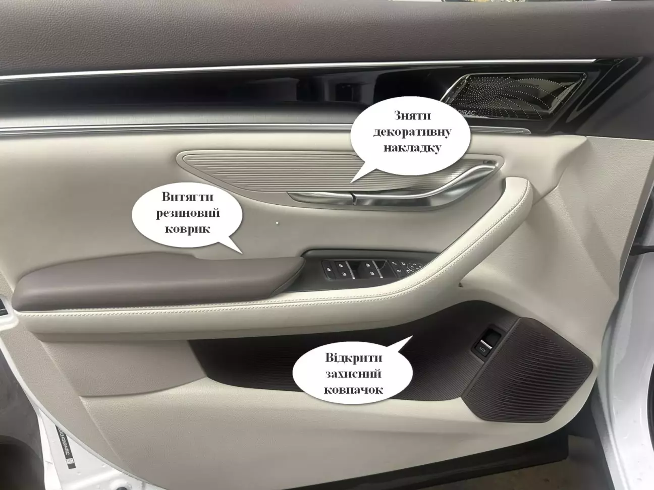 - з карти двері зняти декоративну пластикову накладку дверної ручки (тримається на кліпсах) і відкрутити під нею перший болт, потім витягти захисний ковпачок в нижній частині карти двері і під ним викрутити другий болт, далі підняти гумовий коврик ручки двері і відкрутити третій болт і вже після чого зняти саму карту дверей (тримається на пластикових фіксаторах) піддівши її пластиковою лопаткою;