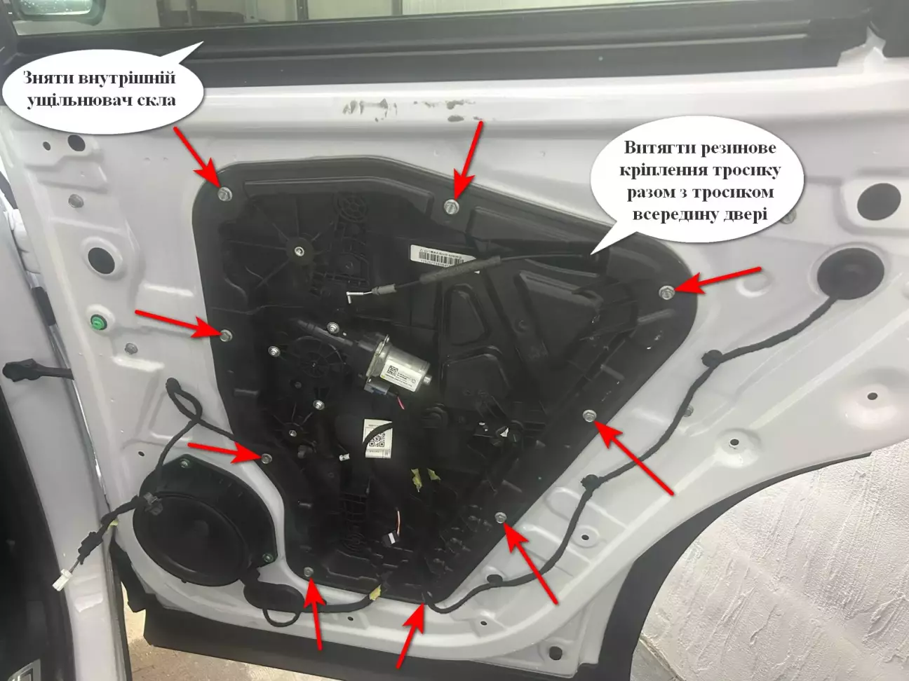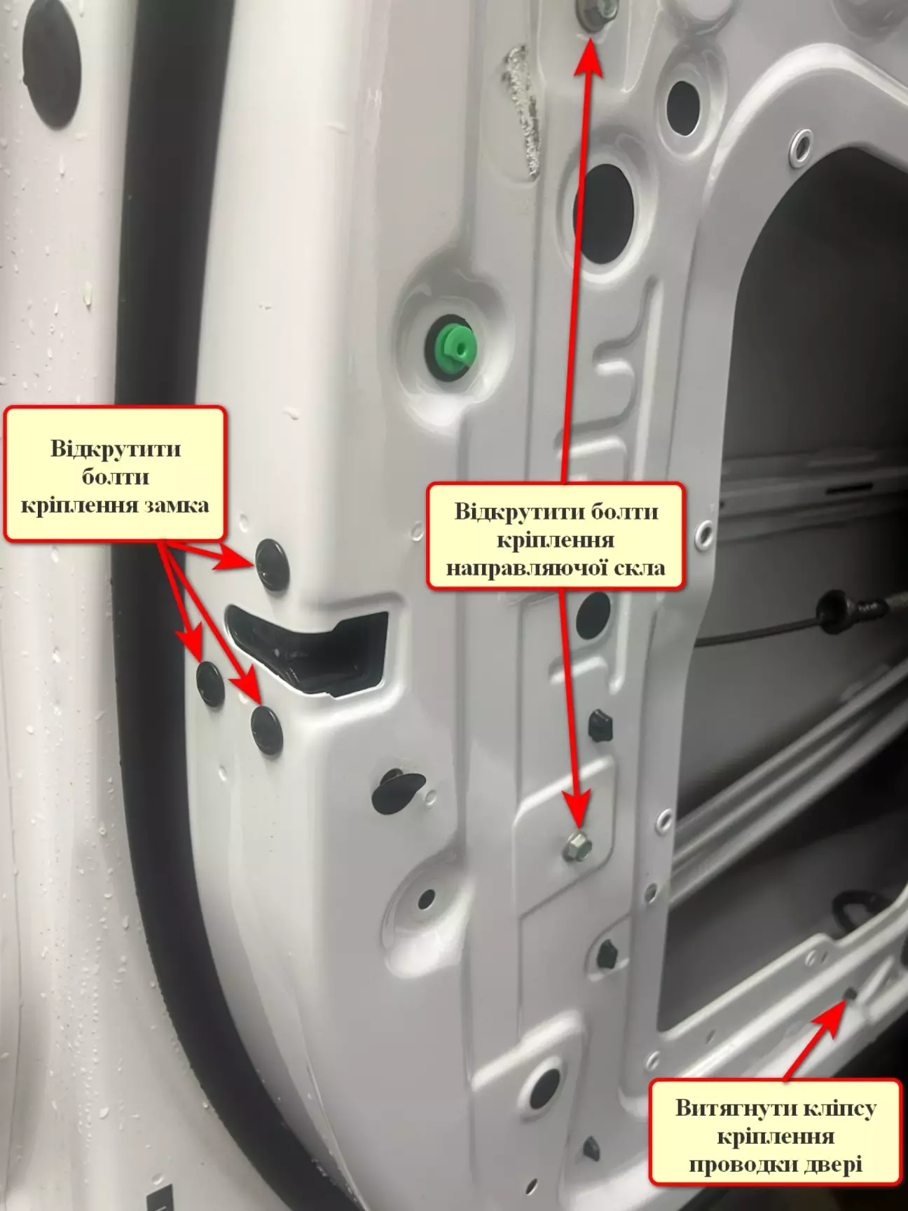 - для підняття скла потрібно викрутити два болта його кріплення (замість пластикових защіпок які в передніх дверях потрібно було вдавити всередину);