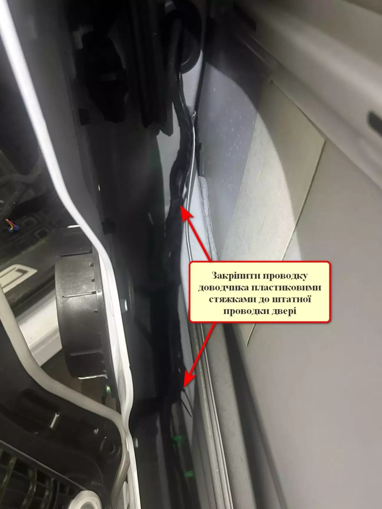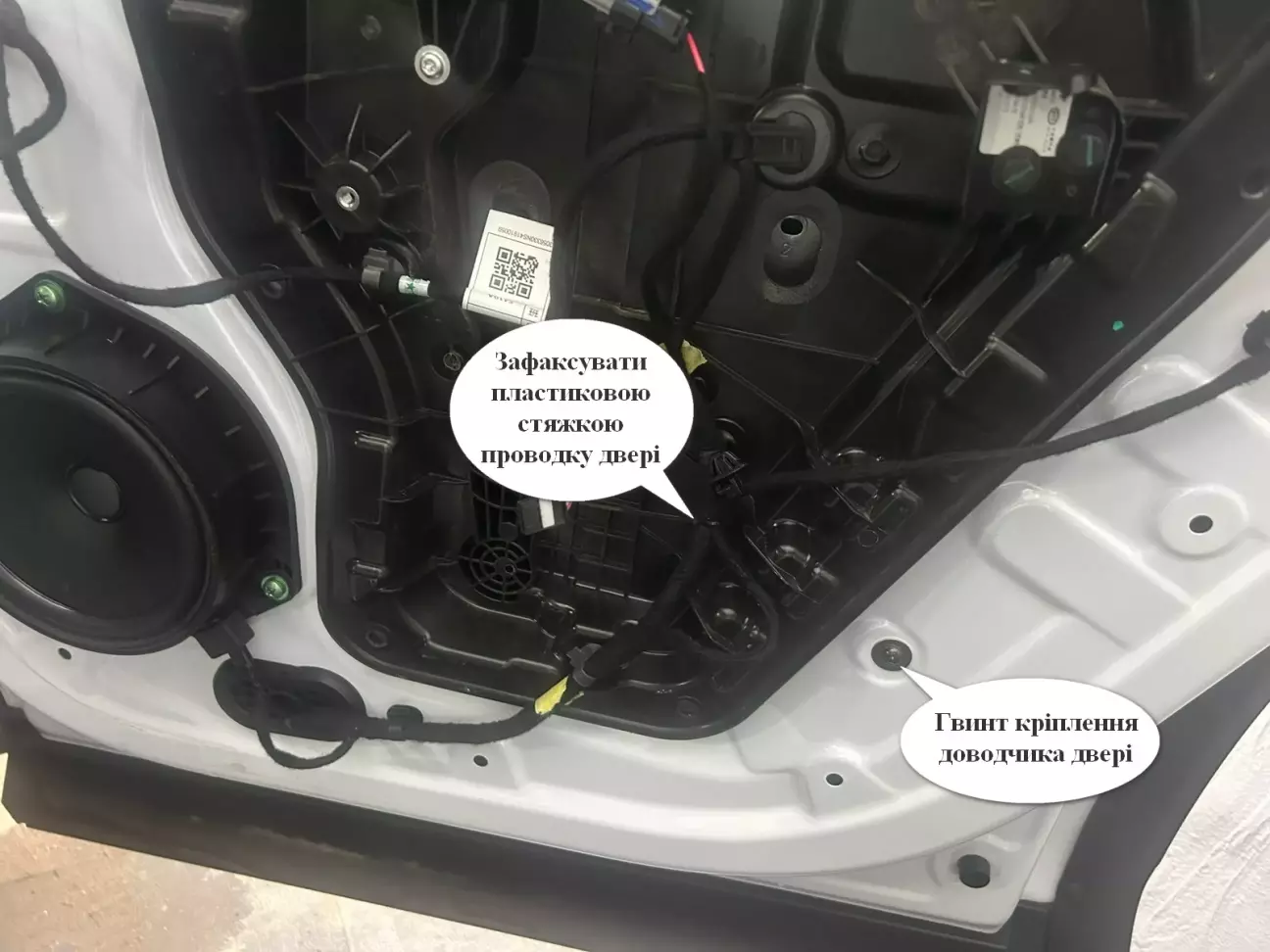 - прикрутити болтом з комплекту доводчик дверей через отвір для кліпси тримання проводки двері (що витягнули) і з’єднати роз’єми проводів доводчика двері з тими що проклали в двері роз’ємами проводів живлення;