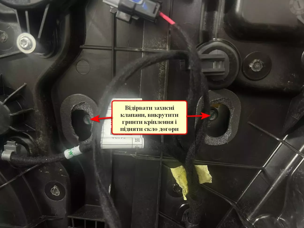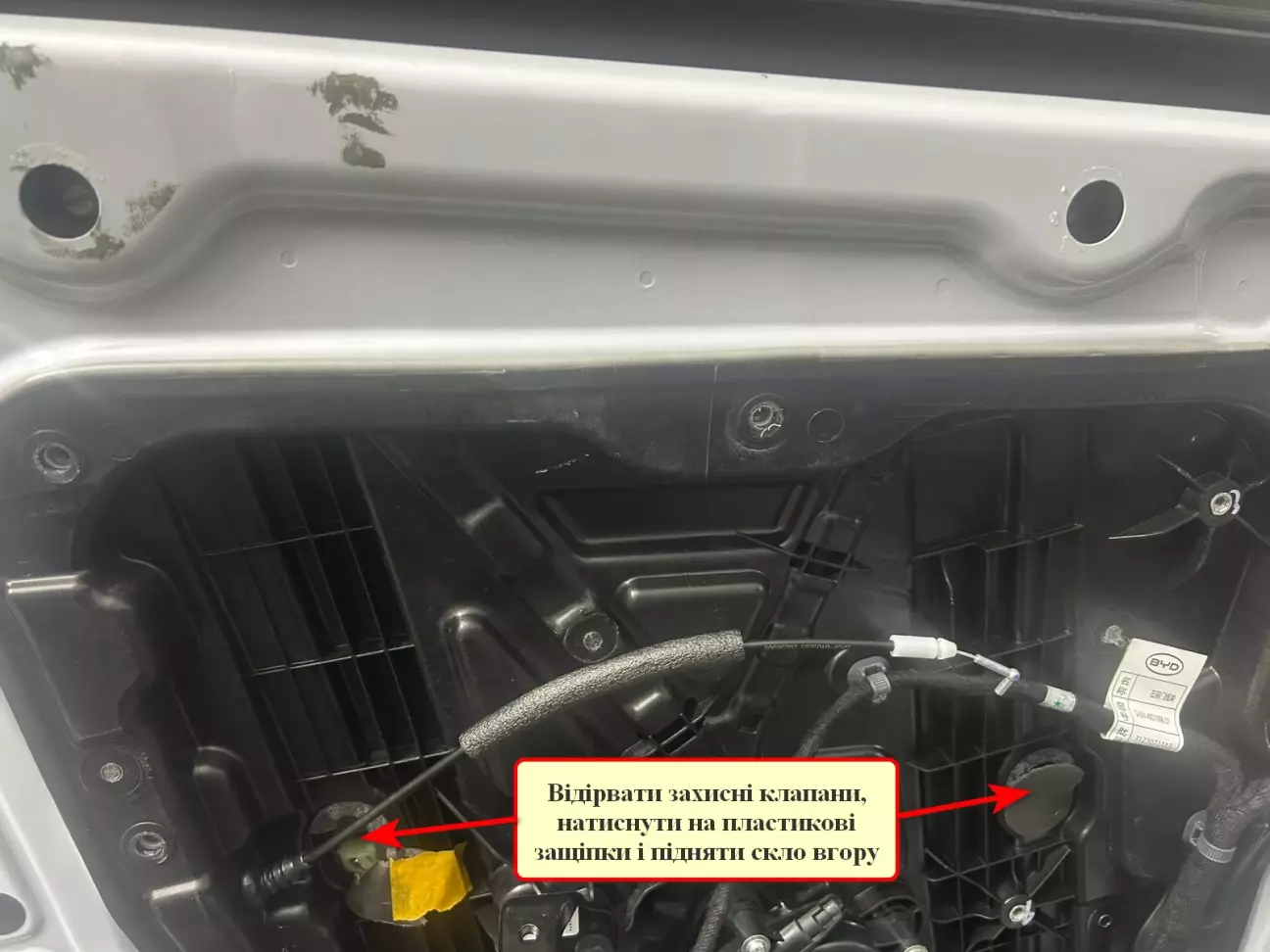 - в чорній пластиковій захисній накладці знайти два захисних клапани і опустити скло за допомогою кнопки склопідйомника до рівня поки не буде видно пластикові защіпки що тримають скло,