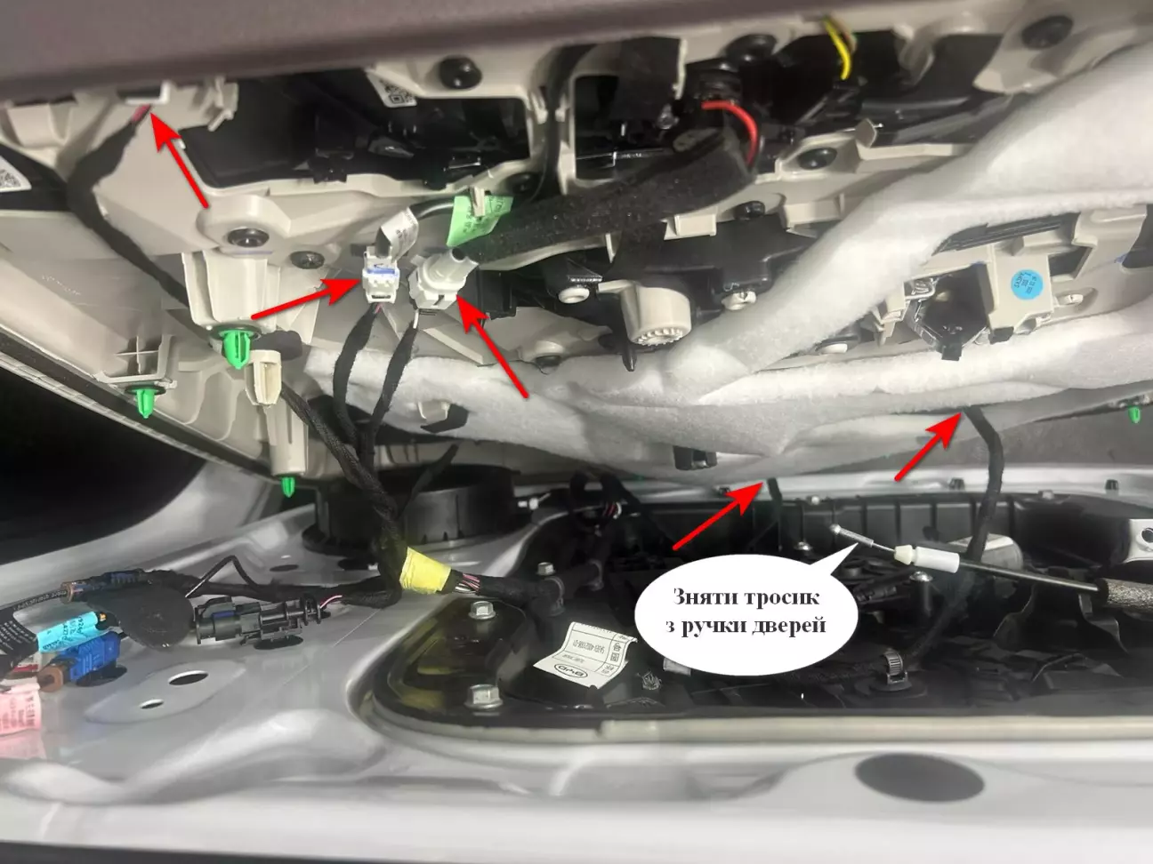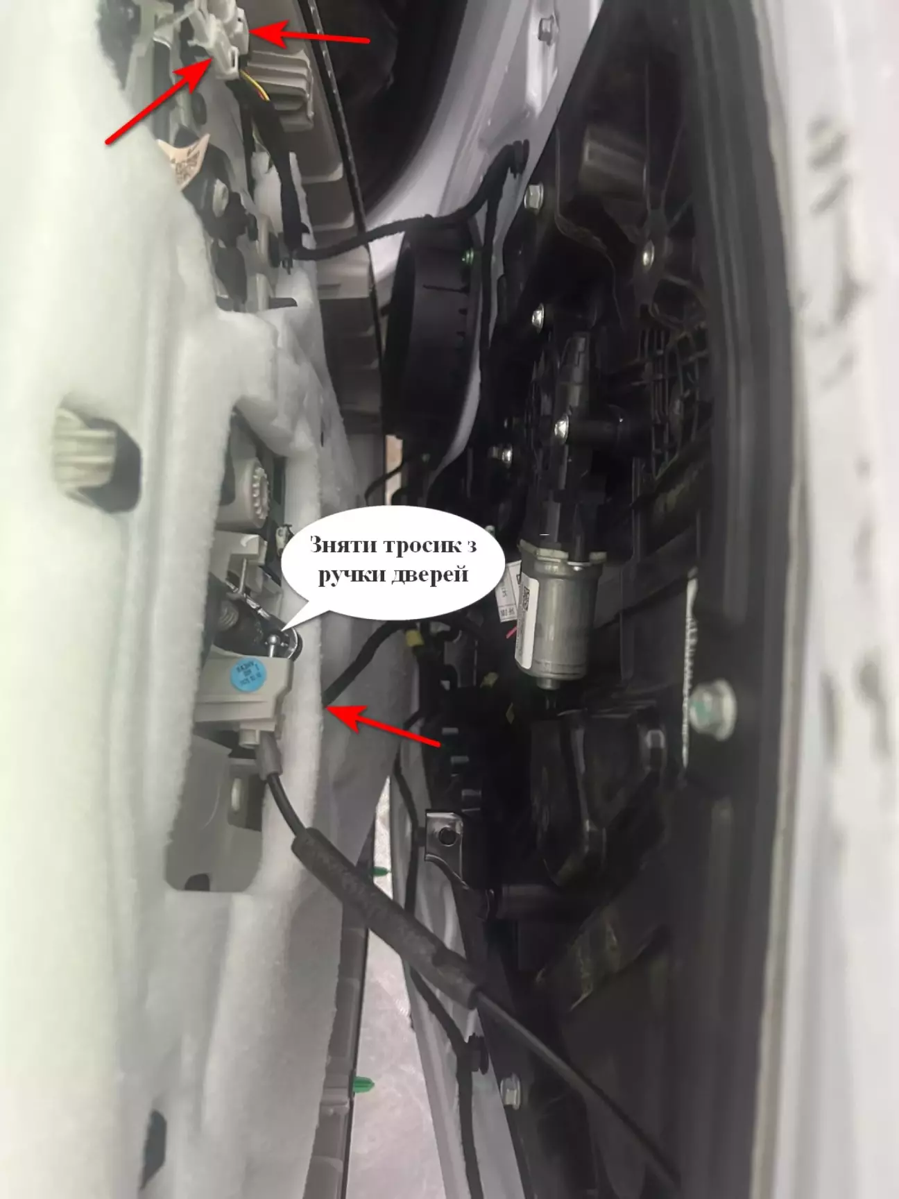 - від’єднати від карти дверей роз’єми проводів і тросик що йде на замок відкриття двері та відставити карту дверей в сторону;