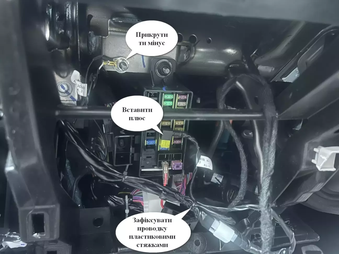- прикрутити мінусову клему проводу, що йде на праву сторону автомобіля – до корпусу автомобіля (штатний болт з правої сторони);