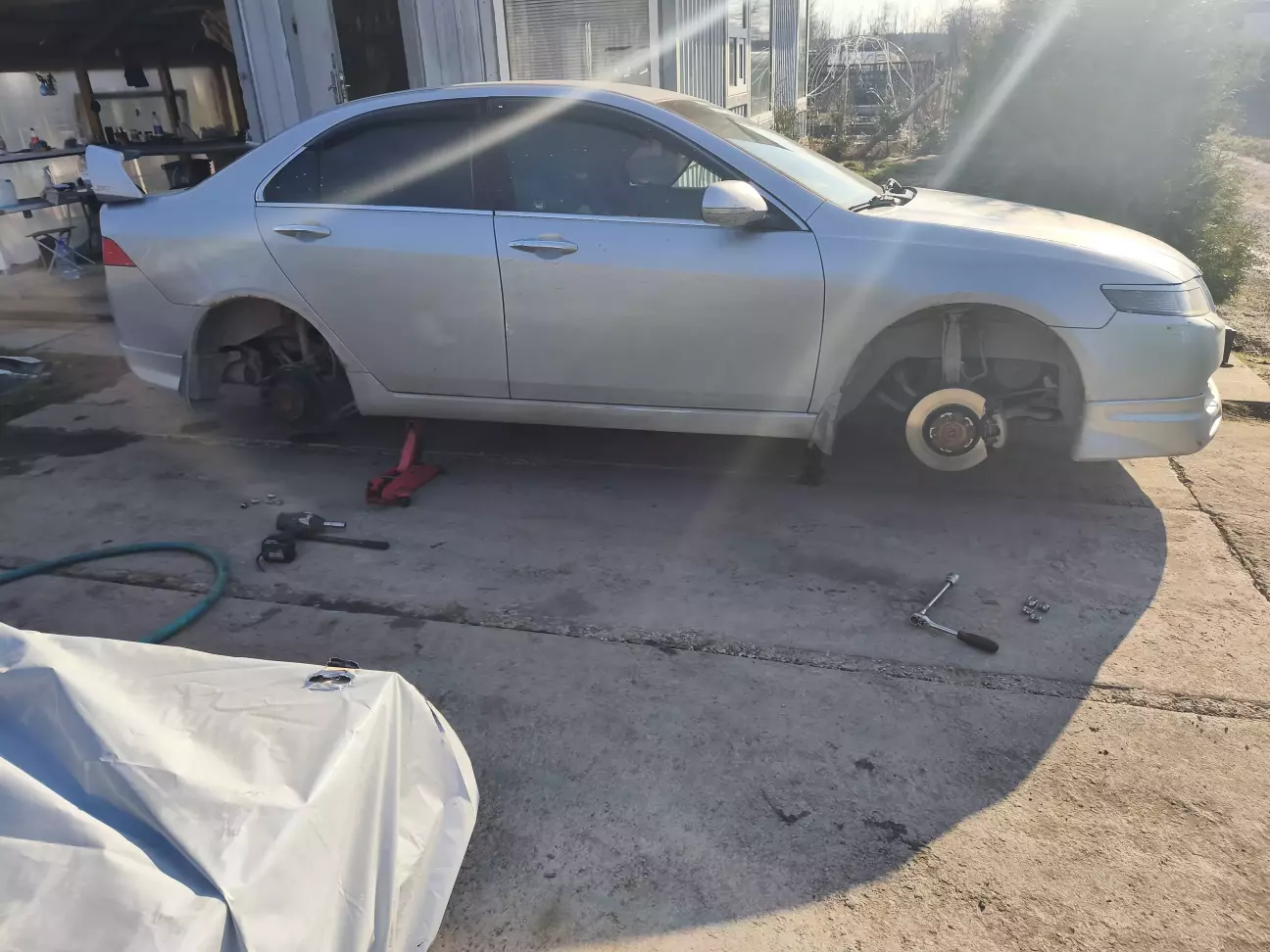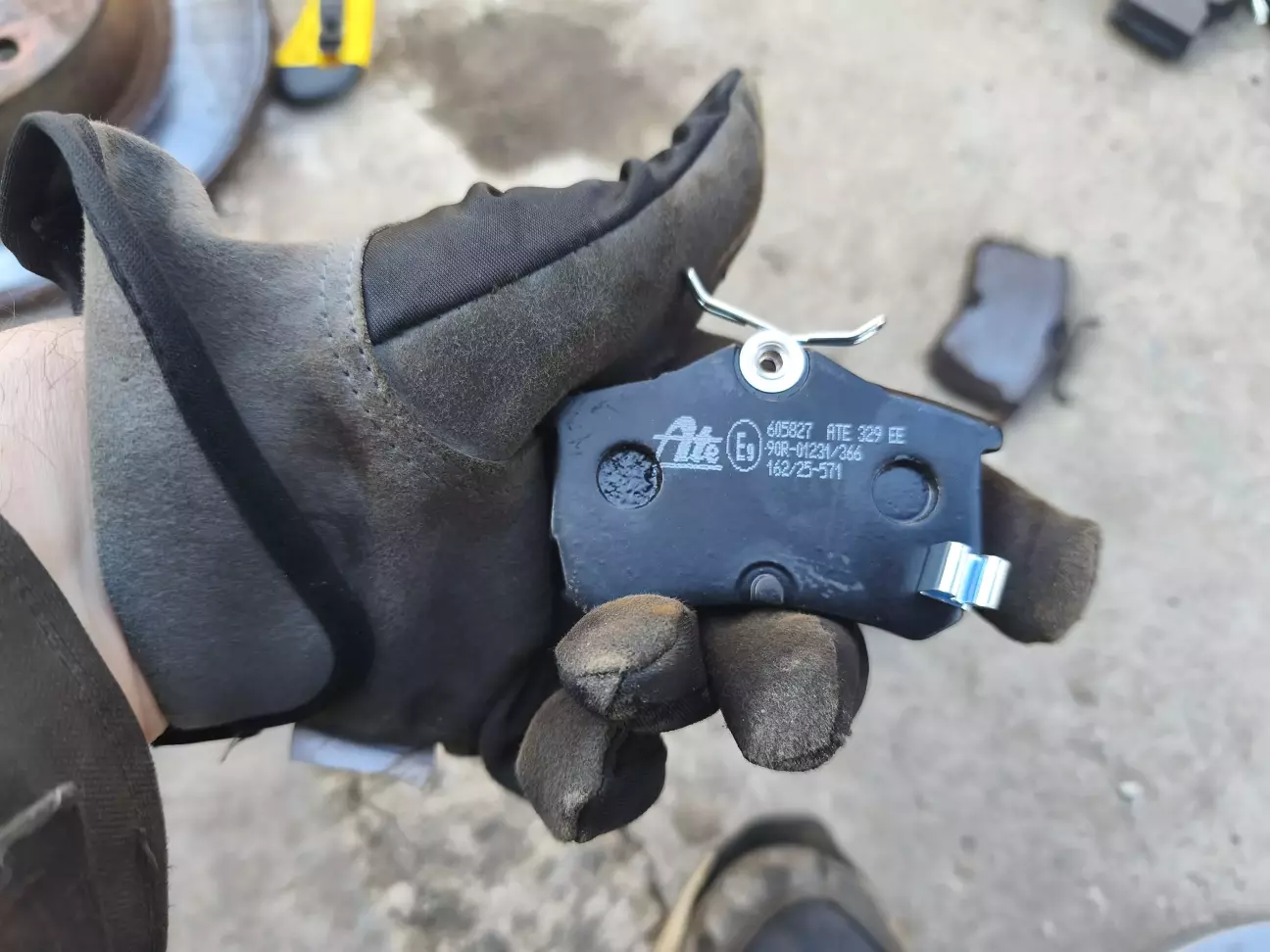 Потепліло вночі нижче 3х градусів температура не опускається отже пора міняти колеса назад на літні. Коли вже поліз до колес треба направляйте супортів перевірити чи не заклинили а там вже і до заміни гальмівних дисків (доречі з осені лежать) не далеко. Восени купив нові передні диски ATE і колодки ATE і встановив так як старі вже були в раковинах і били, також купив нові задні диски Zimmerman і колодки ATE, до них руки дійшли аж зараз. Отже два домкрати і колеса зняті