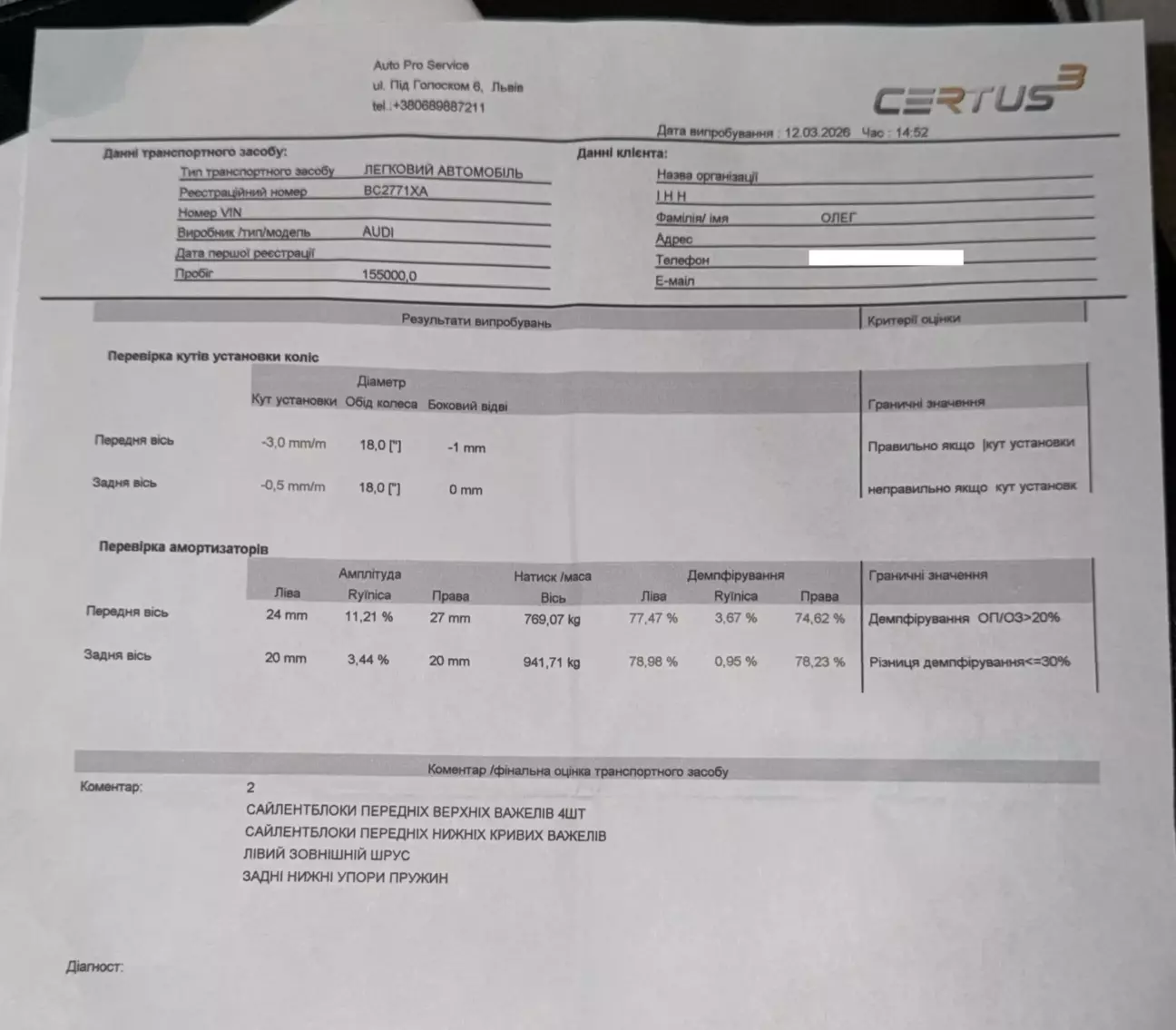 Діагностику на вібростенді робив на APS Lviv (вул. Підголоско). По результату мені сказали насправді не так багато всього як я думав, а саме сайлентблоки, опори пружин і шрус. Одразу напишу свій відгук про них - дивляться гарно, але не кажіть їм про проблему напряму, нехай шукають самі. У мене сталась така ситуація що я просто під час розмови розказав майстру за пильник і після цього він перестав шукати будь які причини хрусту, просто написав що його треба міняти і все, хоча пізніше на іншому сервісі визначили що він в хорошому стані.