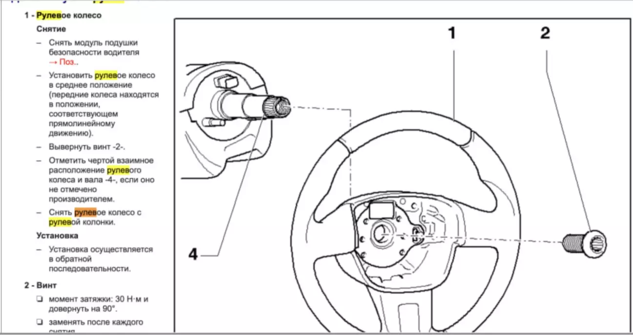 Потім встановлюємо кермо у зворотному до зняття порядку та затягуємо болт зусиллям 30 Н·м + доворот 90 градусів. Я погано читав мануал і прогледів, що після кожного зняття гвинт необхідно замінювати, тому доведеться купити новий гвинт і замінити його трохи пізніше.