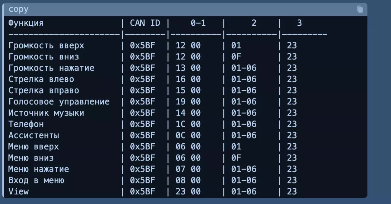 Відмінно, значить, контролер успішно спілкується з кермом. Тепер потрібно його "подружити" зі споживачами — ГУ та приладовою панеллю. Після повторного пошуку в мережі CAN-команд рульового колеса PQ26 знайшов статтю Мирослава зі Словаччини, де він вивчив, як змінюються дані в CAN-шині при натисканні на кожну кнопку. Ось як це виглядає: