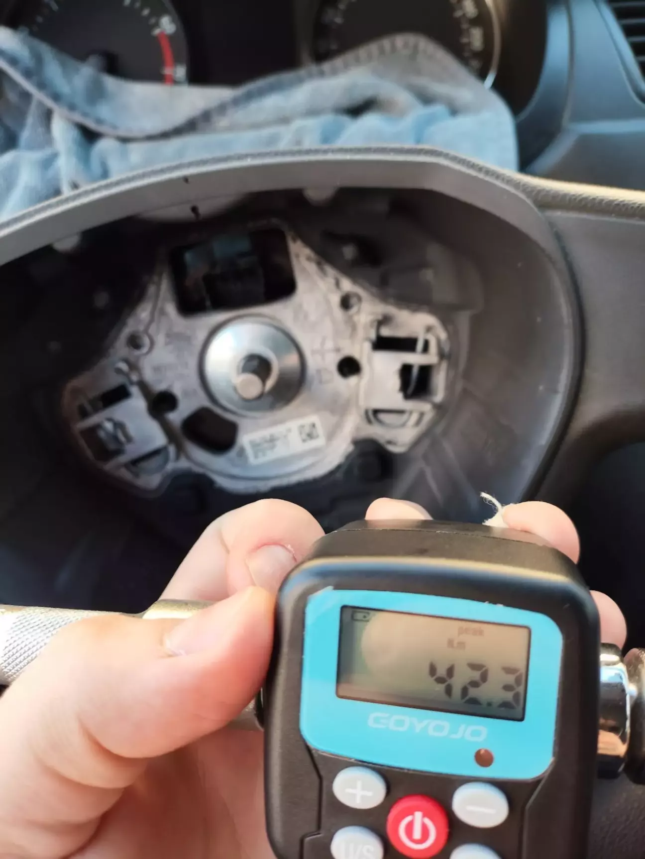 Продовжити я вирішив із заміни керма — тут усе стандартно. Знімаємо клему "-", скидаємо подушку, знімаємо жовтий роз'єм подушки (попередньо підчепивши викруткою білий язичок на ній), відкручуємо болт керма біткою Spline M12 через подовжувач і динамометричну насадку (щоб виміряти зусилля, з яким воно було закручене — виявилося 42 Н/м).