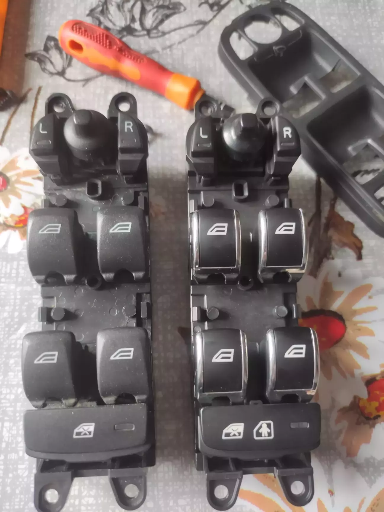 Я глянув на нього і прозрів, блоки склопідіймачів ідентичні по формі з моїм, різниця тільки в тому що ці з металевим кантиком по краю кнопок, який на мою думку виглядає цікавіше ніж стоковий блок на вольво V50. Отже замовляю його на свій страх і ризик, розуміючи що від нього потрібен тільки корпус, а плату я поставлю зі свого блоку. І так, забігаючи наперед, плати виявились умовно різними, схемотехніка однакова, контроллери однакові, а от номінали резисторів для кнопок різні.