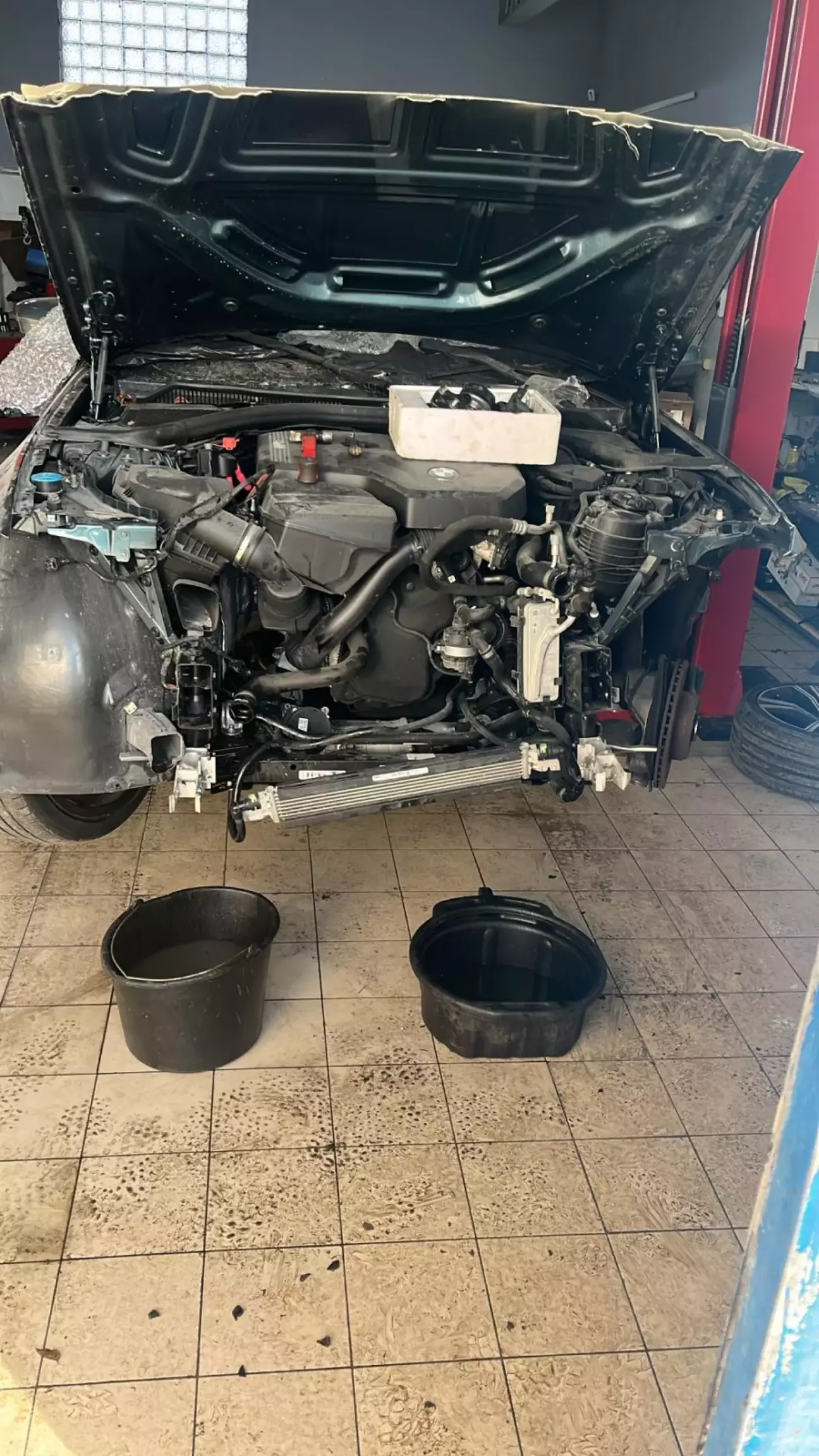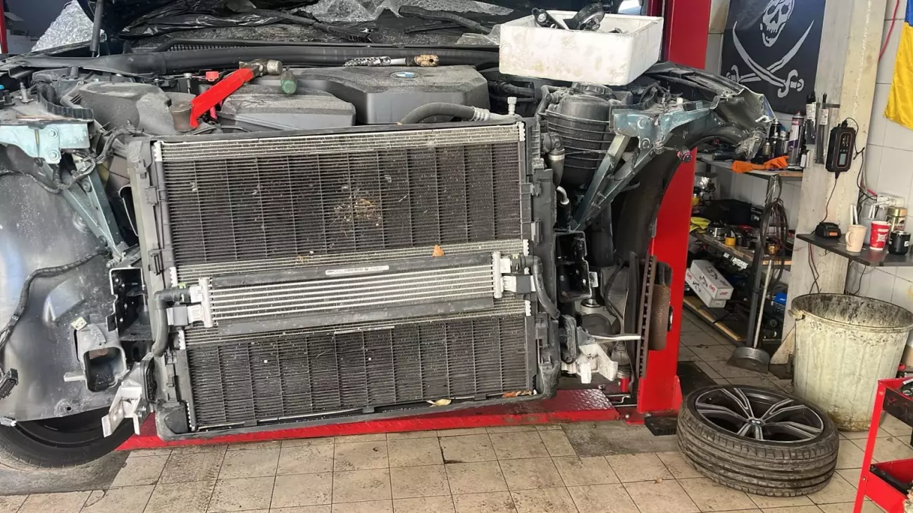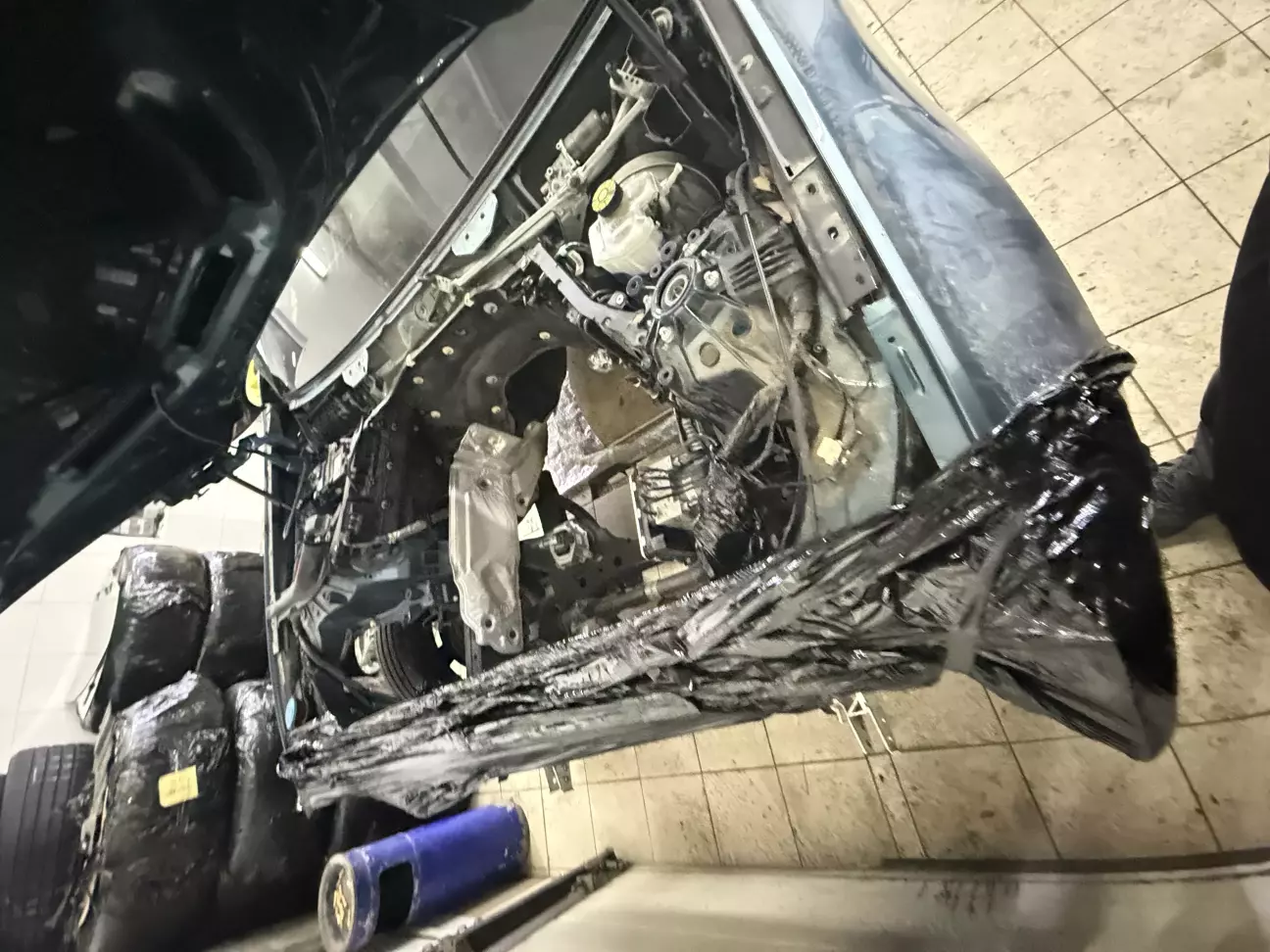 Морду розібрали, принципі із не приємного це лонжерон, в іншому без глобальних вкладень касета радіаторів ціла, всі рідини були на місці. Перед прибуттям машини було також придбано новий піропатрон щоб запустити запишу і перевірити стан двс, там все добре )