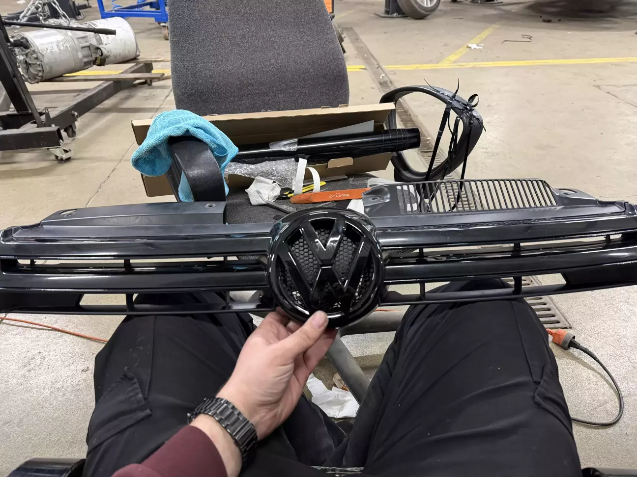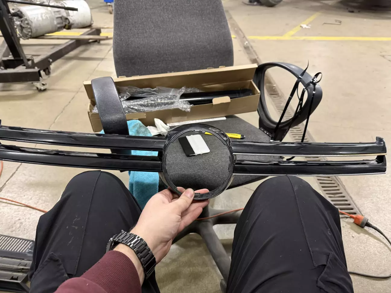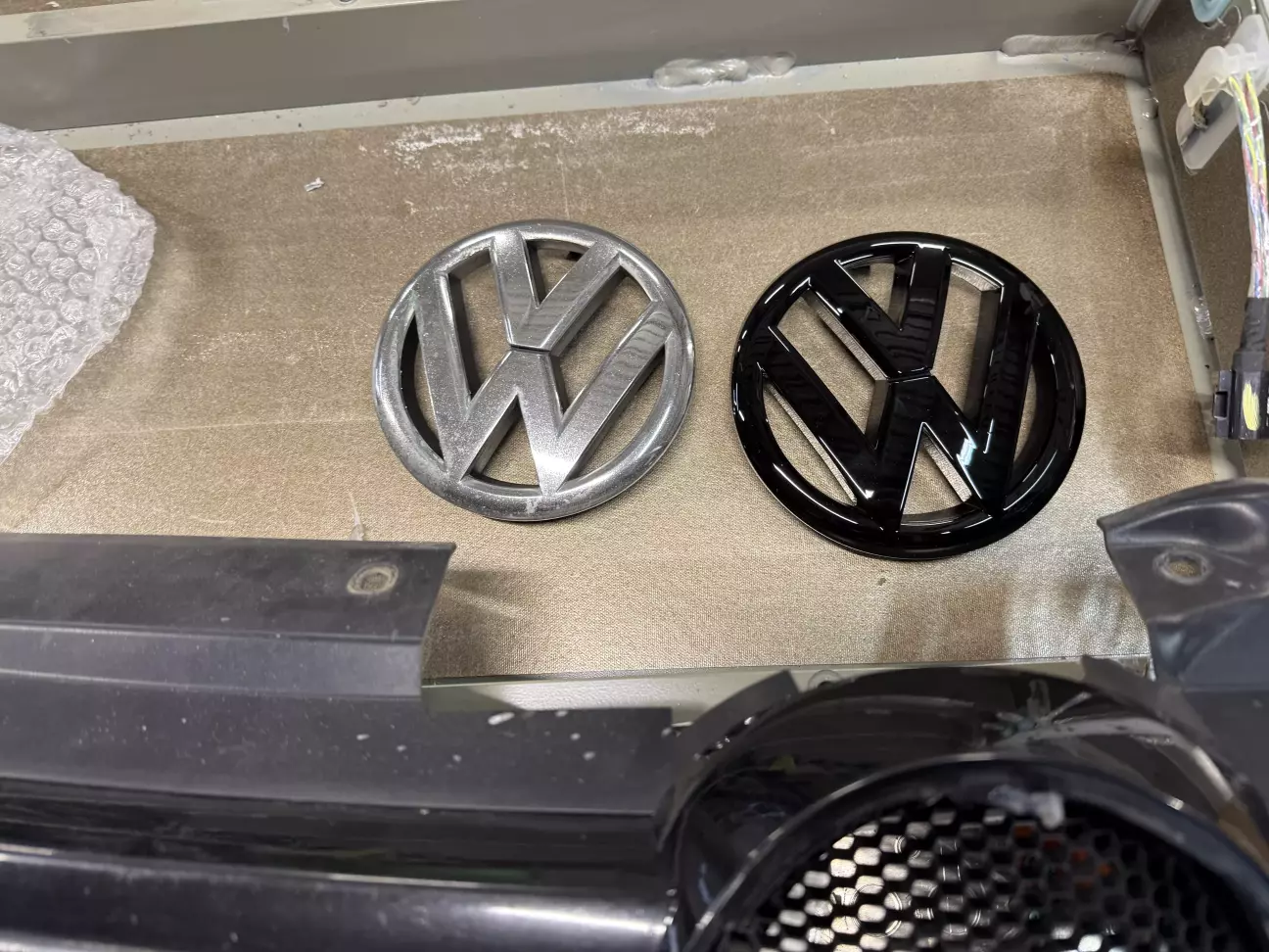 Решено было сделать антихром. Так как нижняя решетка бампера была сломана, как и накладка на туманку, я заказал их новыми, и заказал рулон глянцевой черной пленки 50х150, плюс новый значек в черном глянце.