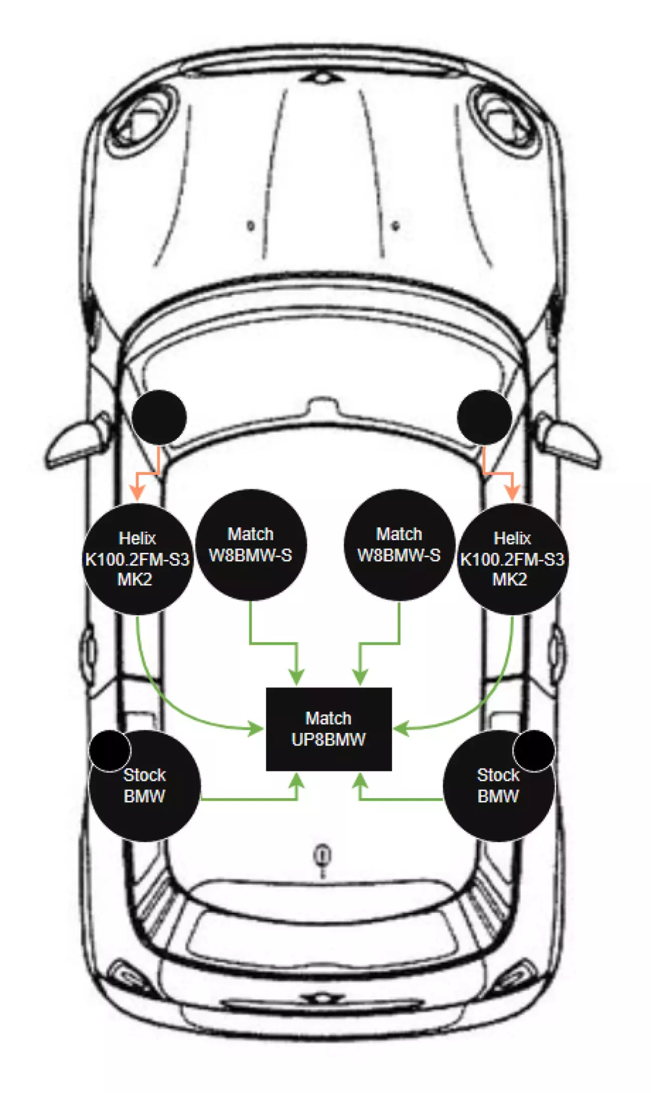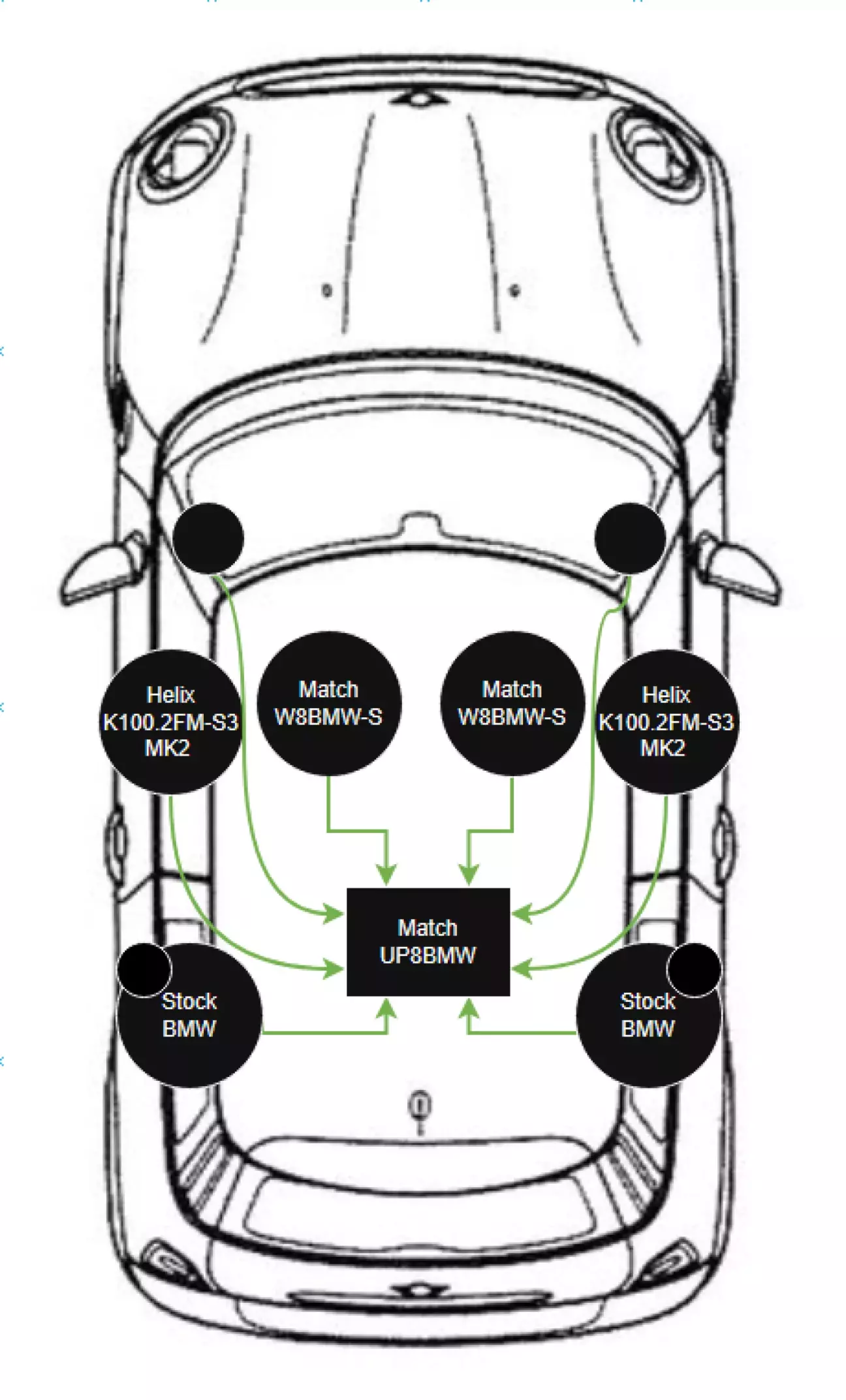 Оскільки в Match UP8BMW (він же UP8DSP) 8 каналів, використовувалось 7, а один ми звільнили - з'явилась можливість підключити твітера поканально. В теорії це дасть більше гнучкості в налаштуванні, потужності і правильного звуку. І забігаючи наперед - в міні це має сенс, бо твітера вже в стійках, а не в дверях, і досить сильно відрізняються по дистанції від СЧ, що впливає на сцену.
