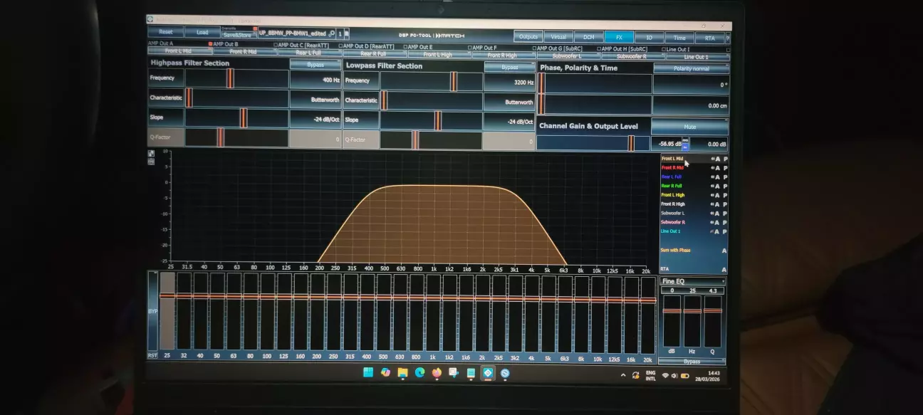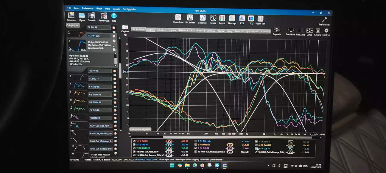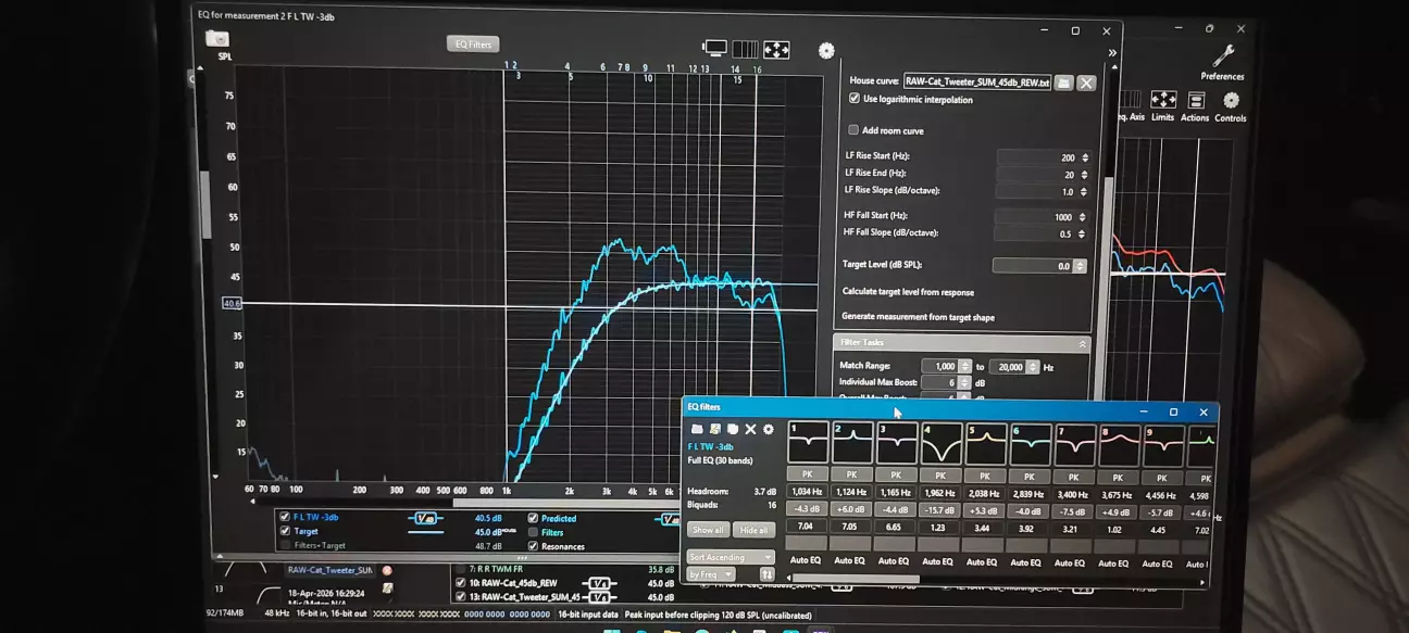Рівнятись треба на найбільш слабку ланку - це передній правий мід і твітери (в моєму випадку). Відштовхуємось від логіки, що енергію ми в 95% випадків прибираємо, а не додаємо, тобто АЧХ динаміка повинна бути на рівні, чи трохи вища за таргет, але звісно не в десятки дБ, бо так ми просто втратимо всю гучність. Тут потрібно повернутись до поняття акустичного кросоверу - якщо ми бачимо, що СЧ починають здуватись на 6кГц, то і "порізати" ми їх можемо будь де. Але для ВЧ не дуже добре грати нижче 2Fs, тому кросовер в кривій я вибрав на 3кГц - це рівень, де їм ще безпечно грати. Щоб цього досягти, в DSP довелось виставити фільтр нижче 3кГц, бо інакше спад не буде таким, як він повинен бути в кривій. Ось це і є різниця між акустичним і електричним кросовером - в DSP (електричний) стоїть на умовних 2500 BW2, а фактично в АЧХ ми бачимо акустичний на 3000 LR4.