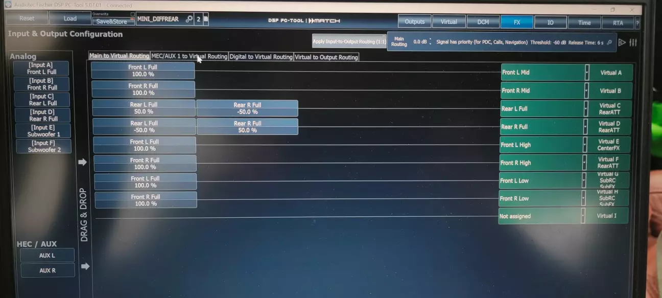 Далі треба розібратись з роутингом - де входи, де виходи, що куди грає. Входів в мене 4, а виходів a little bit більше. Рекомендую дуже уважно передивитись і все виставити, та одразу переконфігурувати дефолтні назви, бо я декілька разів давав в штангу і виявляв, що в мене правий задній вхід грає в лівий передній твіттер. Звісно, виявляв я це вже на замірах і доводилось робити все трохи не спочатку.