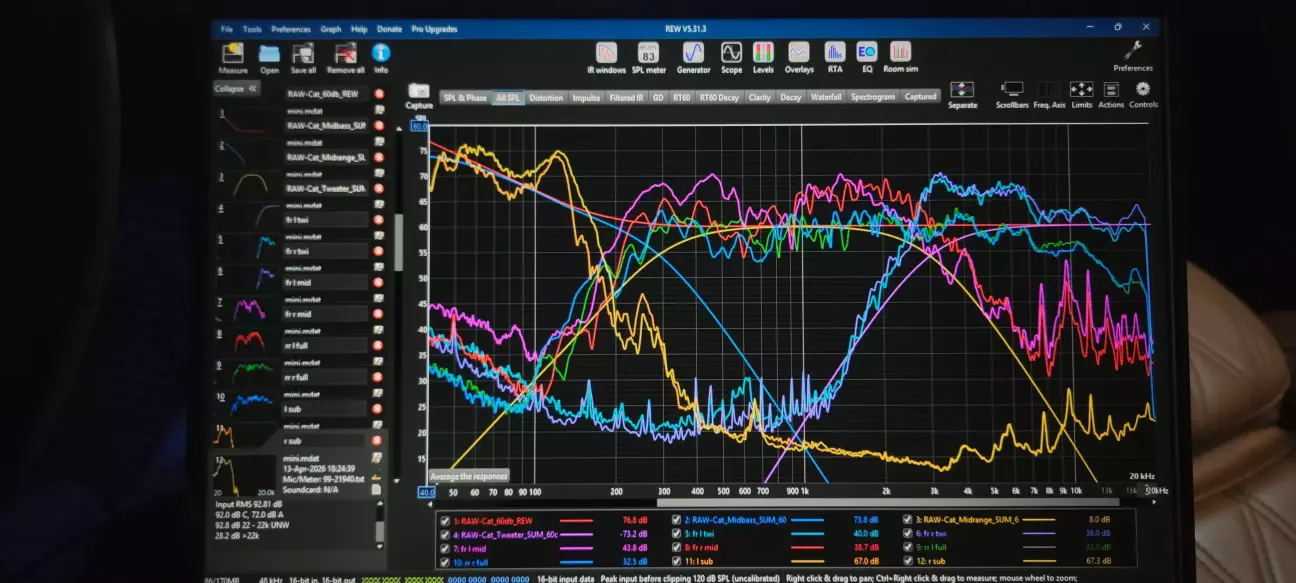 Починати є сенс з твітерів - вони будуть грати приблизно з вашої 2*Fs і до 20кГц без фільтру. Вмикаємо лівий твітер в DSP, вмикаємо Real Time Analyzer в REW, вмикаємо рожевий шум і починаємо водити мікрофоном від вуха до вуха (Moving Microphone Method), поки АЧХ не зробиться стабільною (десь 100 averages). Далі вимикаємо твітер, і вмикаємо лівий СЧ - на ньому нижній зріз буде 2Fs, а верхній також 20кГц без фільтру - так ми побачимо природній спад СЧ. Повторюємо процедуру з кожним окремим динаміком і маємо таку картину, на якій я перебздів з мідбасом і спочатку орієнтувався на рекомендації виробника, де було сказано Lowpass: Butterworth; 24 dB/octave; crossover frequency 80 - 100 Hz.