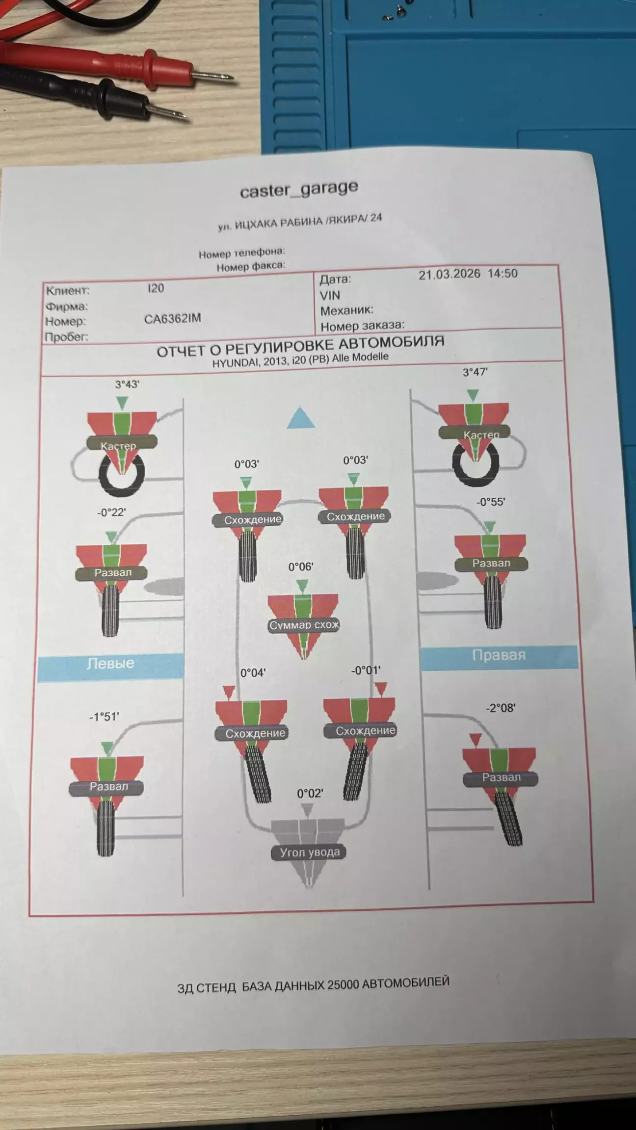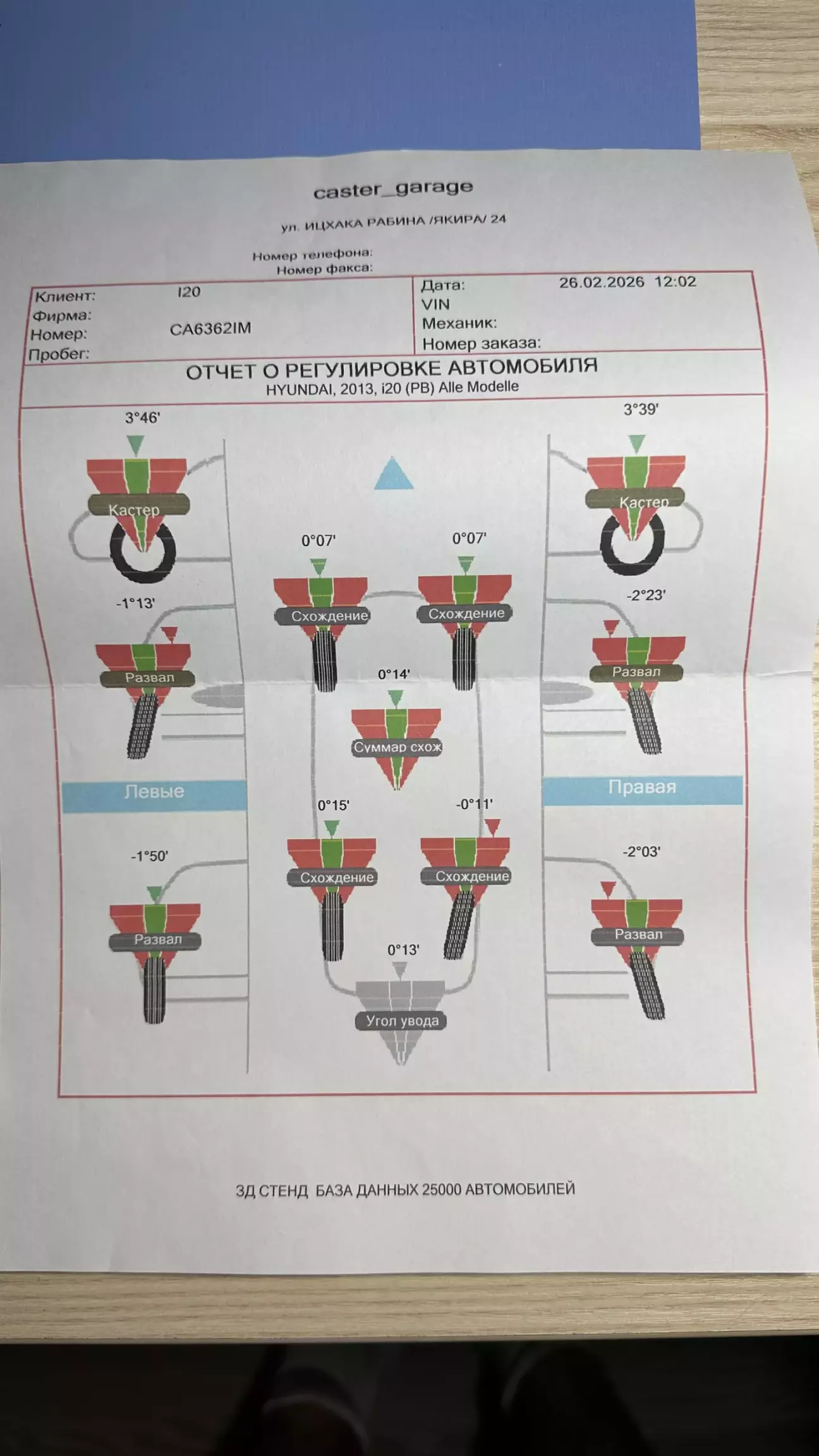 Поехал далее на развал-схождение. Результаты в допустимой норме. Колеса теперь передние не домиком 😁