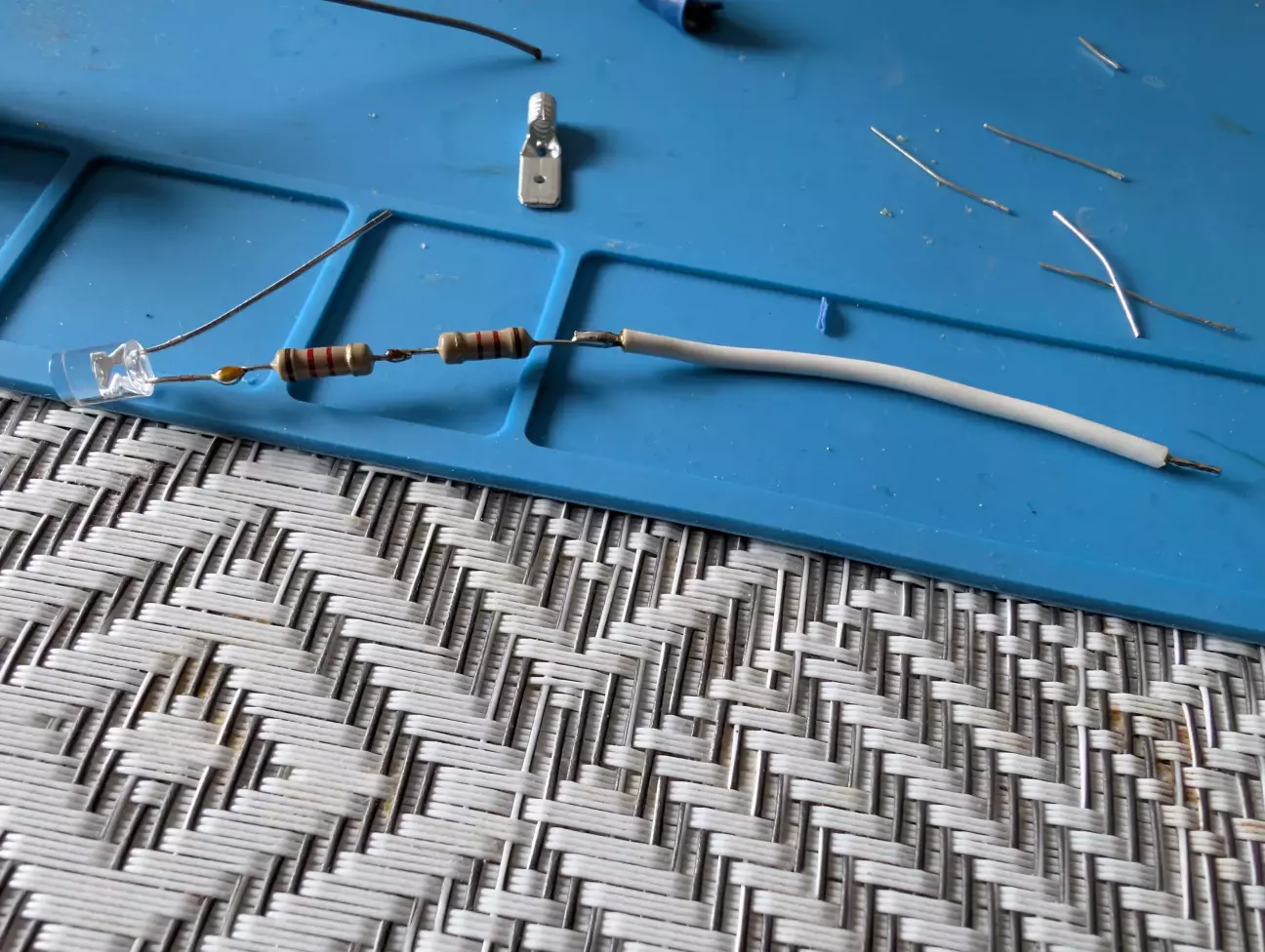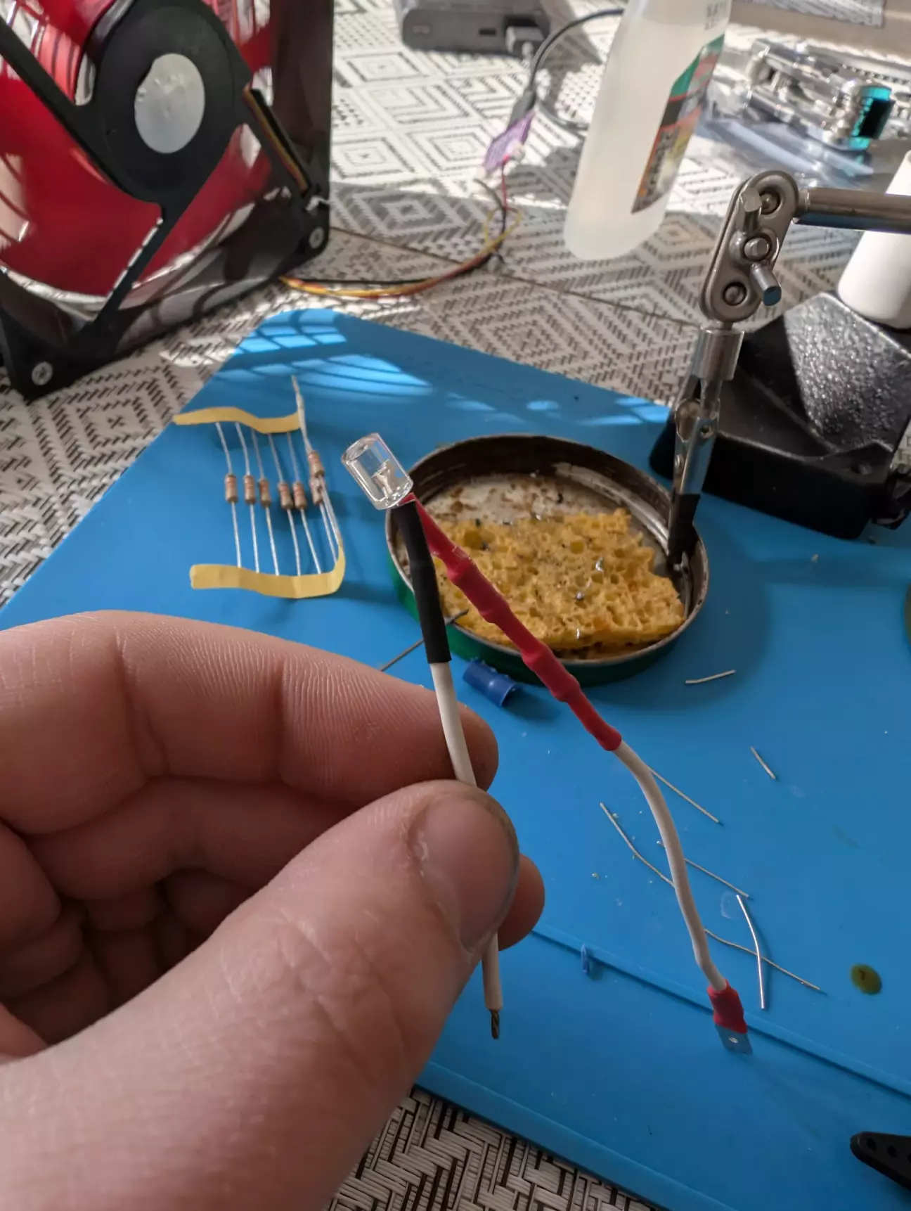 По правильному вистачає одного резистора на такий світодіод але під час тестів виявилось що він досить сильно світить :)