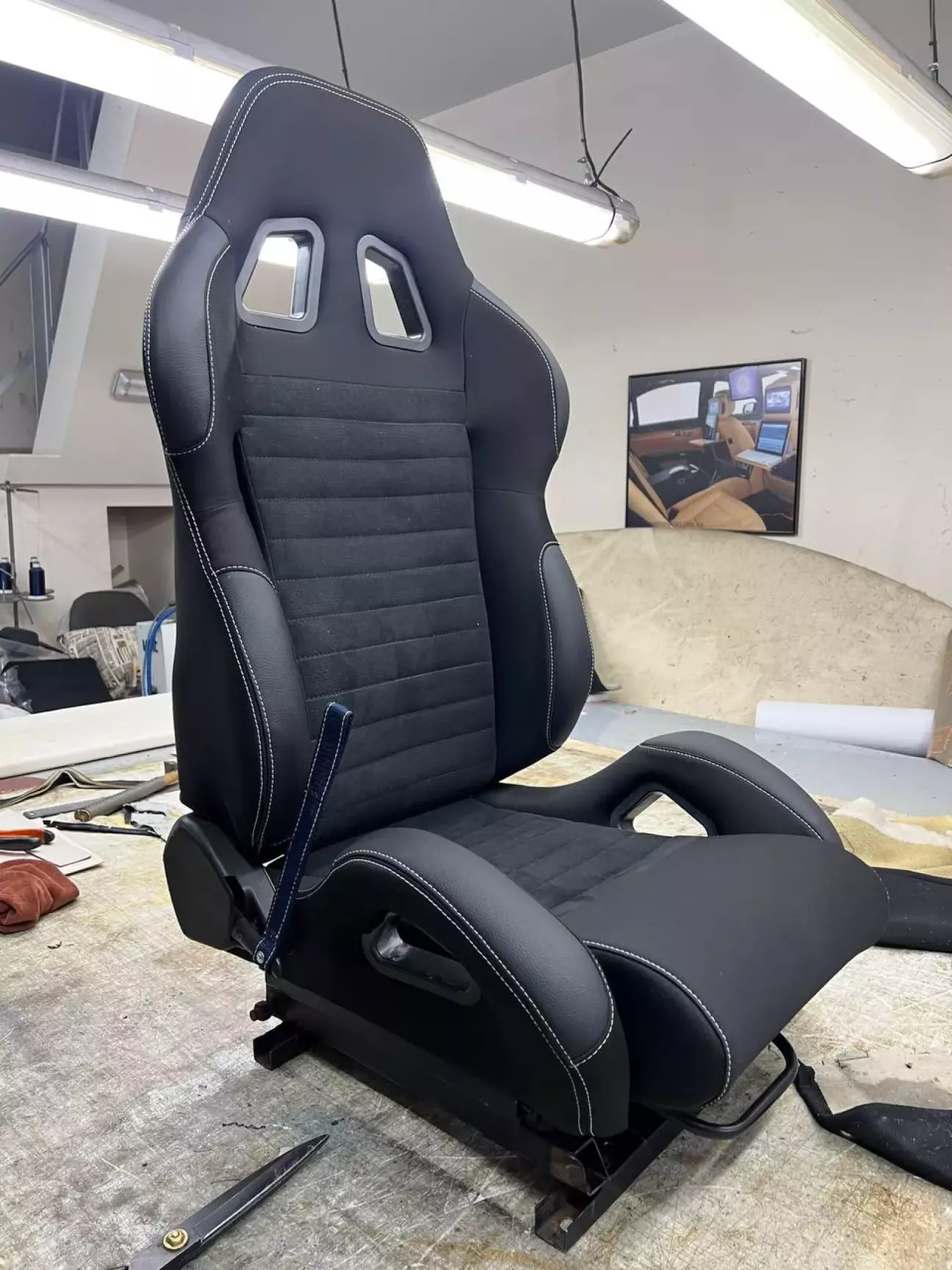 В чора ввечері забрав сідушку з перешива. Відчува вау ефект від до після - стала значно краще не впізнати. Паралон просижений реставровано. Центральна частина зроблена з перфорованої алькантари, основна частина - тканина, і на місцях підвищеного тертя екошкіра. Також нитку для прошиву обрав білу, щоб відповідала іншим сідушкам. Пасажирська як я писав раніше в мене перешита в алькантару+шкіру. По вазі ця сідушка+кріплення від 1320 Перформенс важить 18 кг. А стокова капець важка - я думаю всі 30 кг там є, я не зважував її але вона дуже важка. Нова сідушка виглядає непогано, але тепер я почав думати про 5-точечні ремені😁