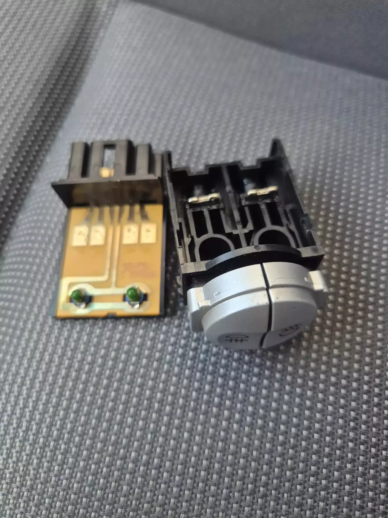 Виявилось, що підсвітка у кнопці не працює, доводилось натискати навпомацки, поки не придбав 2 зелених світлодіоди 3мм 12V.