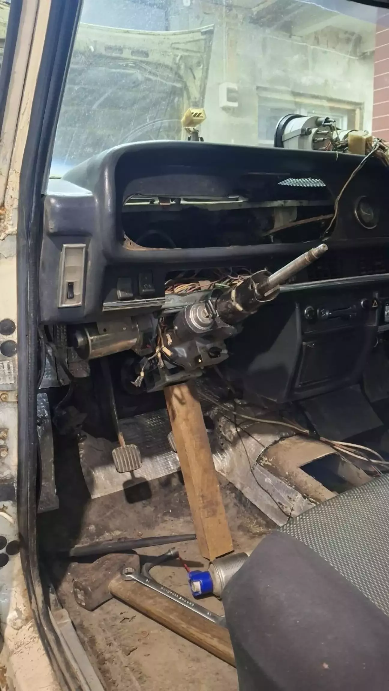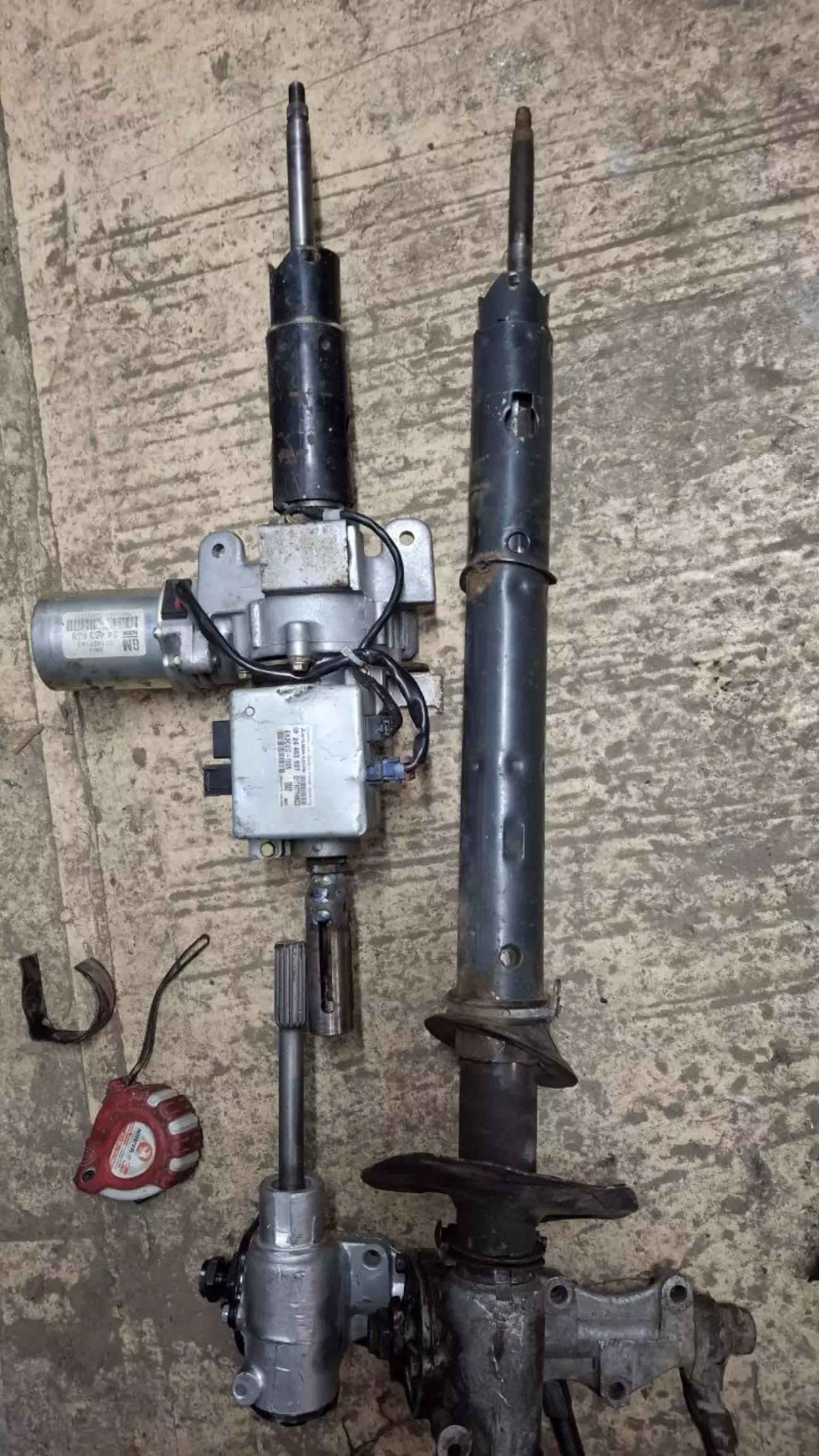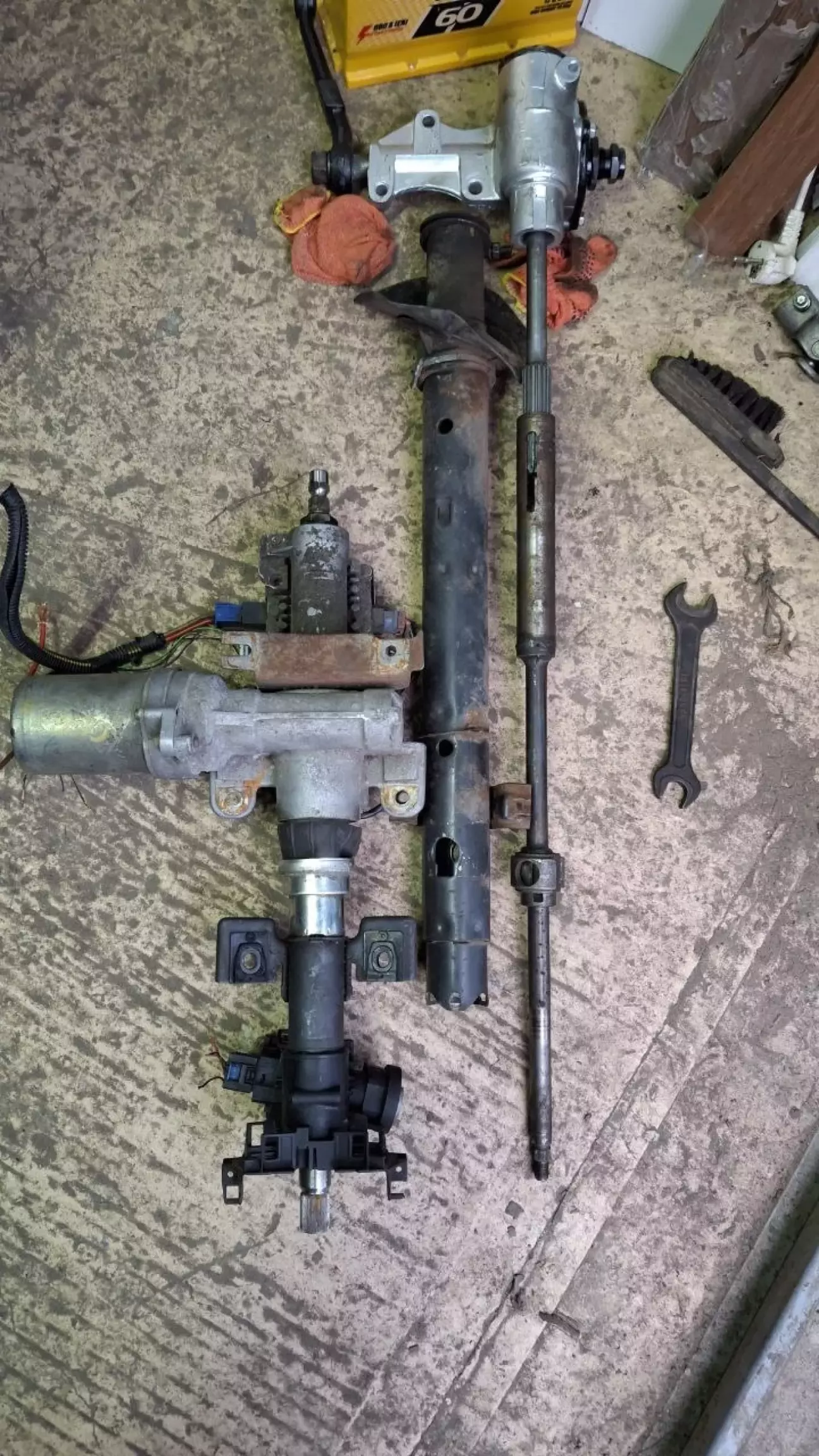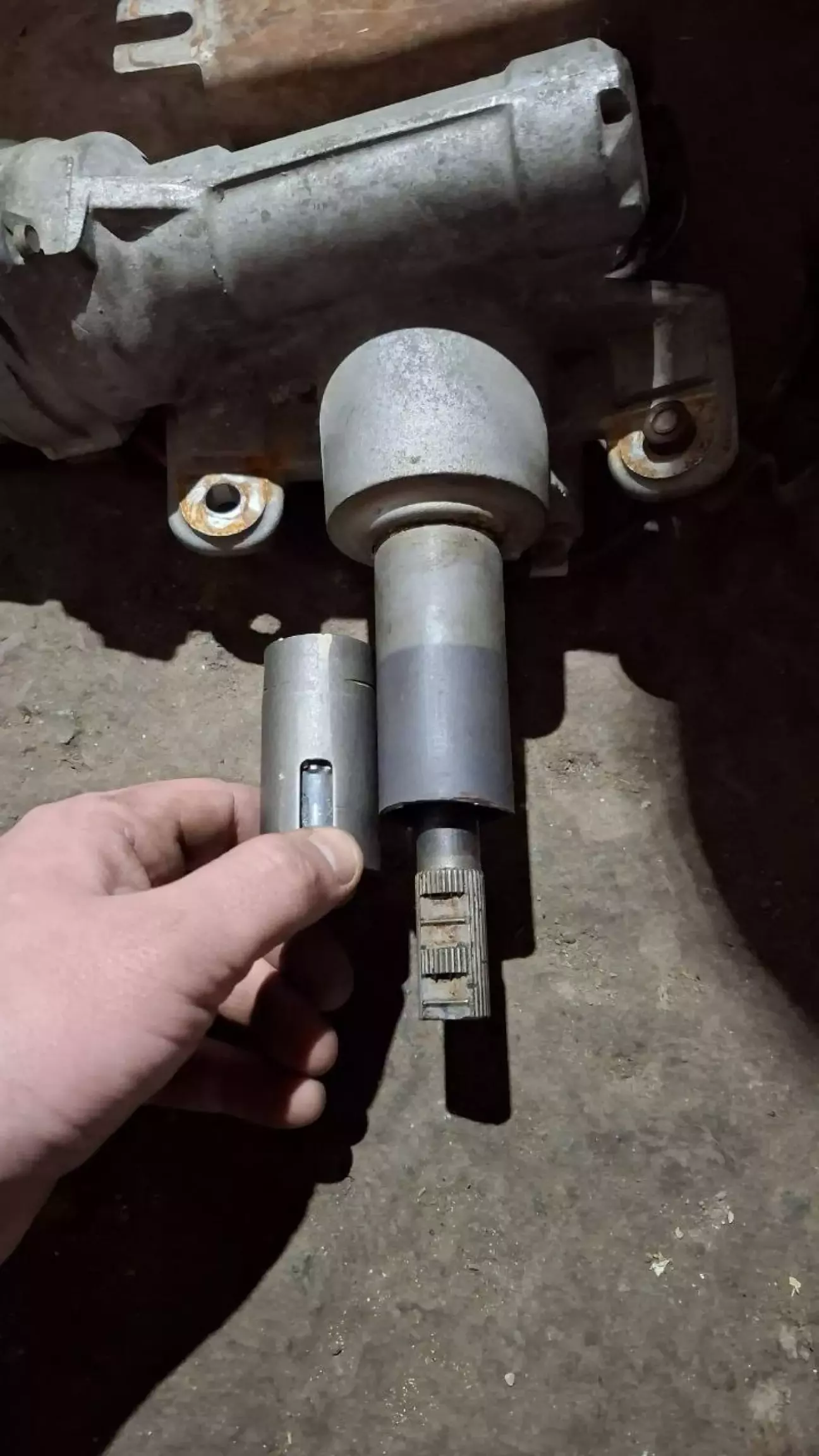 Зібрав стару кермову колонку і приклав підсилювач для розуміння на скільки потрібно підрізати вал кермового редуктора. Щоб вал підсилювача при встановлення в нього не вперся всередині шліцевого з'єднання.